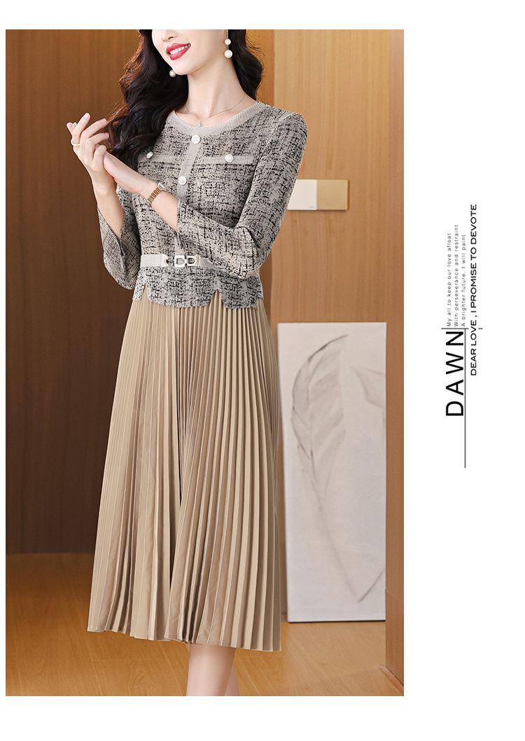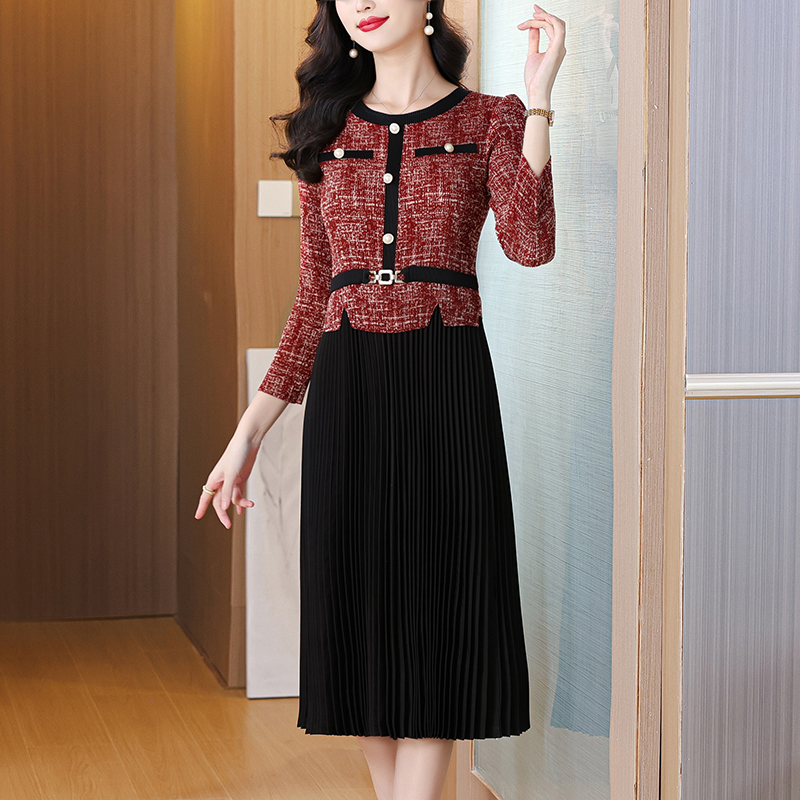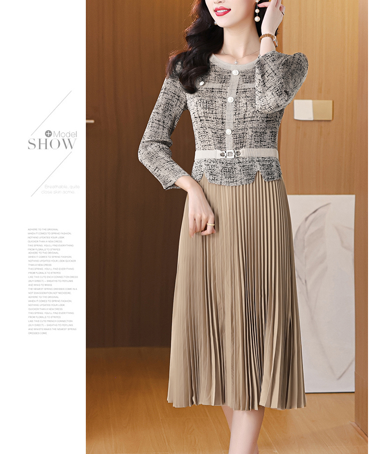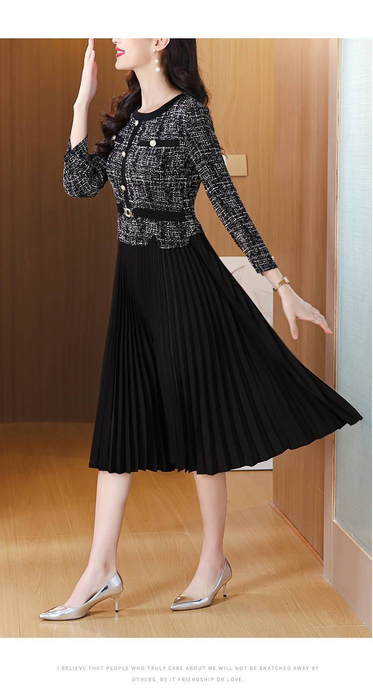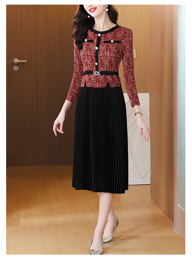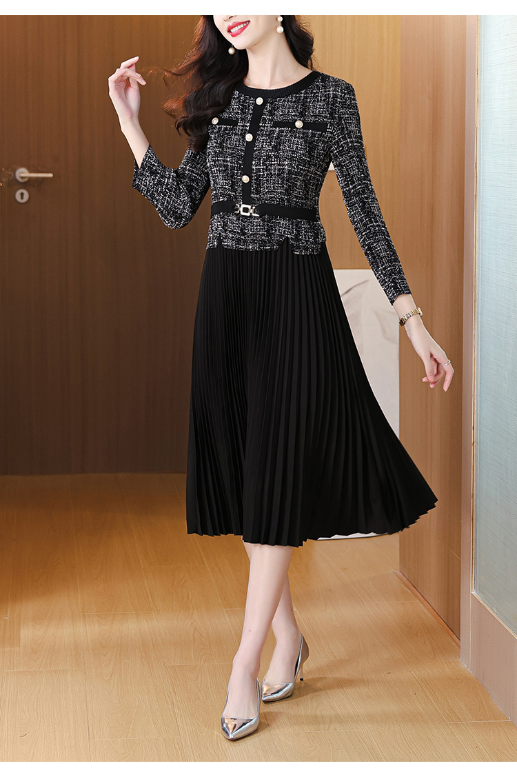 MY15705# 欧洲站新款时尚褶皱圆领拼接修身显瘦连衣裙中长款百褶裙女裝貨源服裝批發