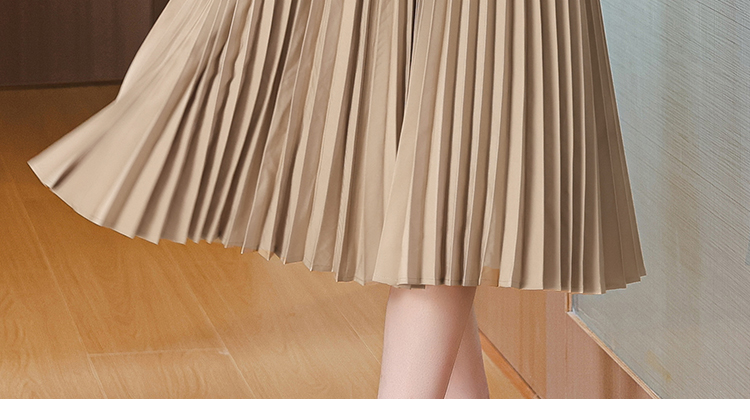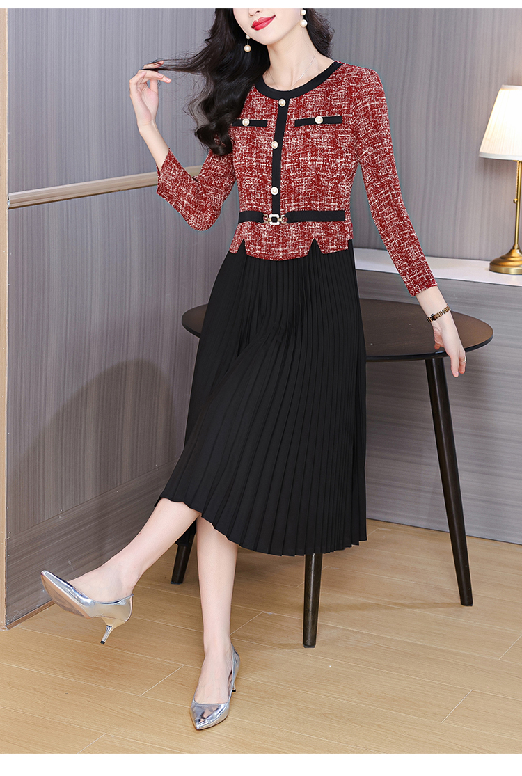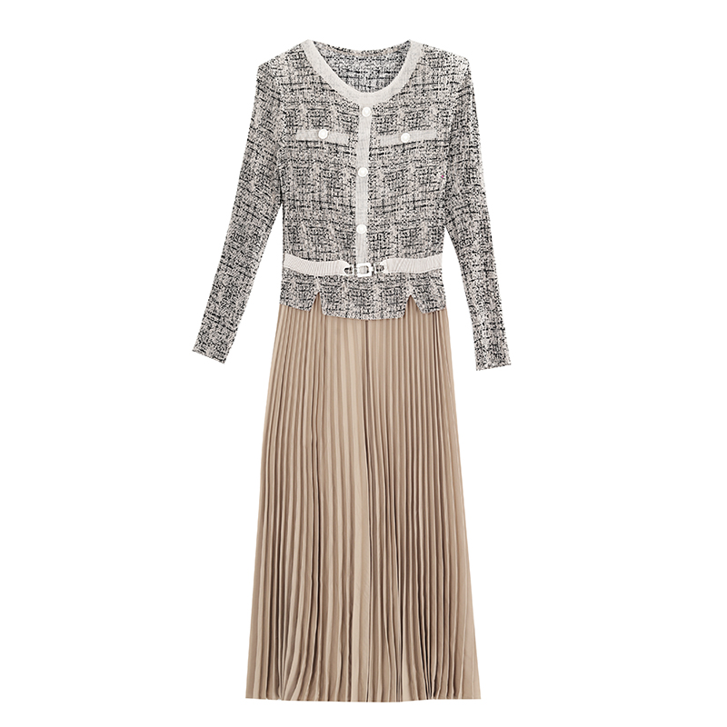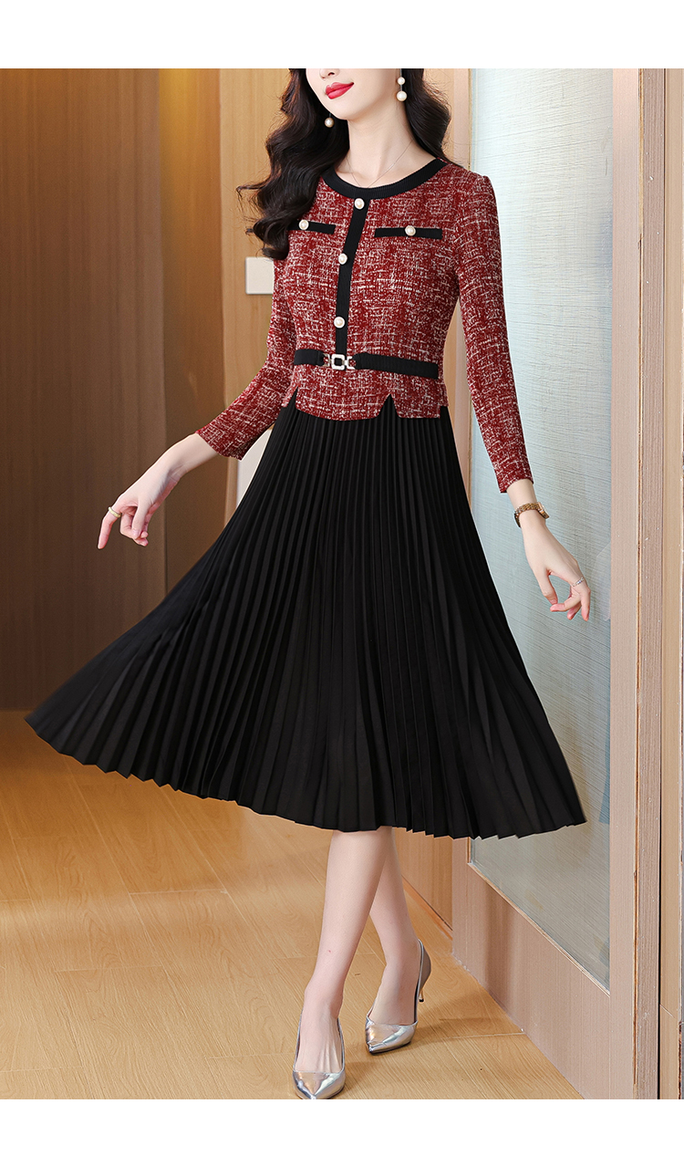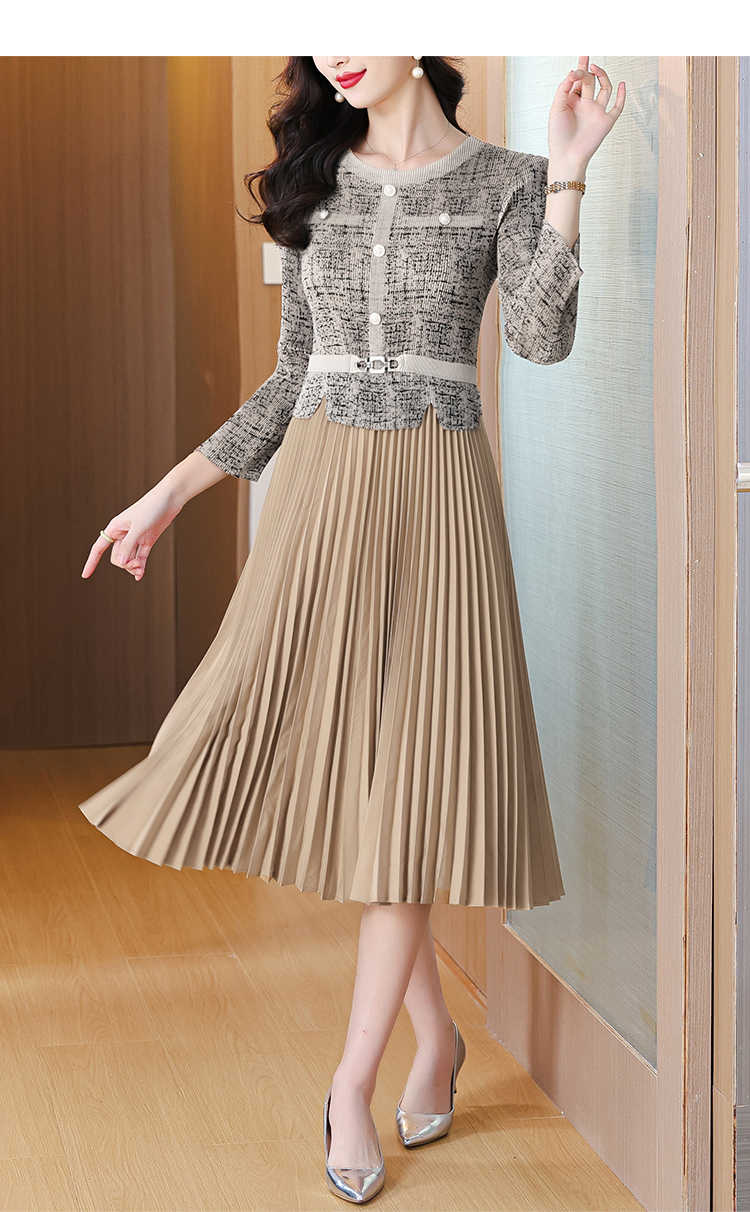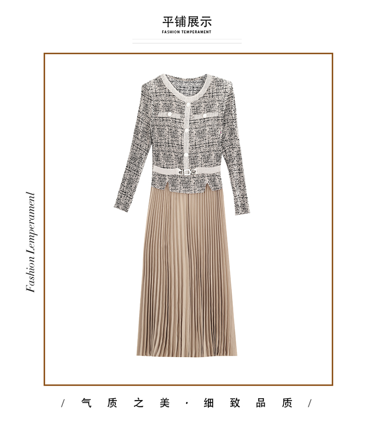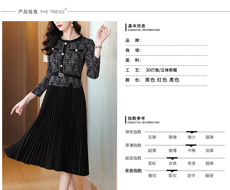 MY15705# 欧洲站新款时尚褶皱圆领拼接修身显瘦连衣裙中长款百褶裙女裝貨源服裝批發