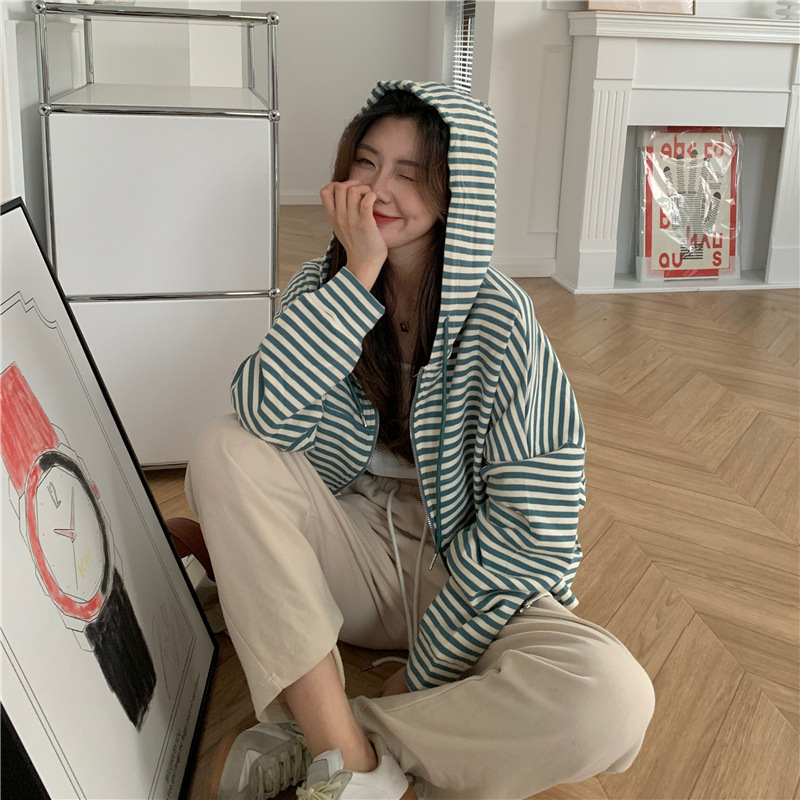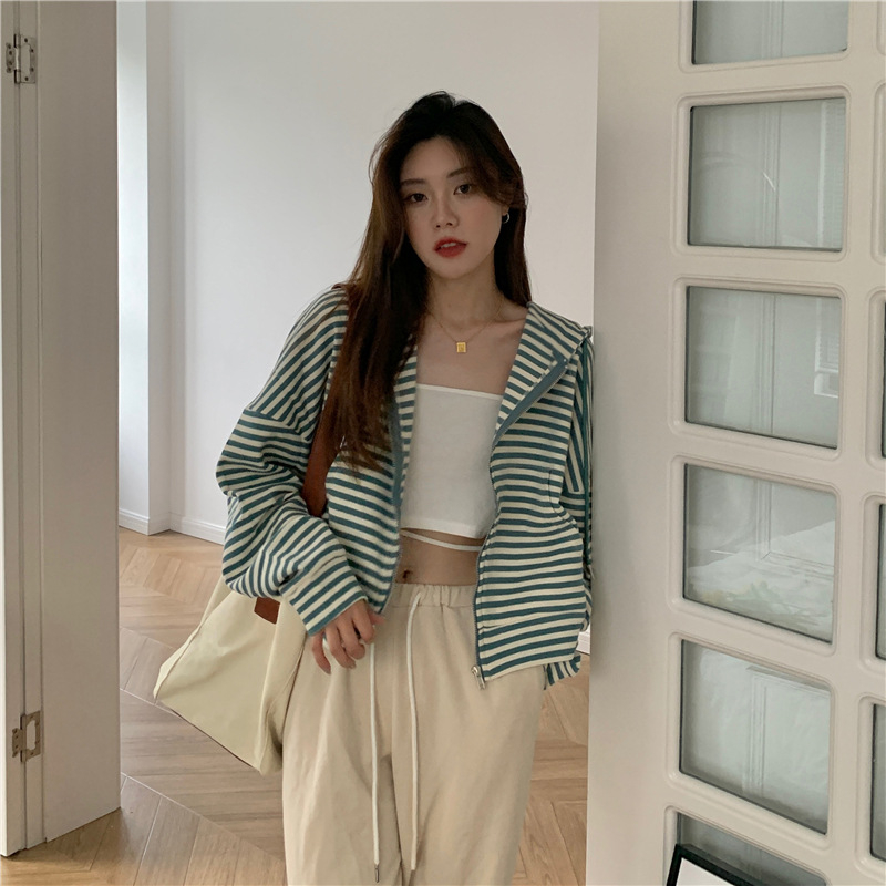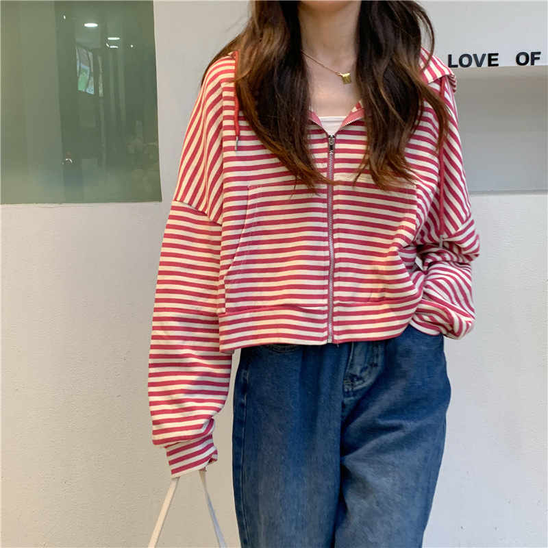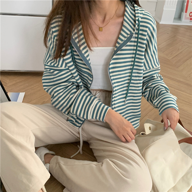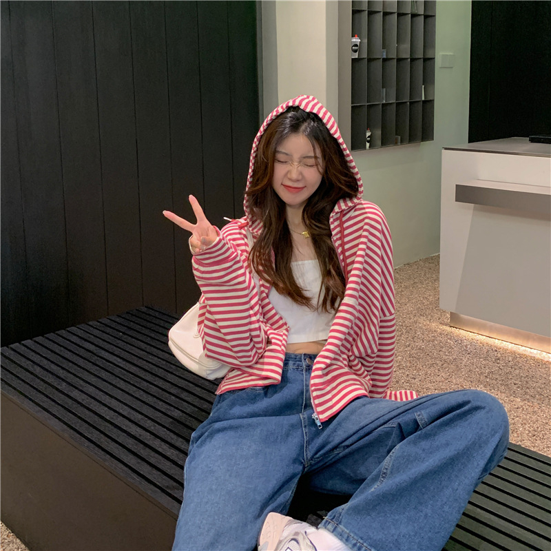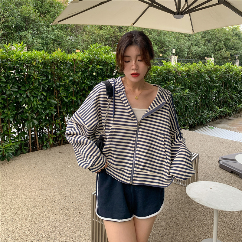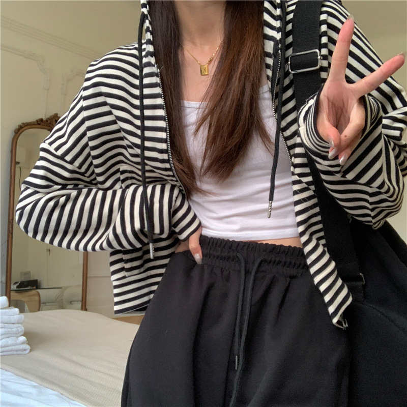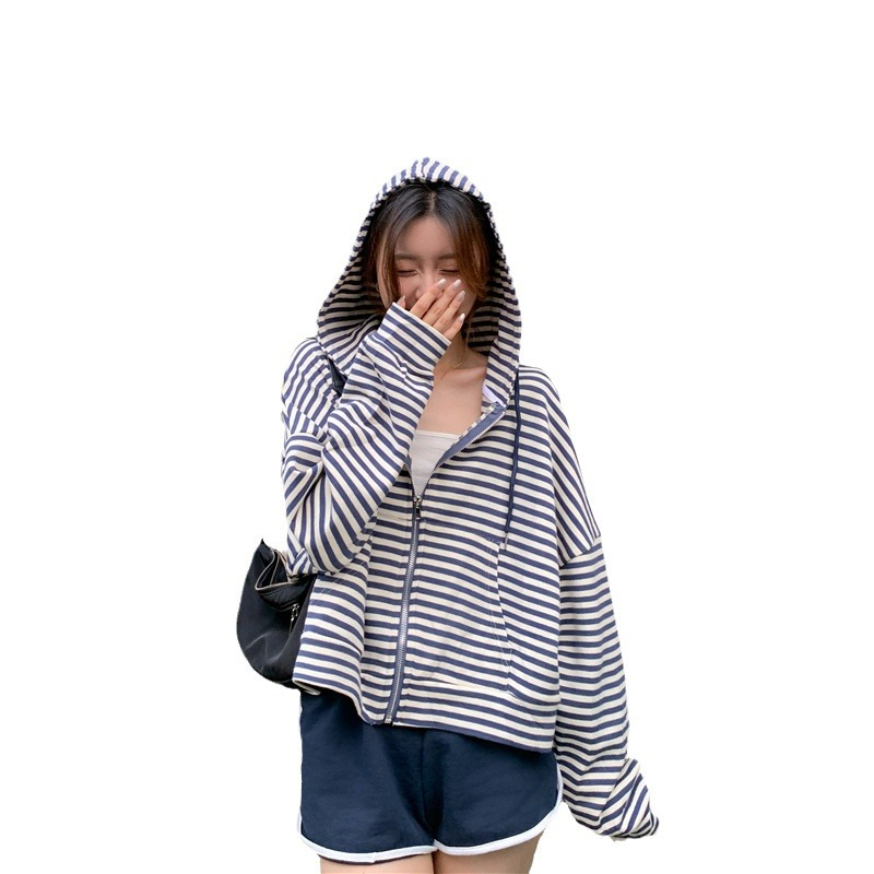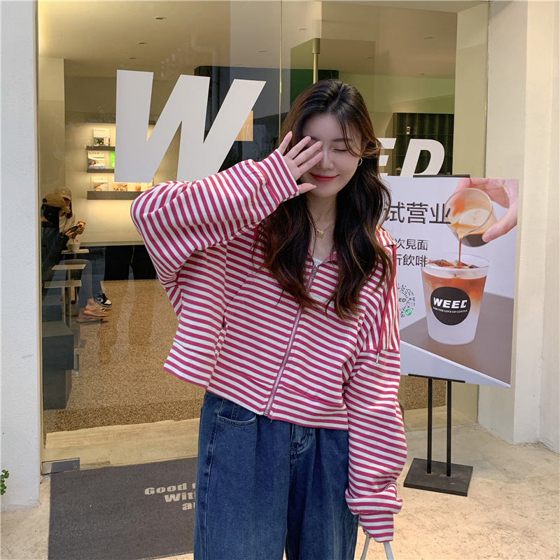 MY15714# 韩国外贸韩版鱼鳞条纹薄款拉链外套女春装女宽松长袖短款百搭上衣女裝貨源服裝批發