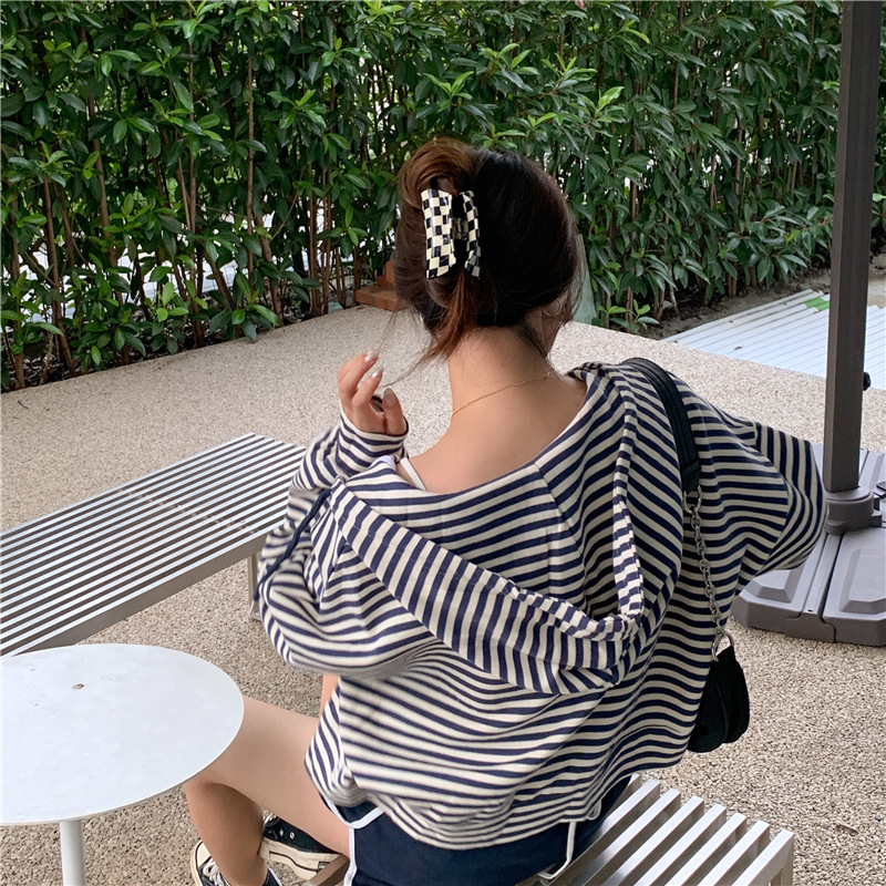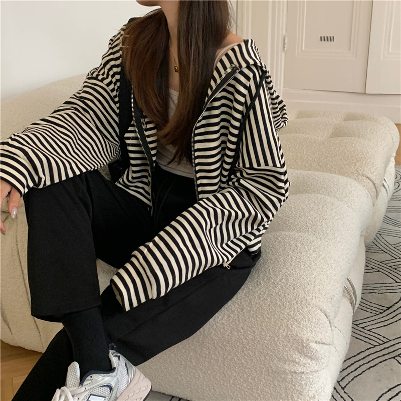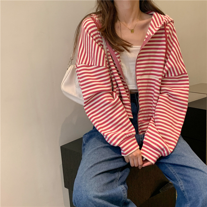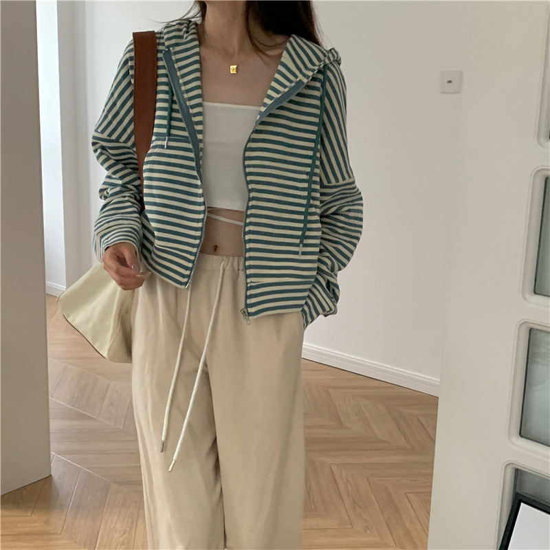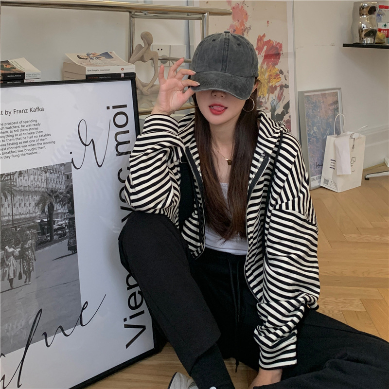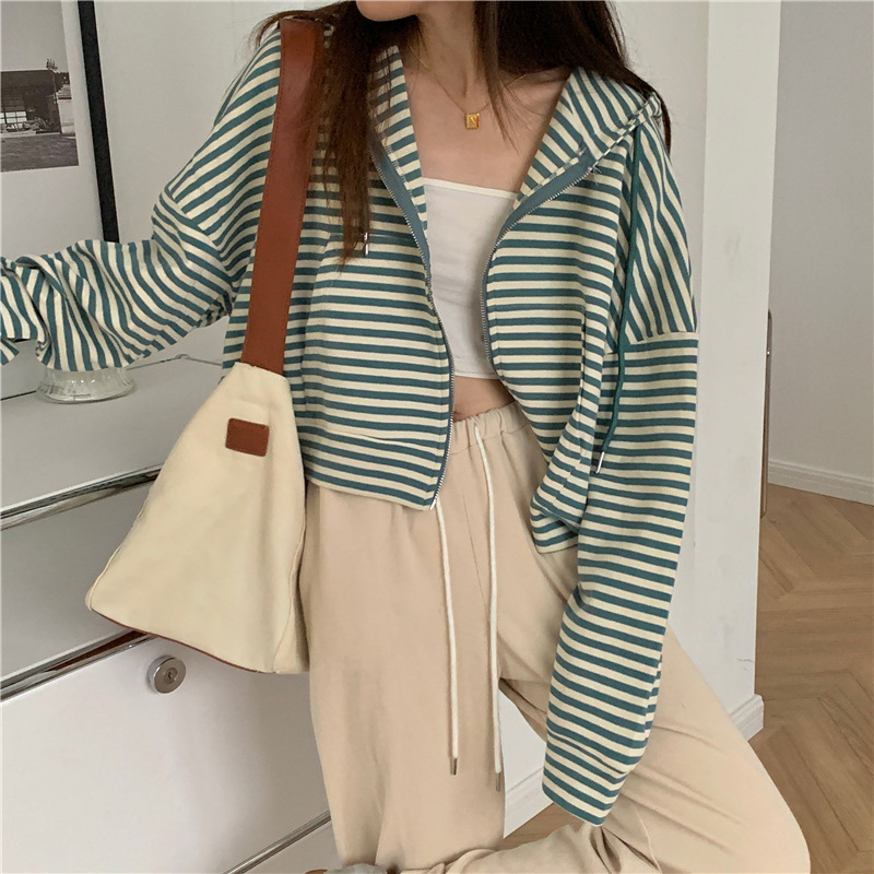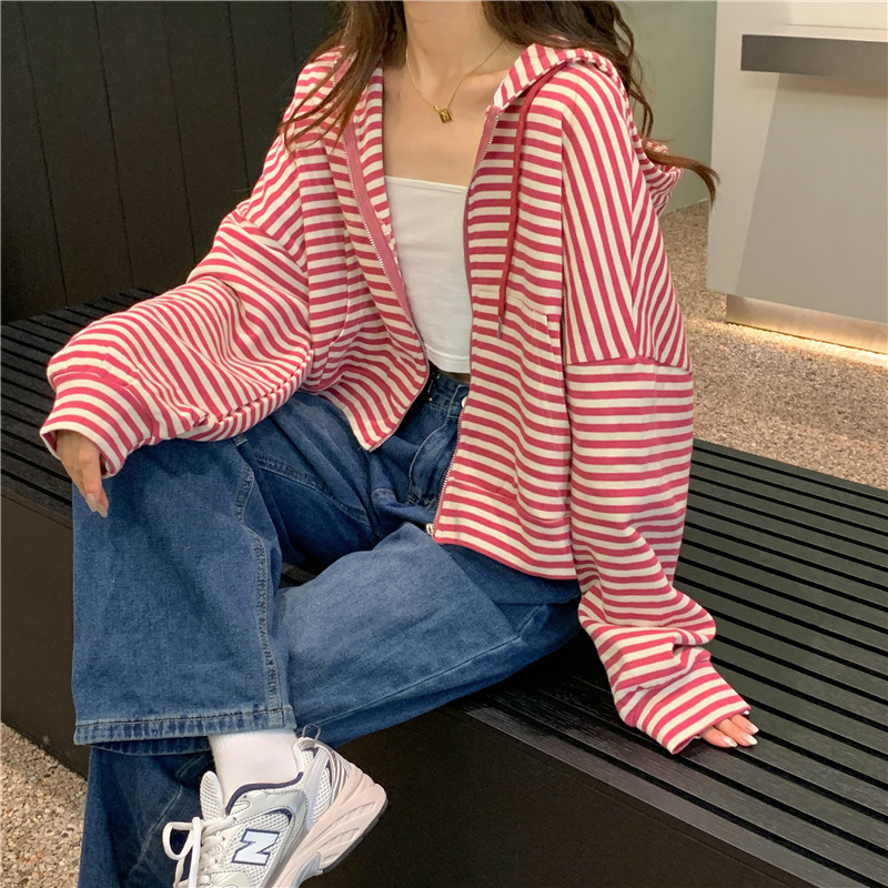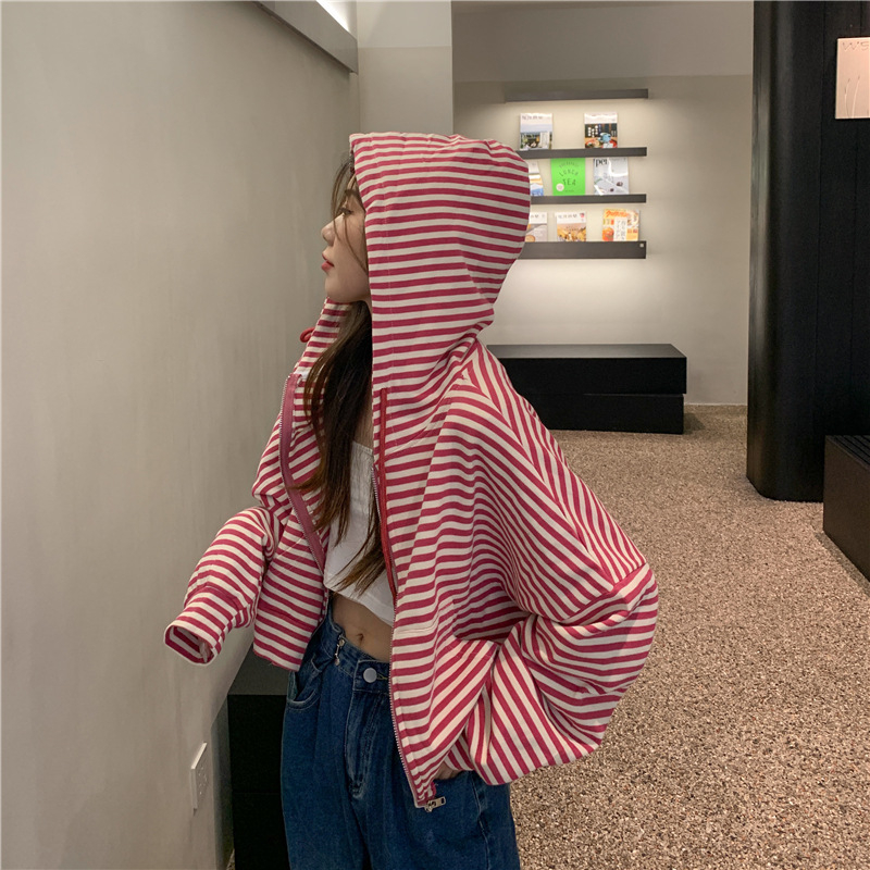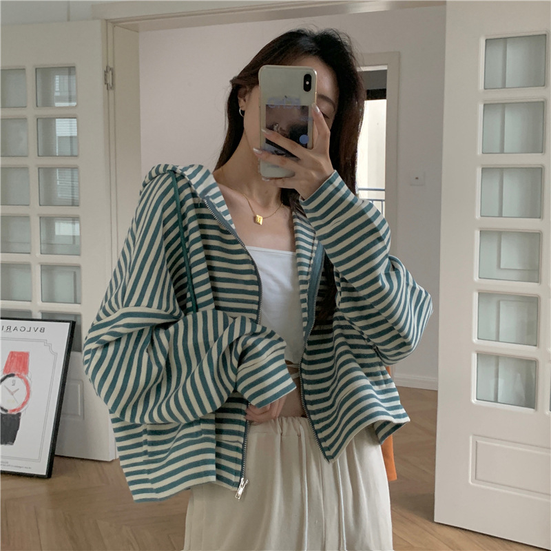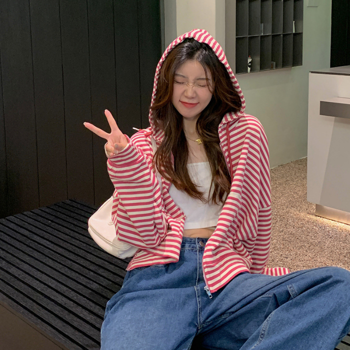 MY15714# 韩国外贸韩版鱼鳞条纹薄款拉链外套女春装女宽松长袖短款百搭上衣女裝貨源服裝批發