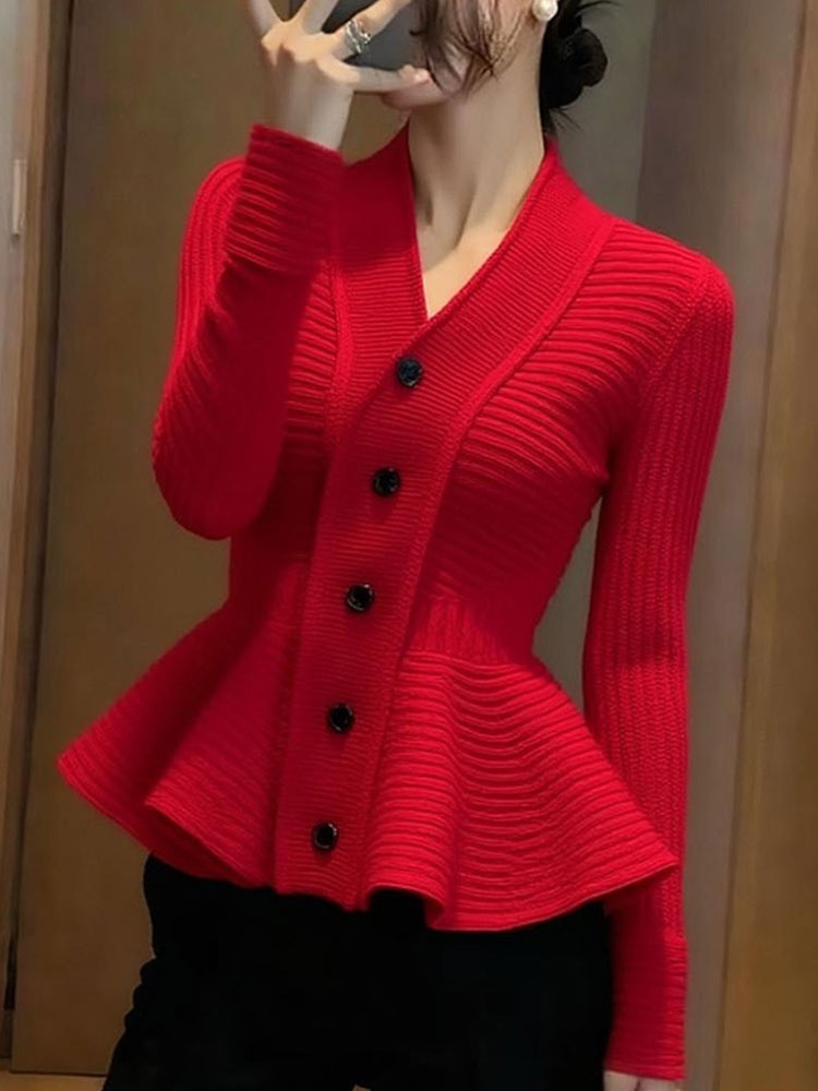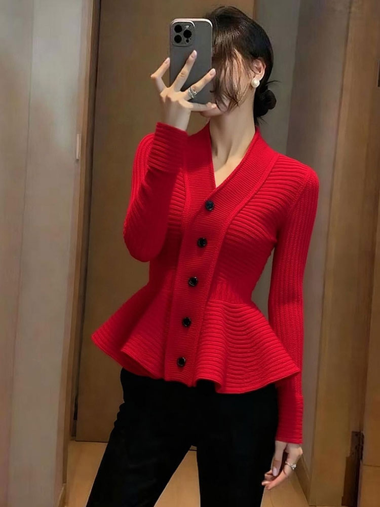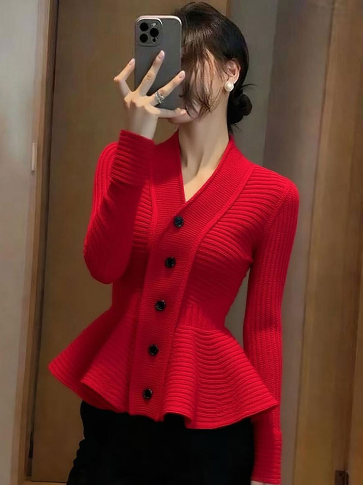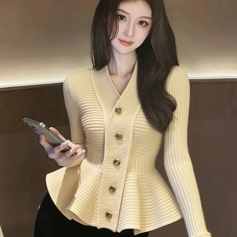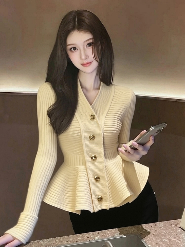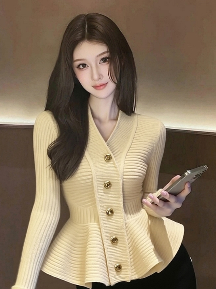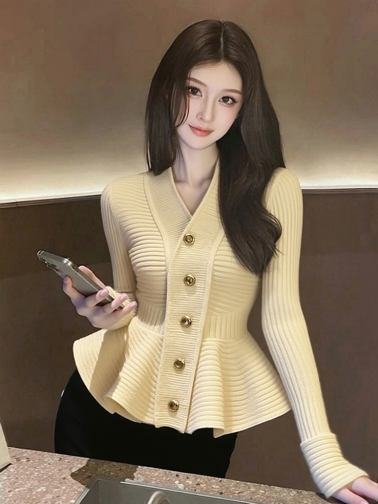 MY15727# 气质名媛巨好看时髦洋气收腰上衣高级感杏色荷叶边针织毛衣女秋冬女裝貨源服裝批發
