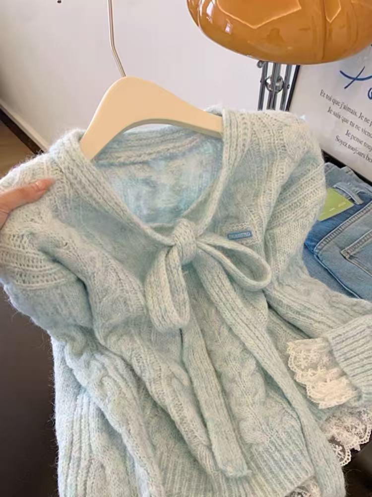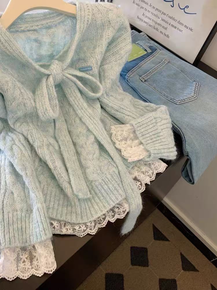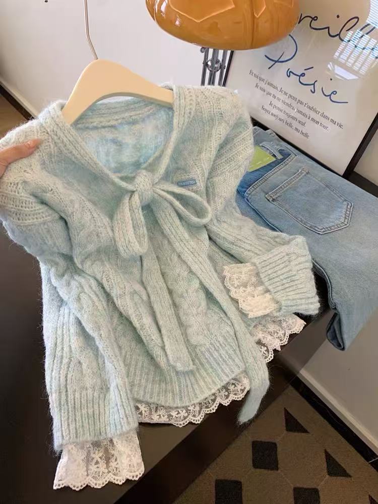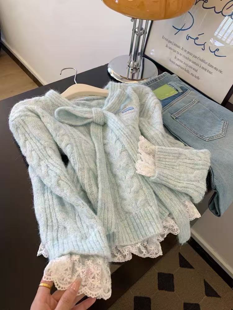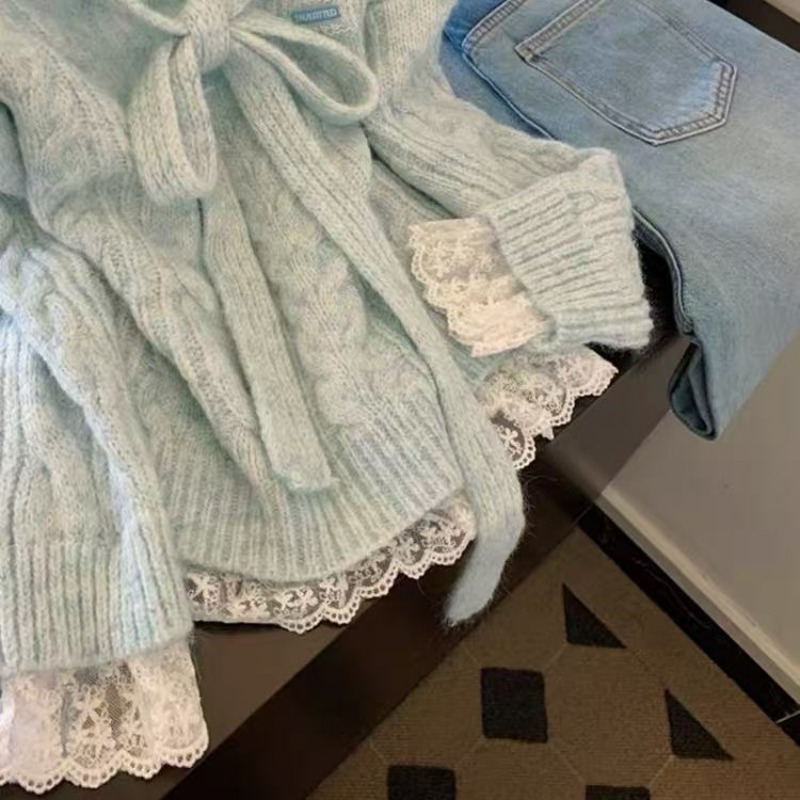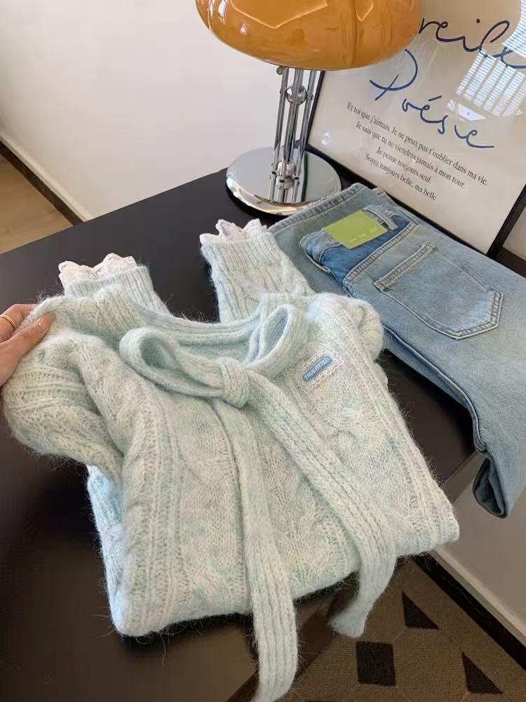 MY15735# 小香风蕾丝下摆假两件套头长袖麻花毛衣女士设计感小众针织衫上衣女裝貨源服裝批發