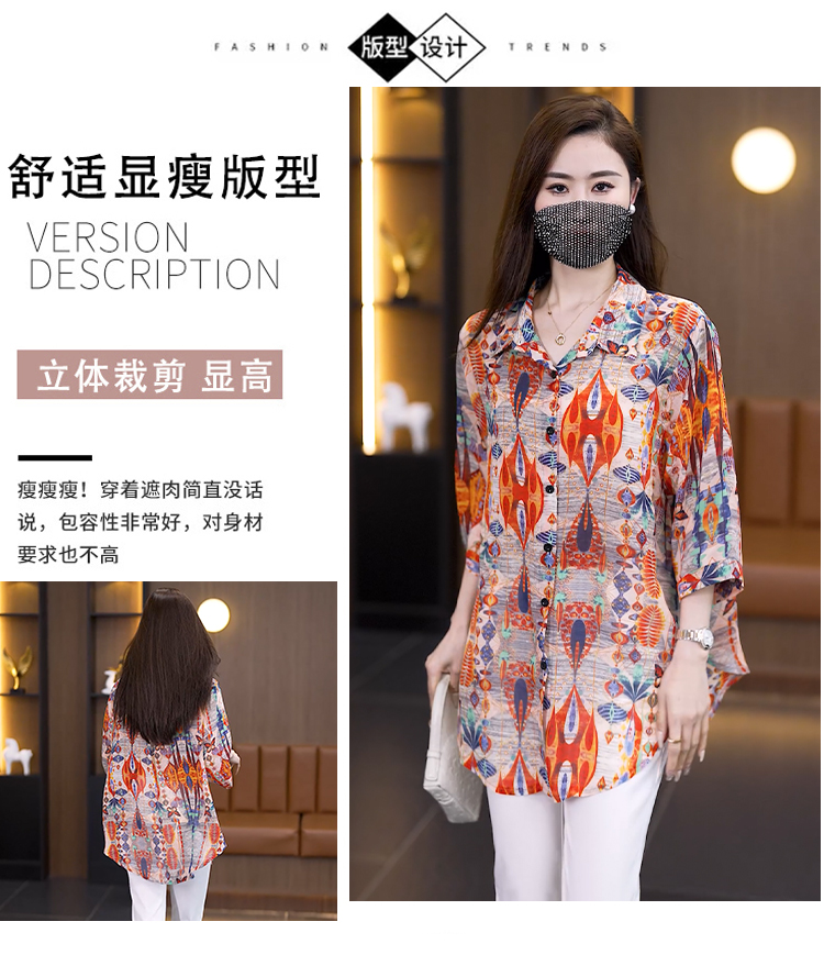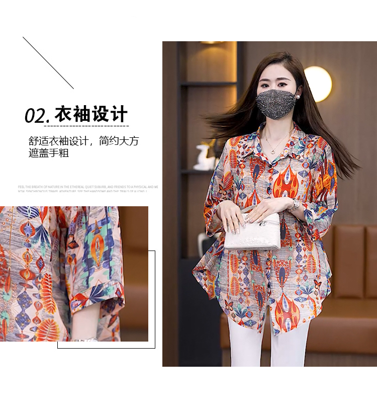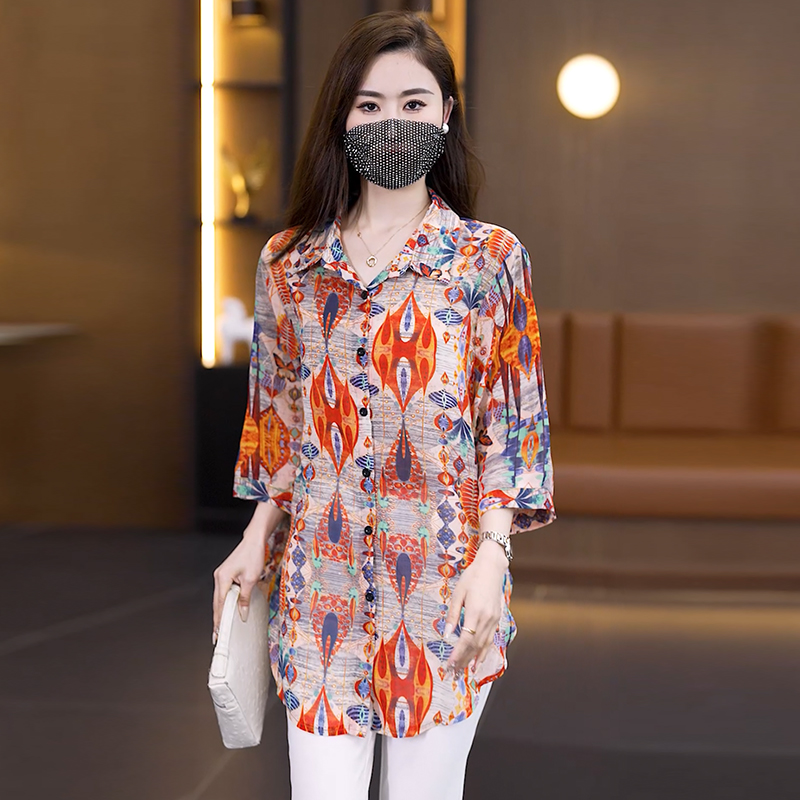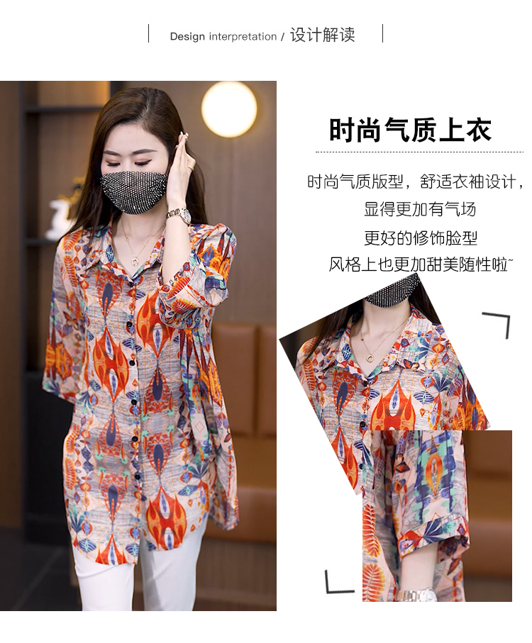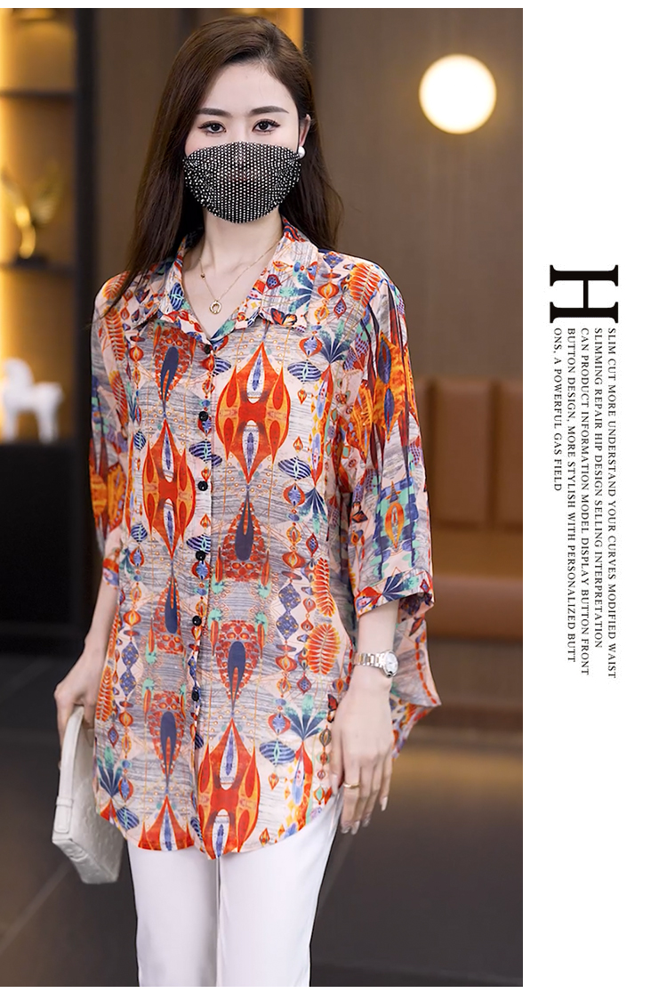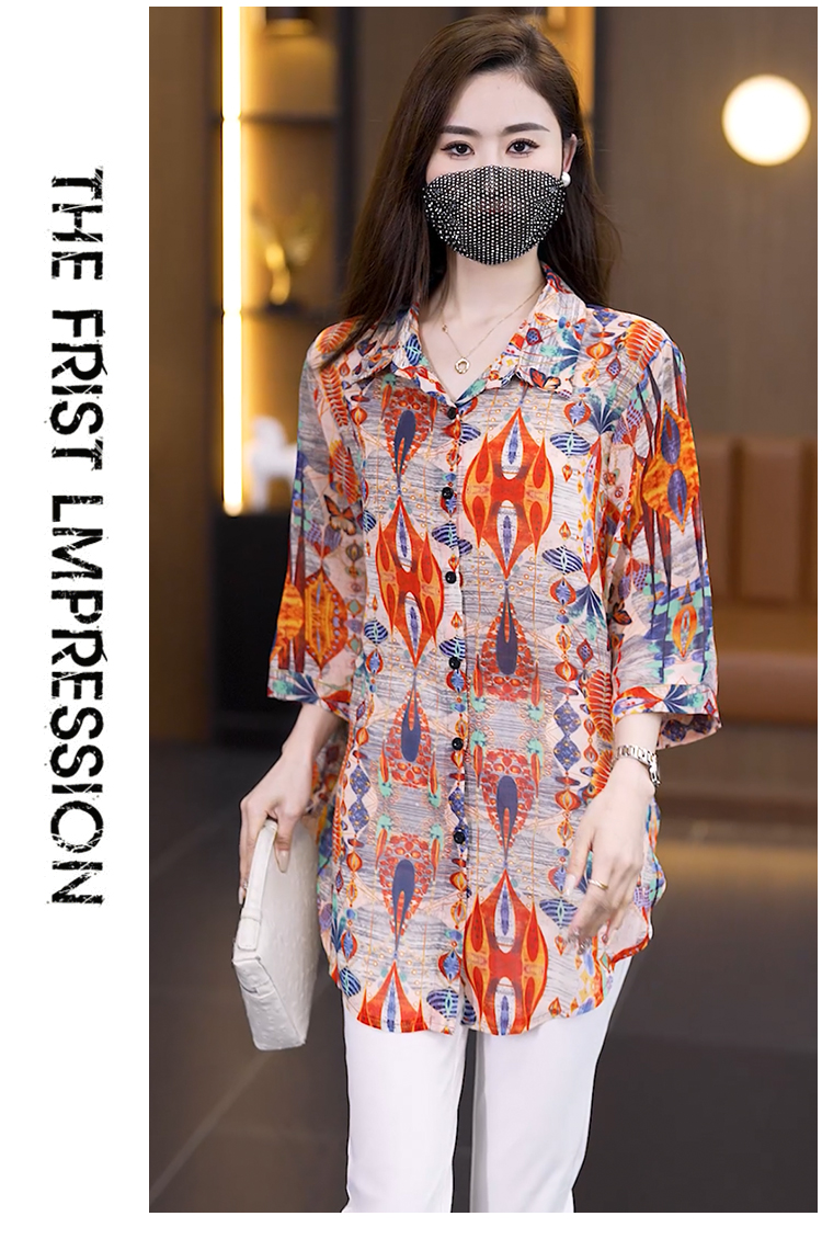 BY9185#花色宽松中长款衬衫女士夏季薄款复古印花开衫女