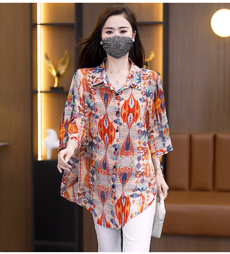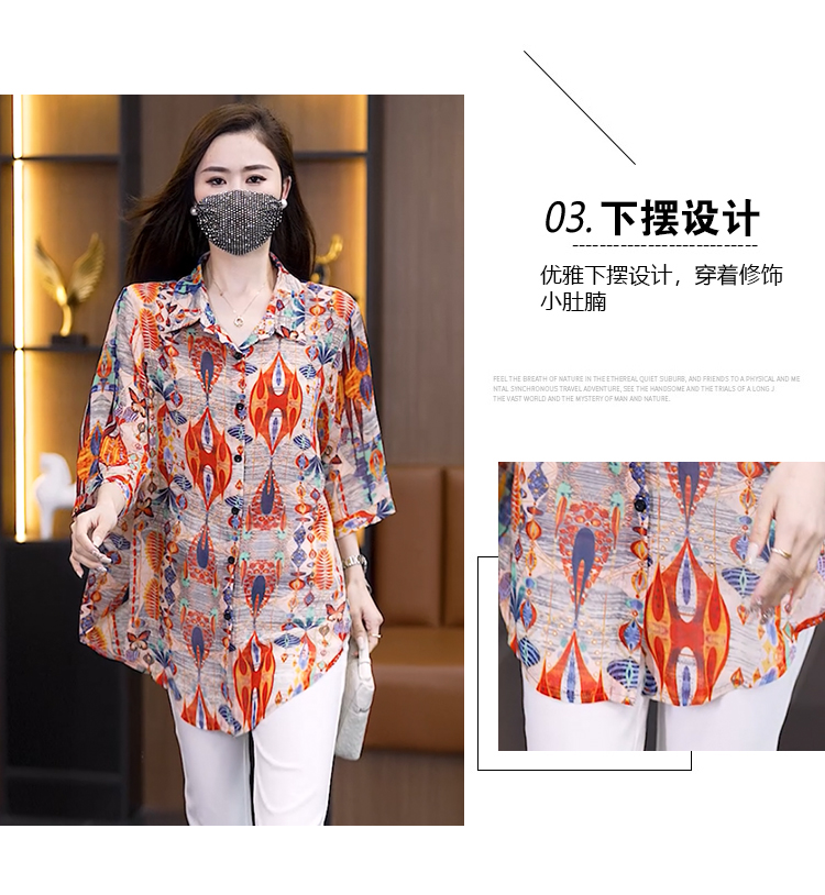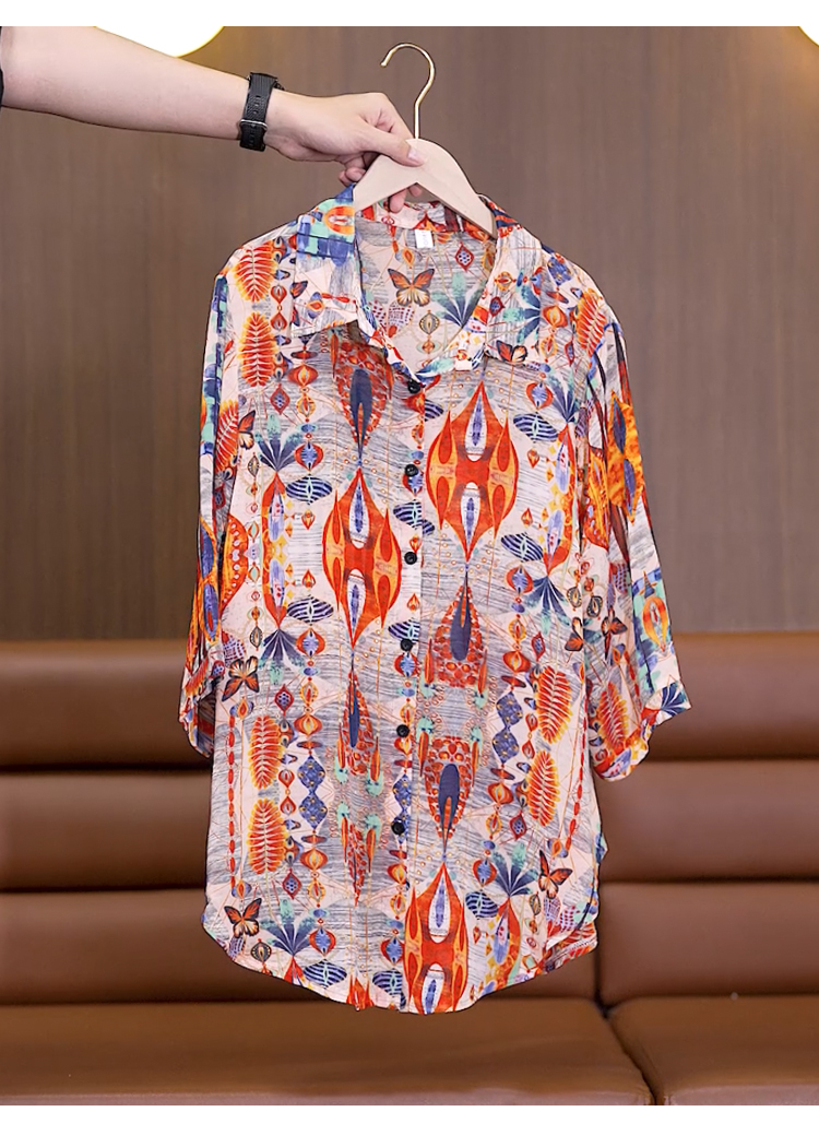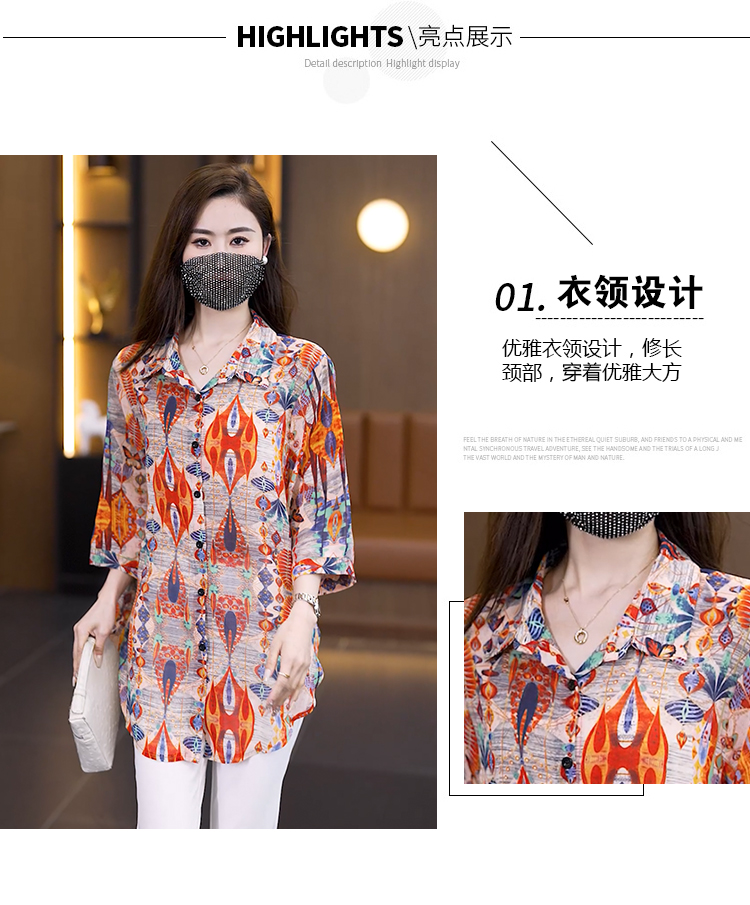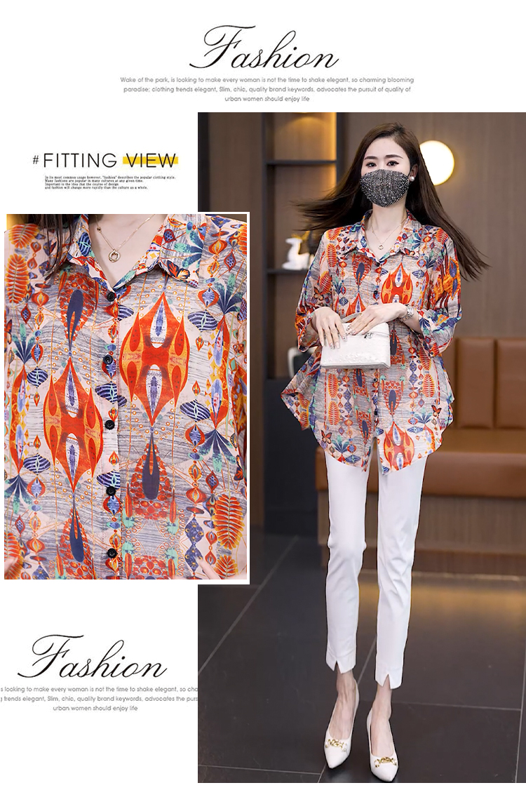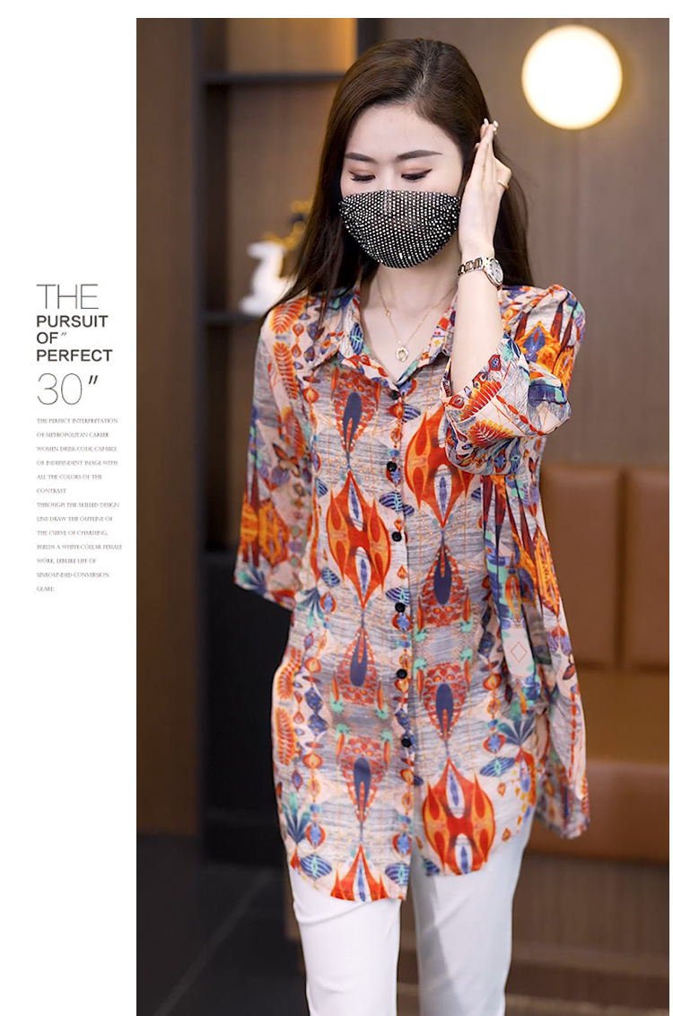 BY9185#花色宽松中长款衬衫女士夏季薄款复古印花开衫女