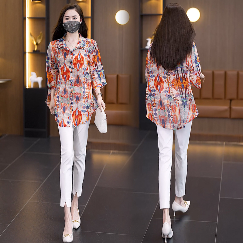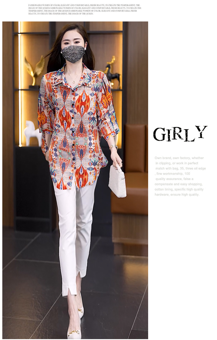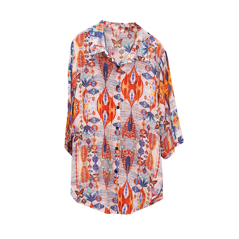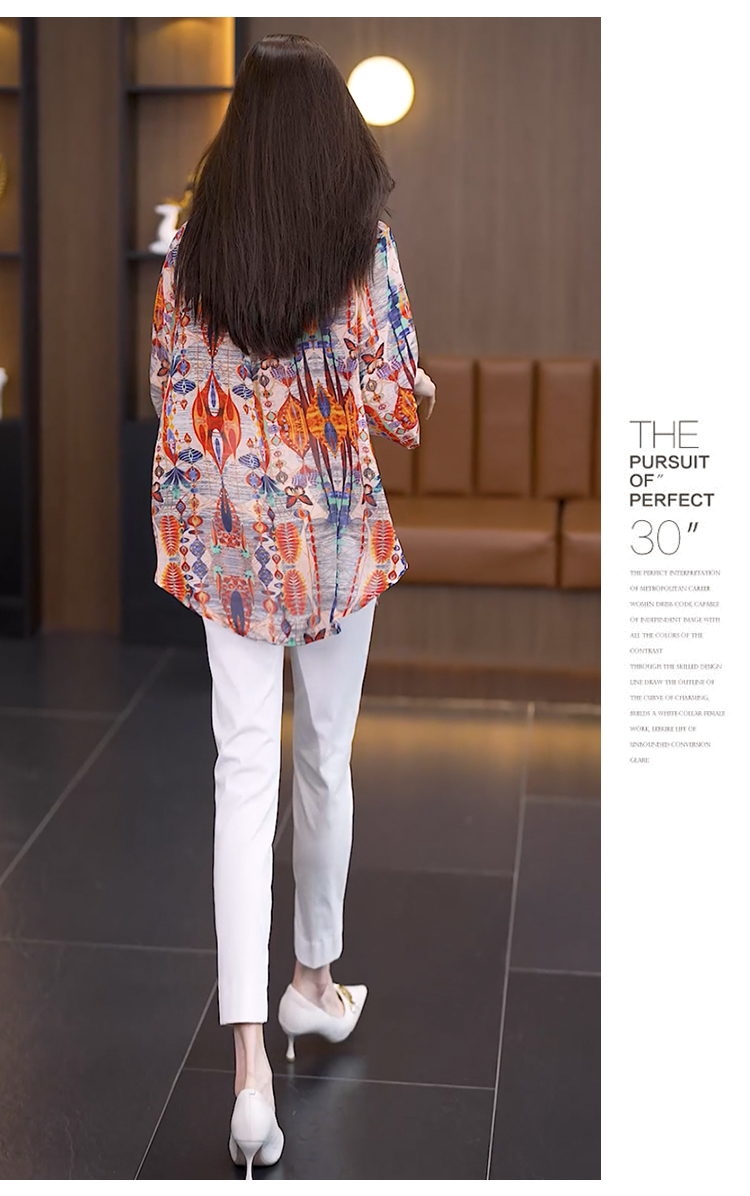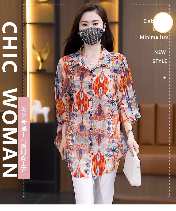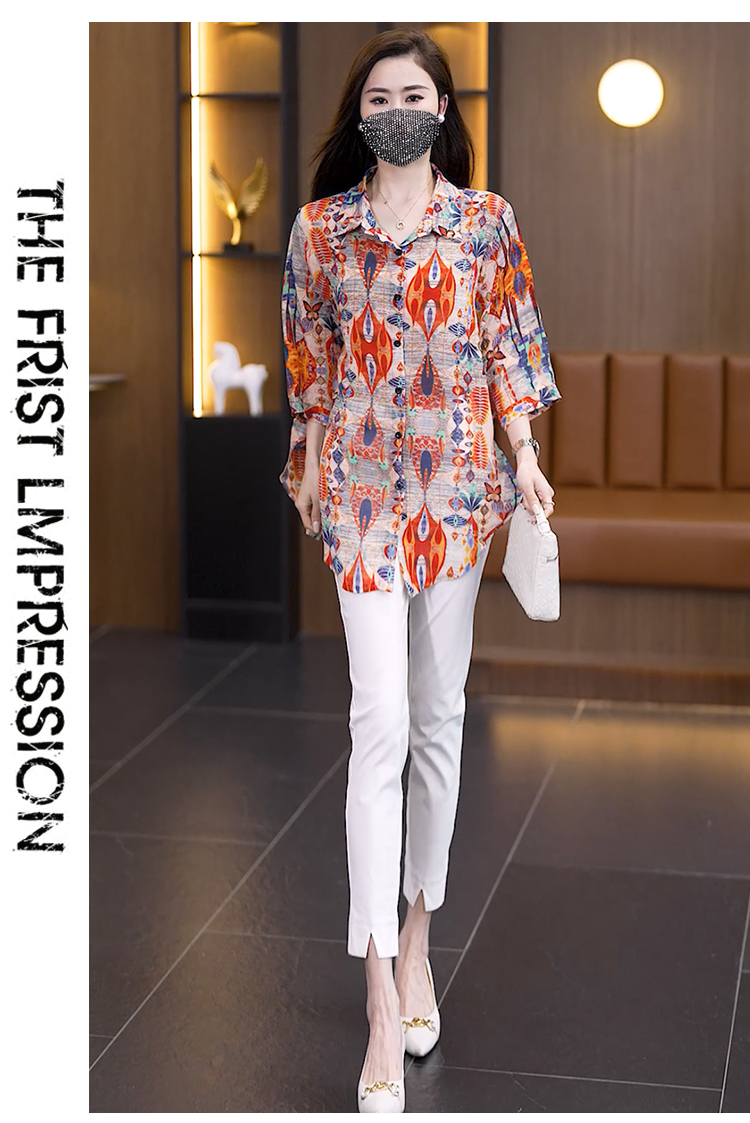 BY9185#花色宽松中长款衬衫女士夏季薄款复古印花开衫女