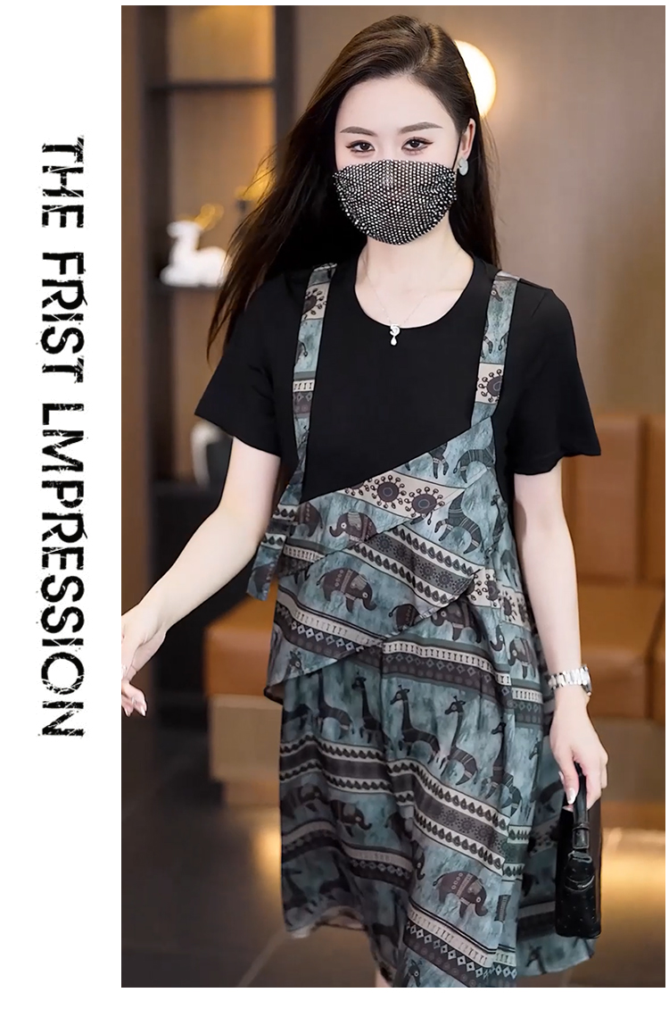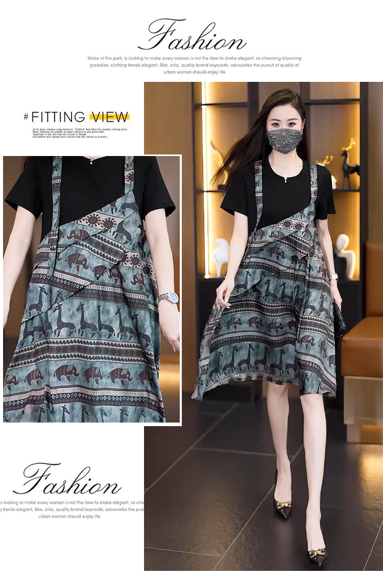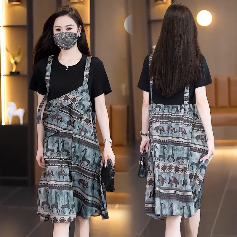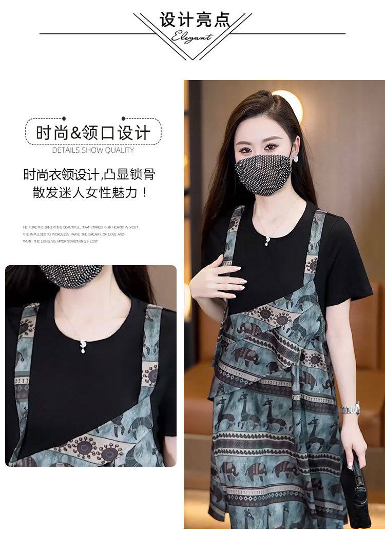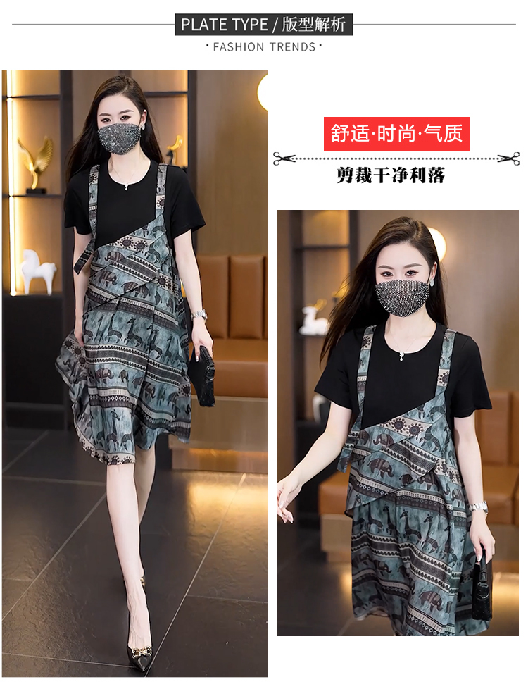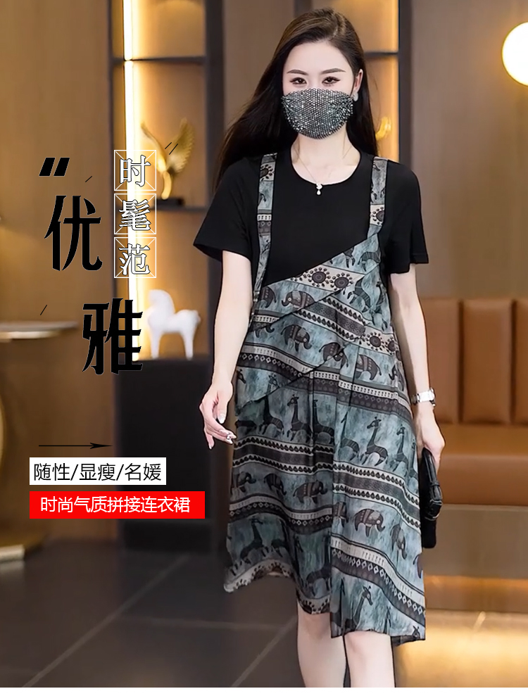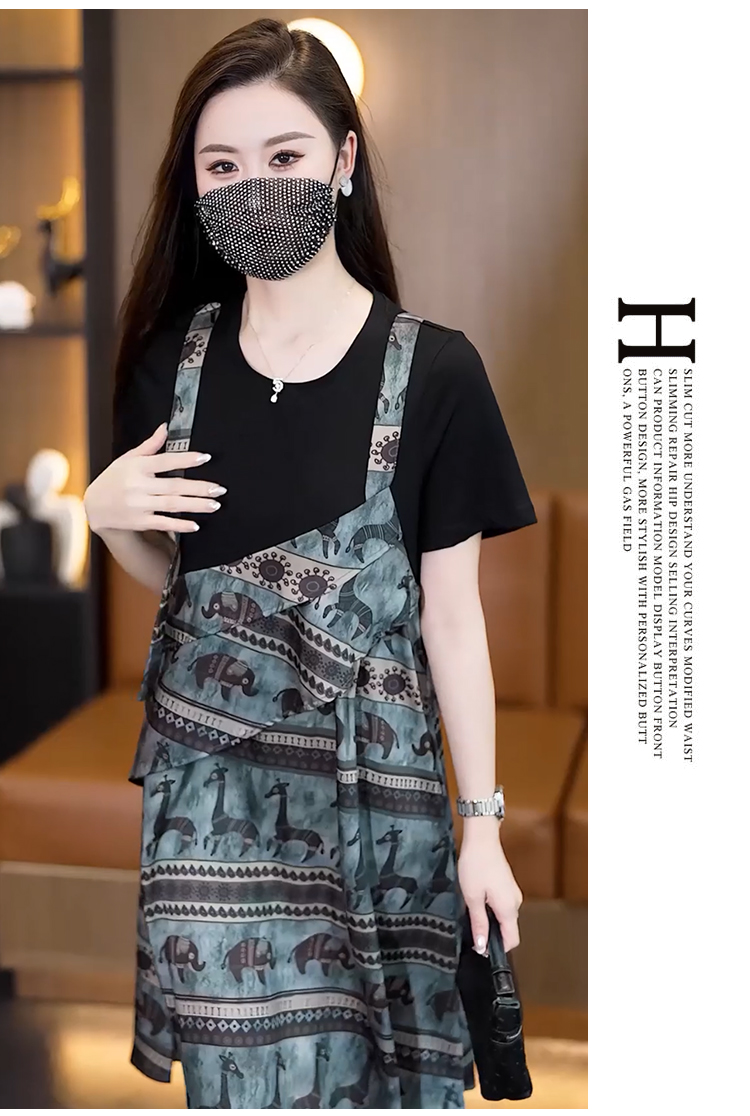 MY15742# 夏季新款假两件胖MM印花拼接连衣裙洋气高级感短袖雪纺裙女裝貨源服裝批發