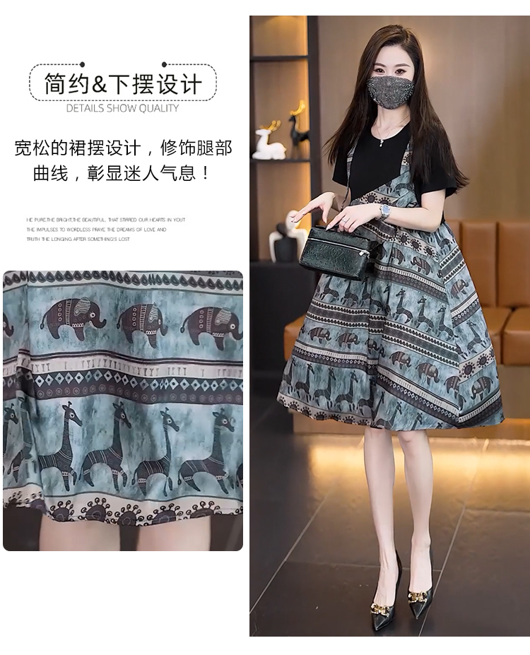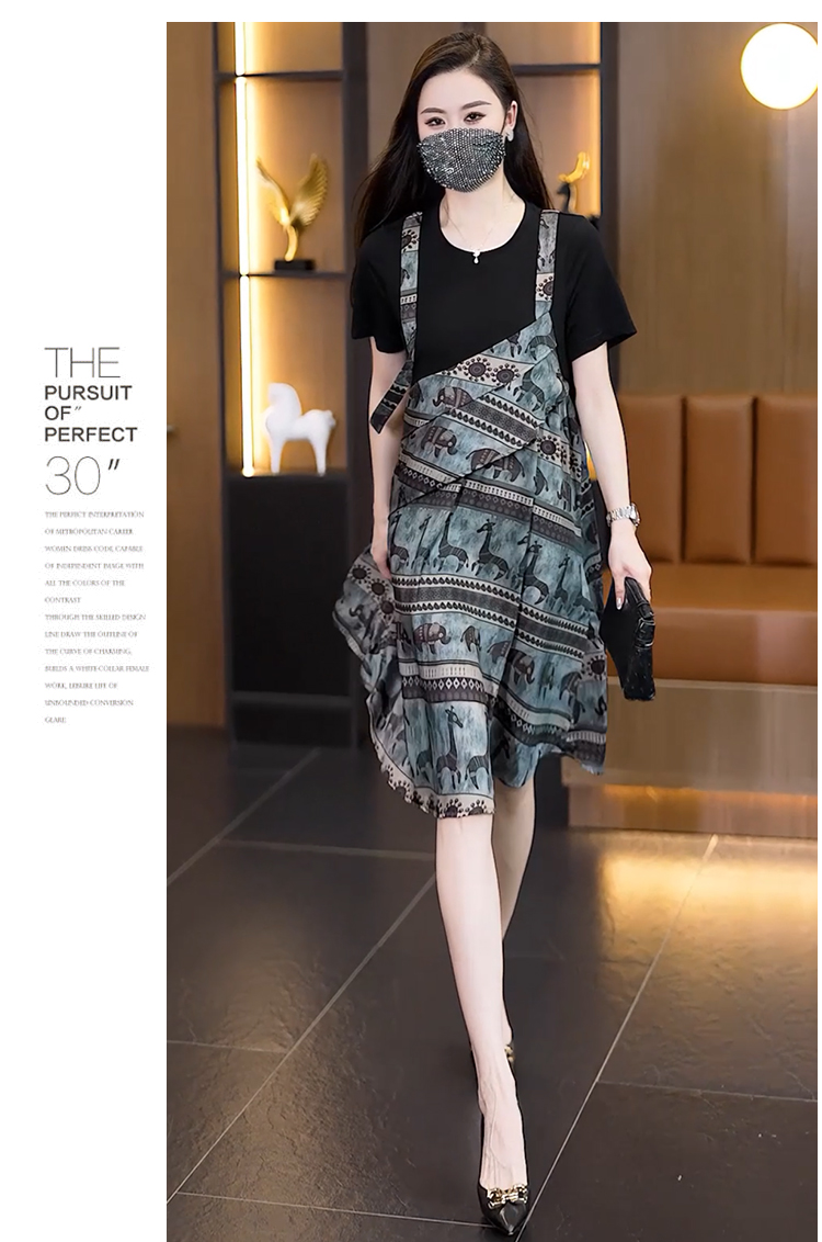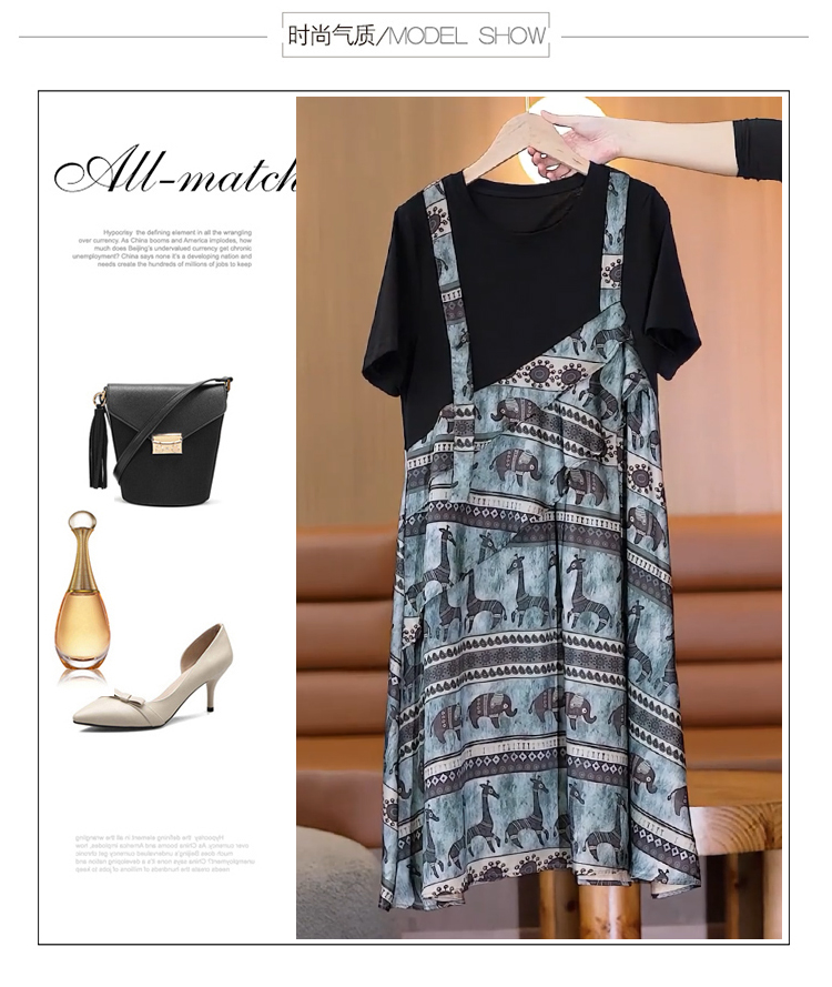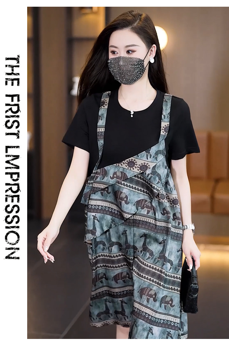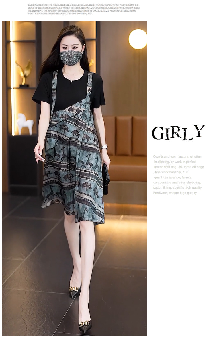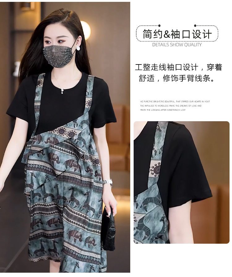 MY15742# 夏季新款假两件胖MM印花拼接连衣裙洋气高级感短袖雪纺裙女裝貨源服裝批發