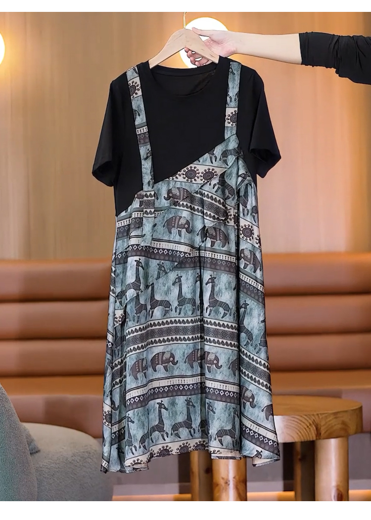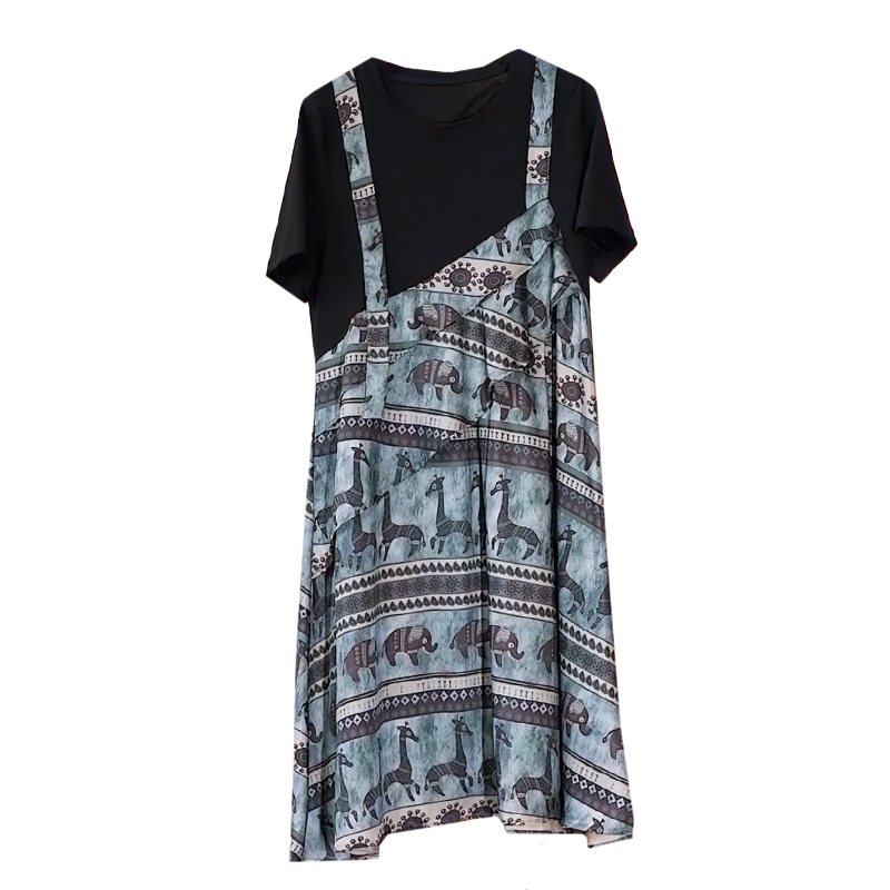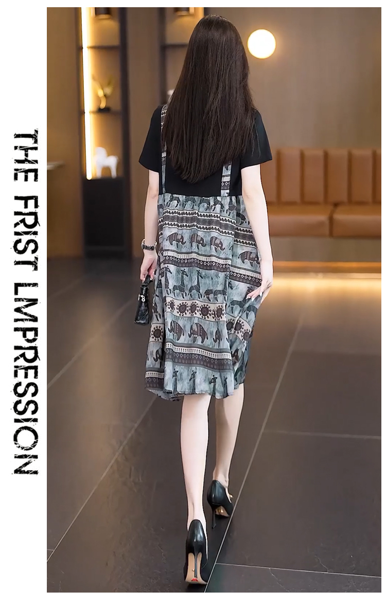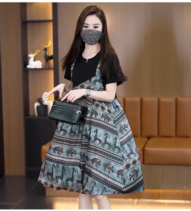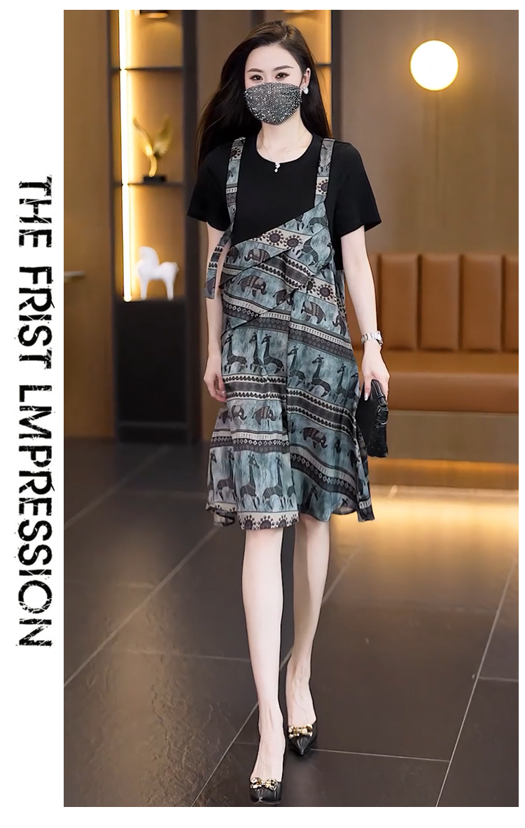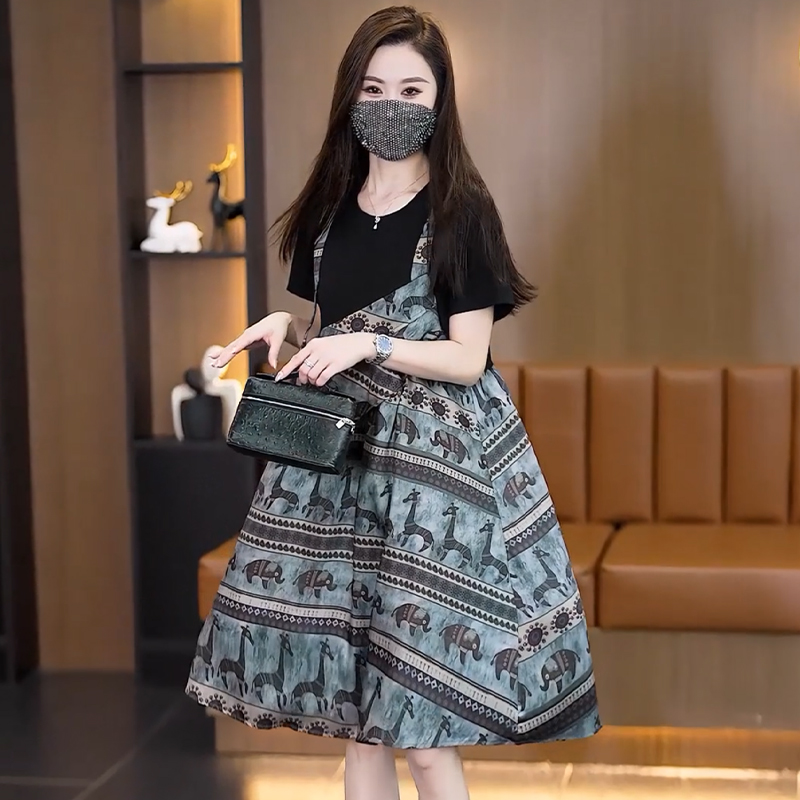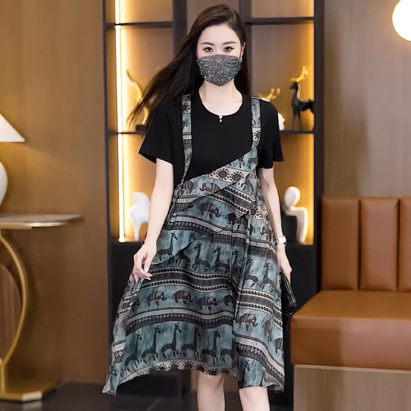 MY15742# 夏季新款假两件胖MM印花拼接连衣裙洋气高级感短袖雪纺裙女裝貨源服裝批發