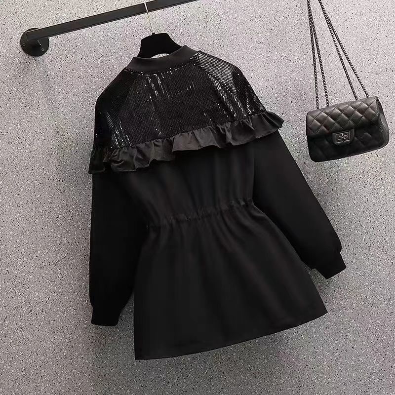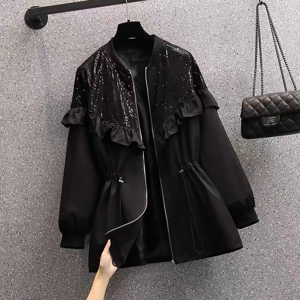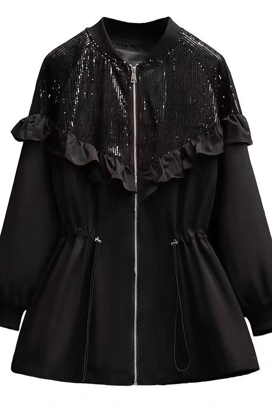 MY15747# 新款爆款时尚木耳花边亮片外套女休闲上衣早秋收腰风衣女裝貨源服裝批發