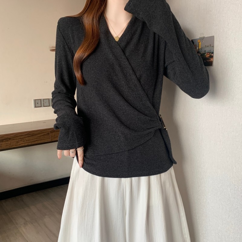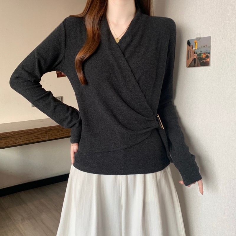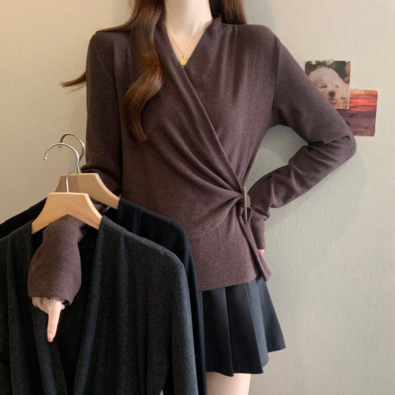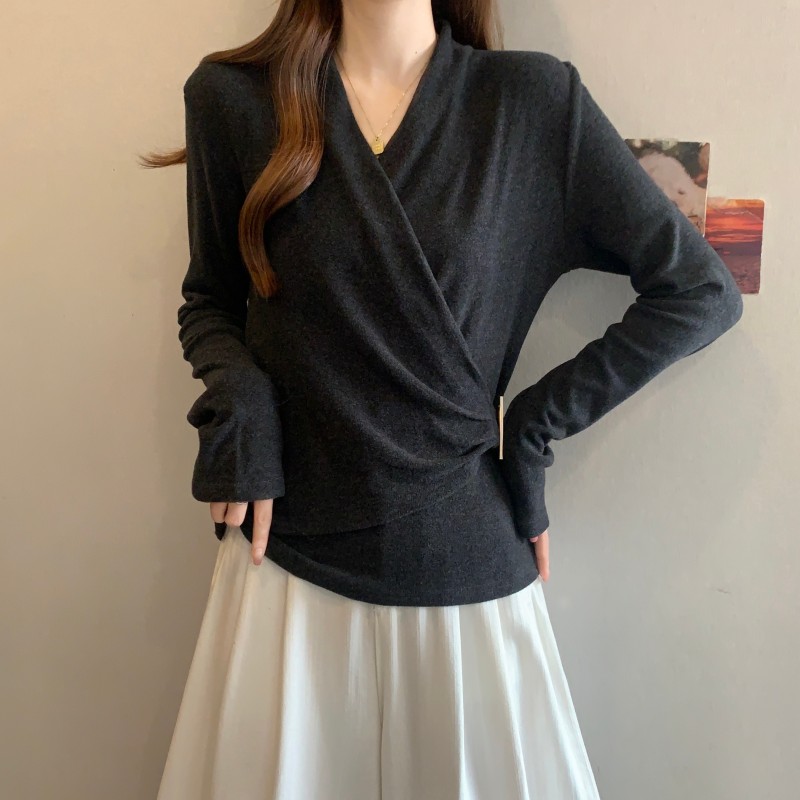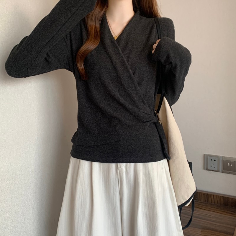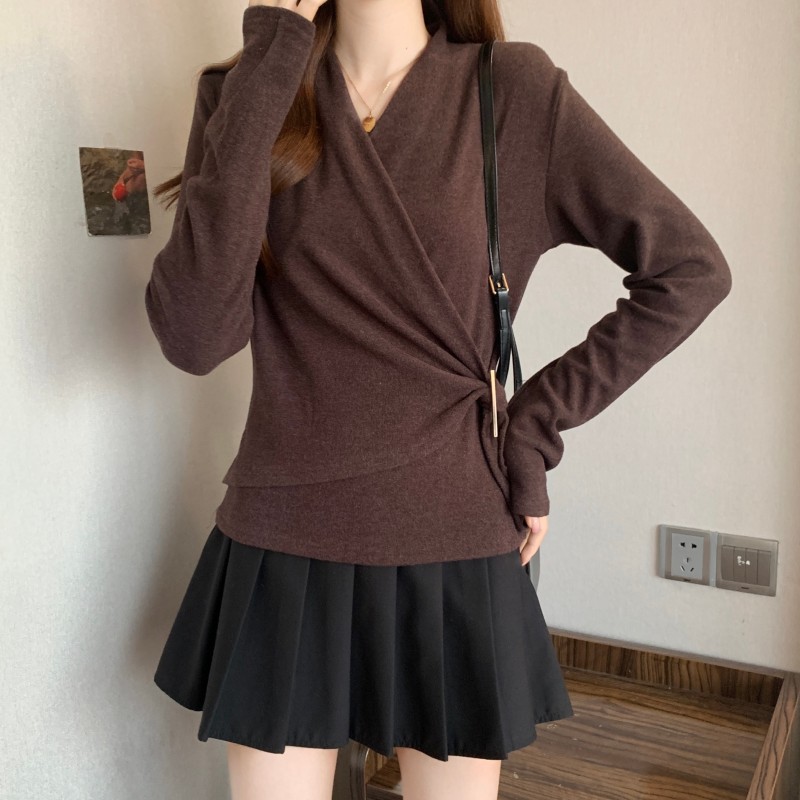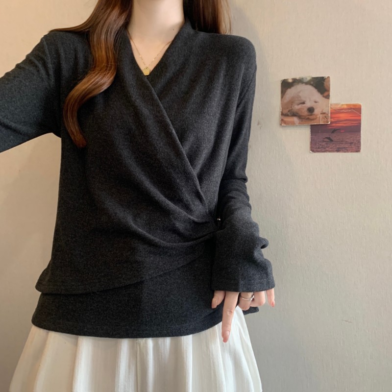 MY15756# 大码胖MM秋冬新款法式交叉V领长袖正肩羊绒磨毛长袖上衣女裝貨源服裝批發