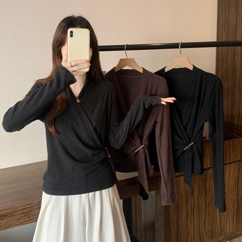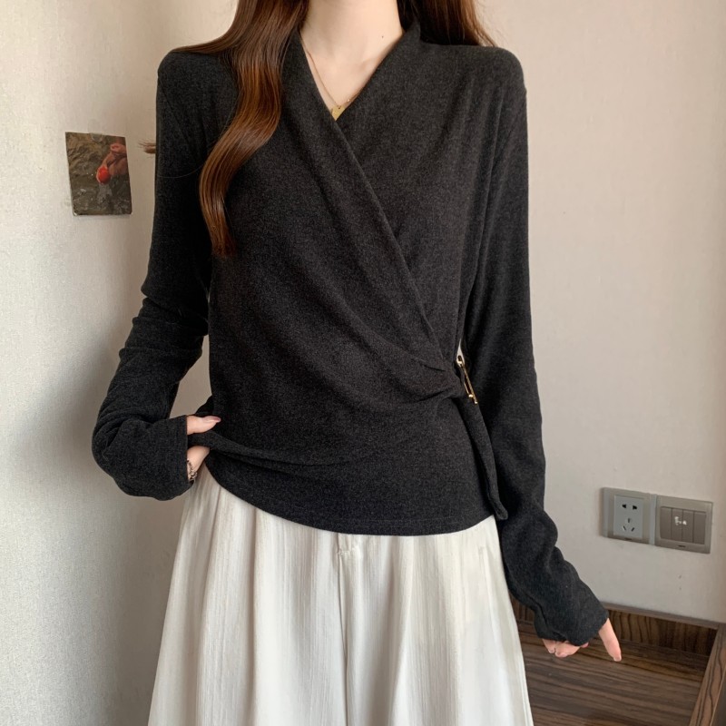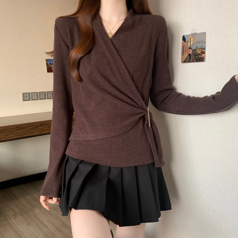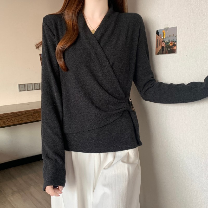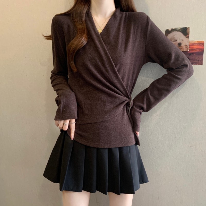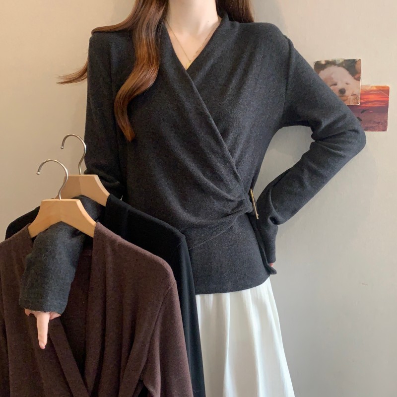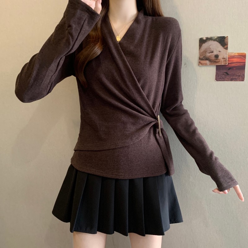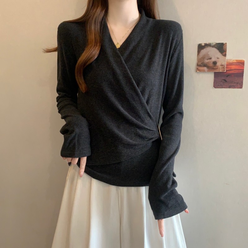 MY15756# 大码胖MM秋冬新款法式交叉V领长袖正肩羊绒磨毛长袖上衣女裝貨源服裝批發
