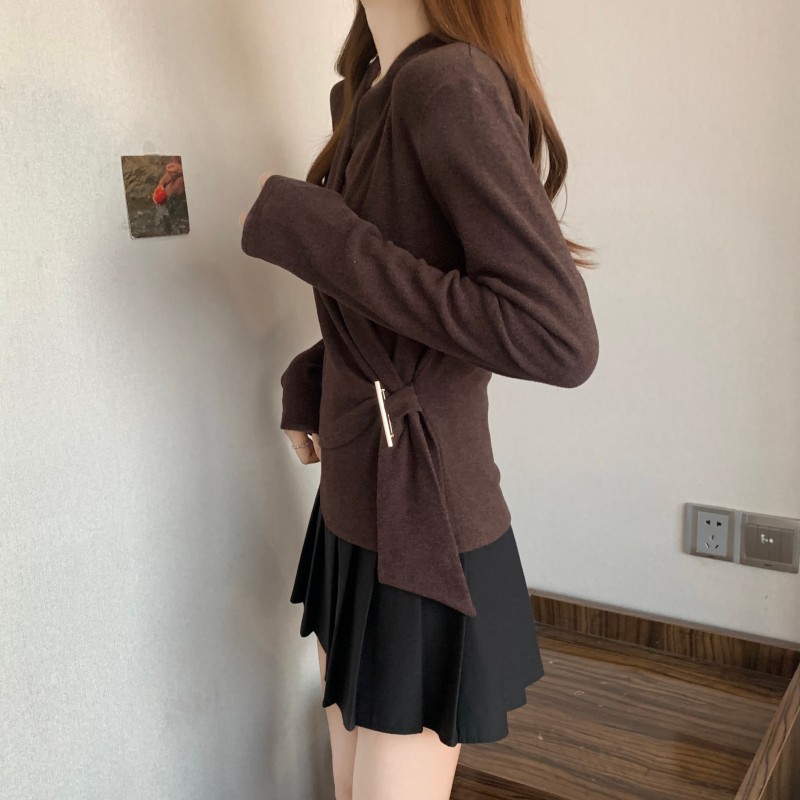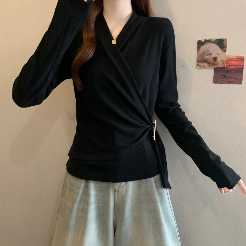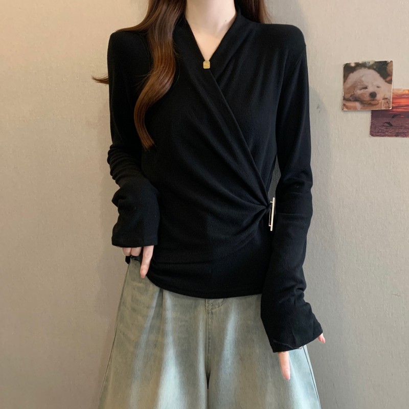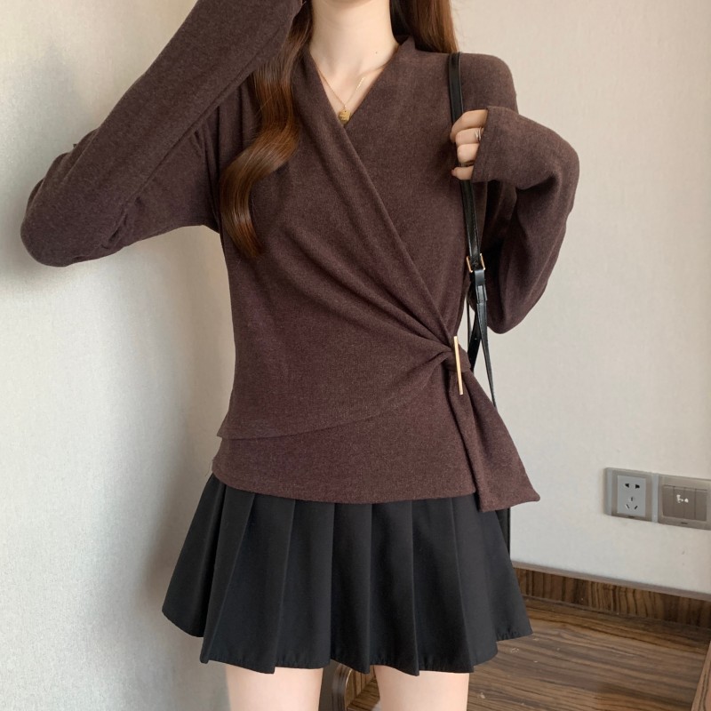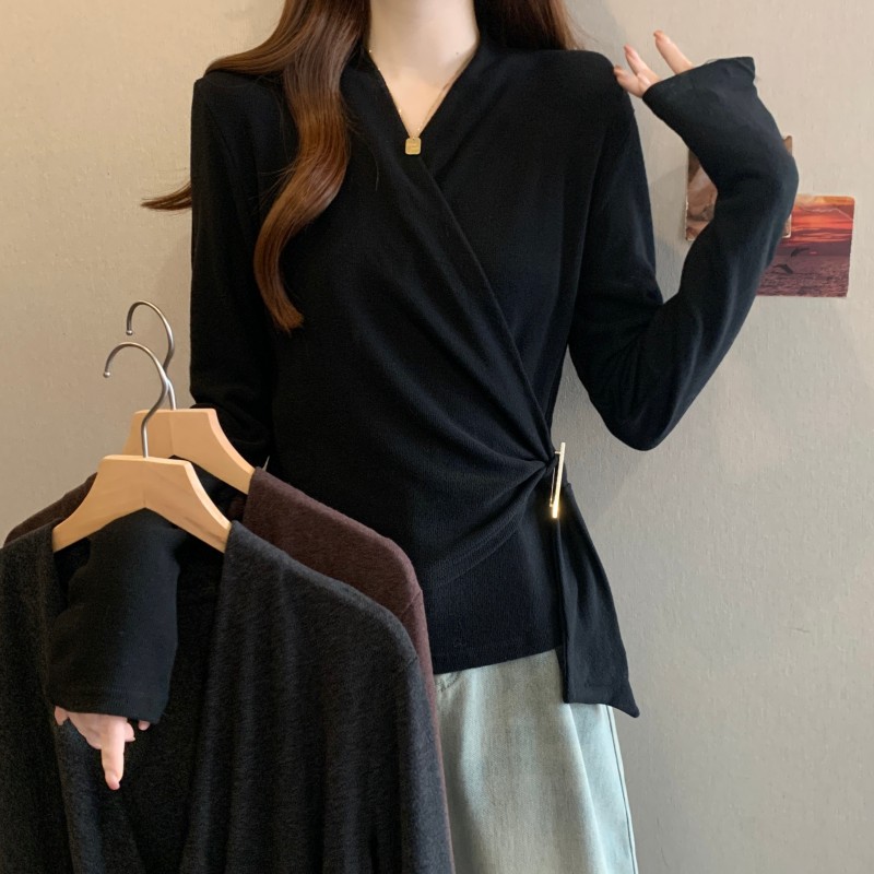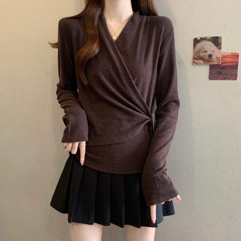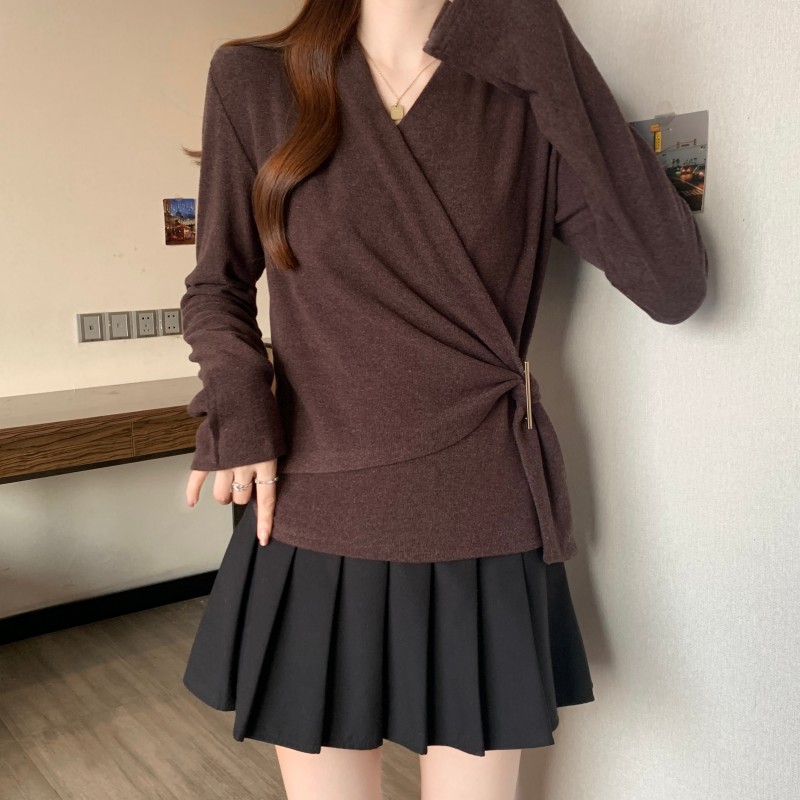 MY15756# 大码胖MM秋冬新款法式交叉V领长袖正肩羊绒磨毛长袖上衣女裝貨源服裝批發
