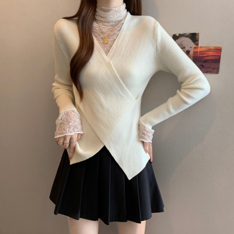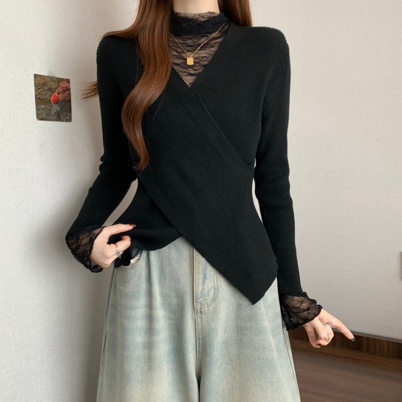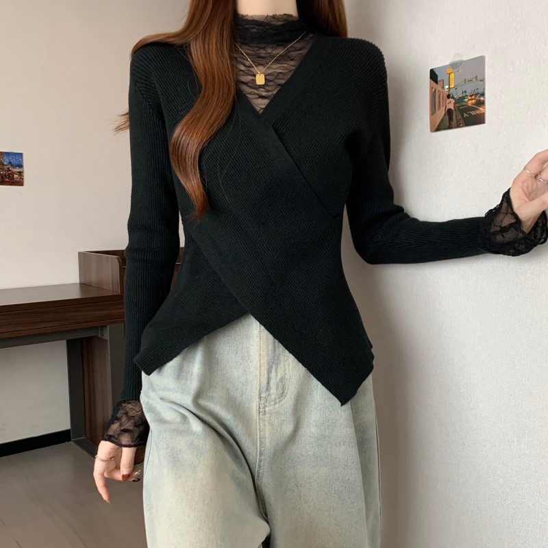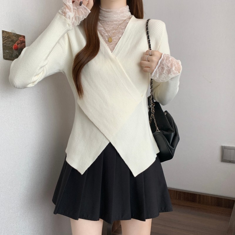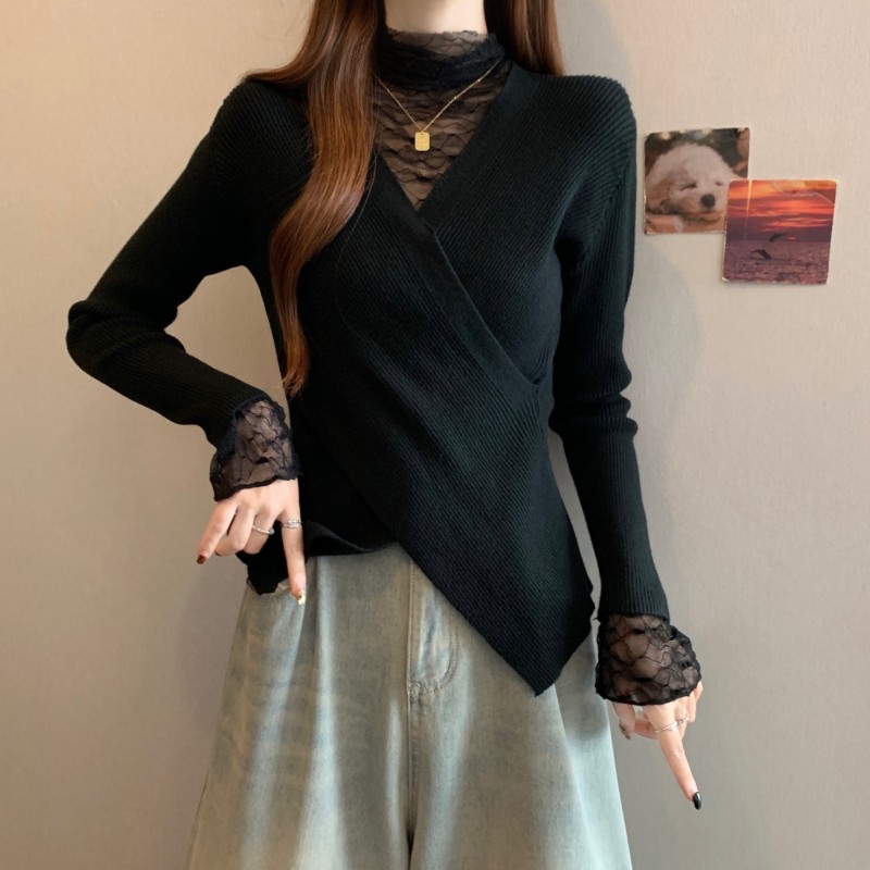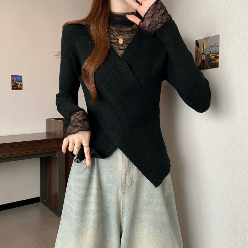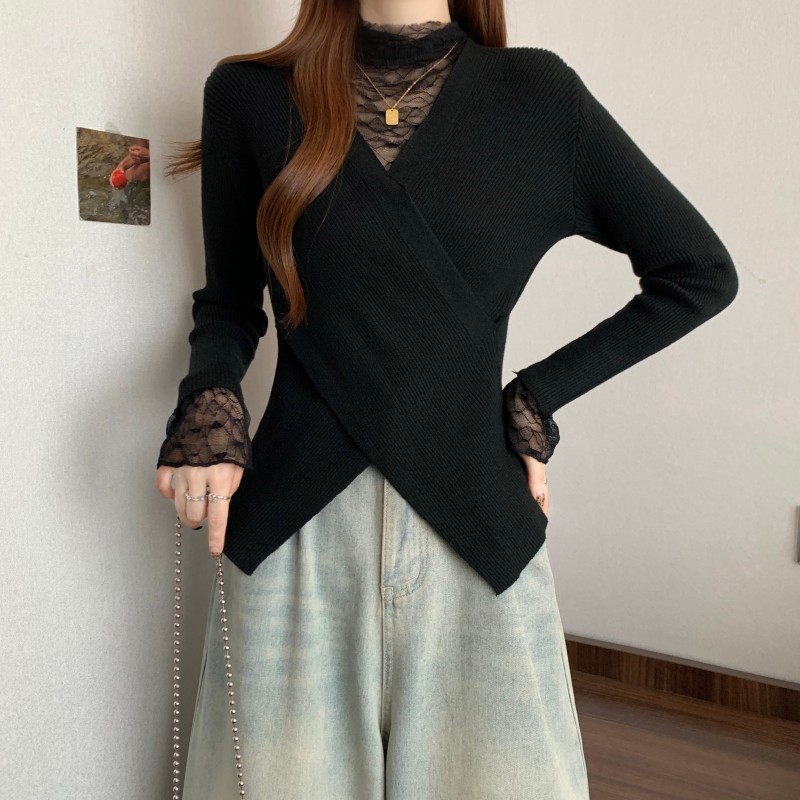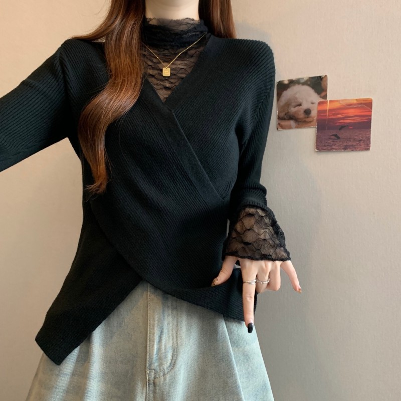 MY15758# 大码胖MM新款蕾丝V领交叉不对称下摆收腰套头长袖针织衫女裝貨源服裝批發