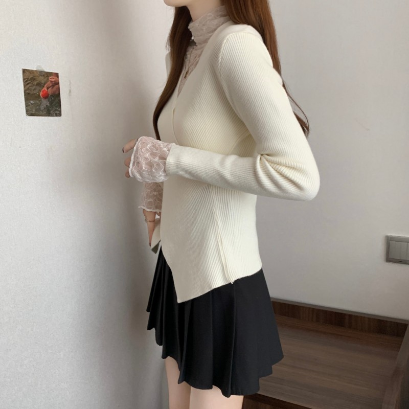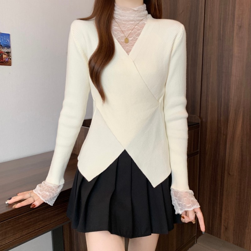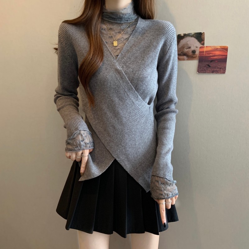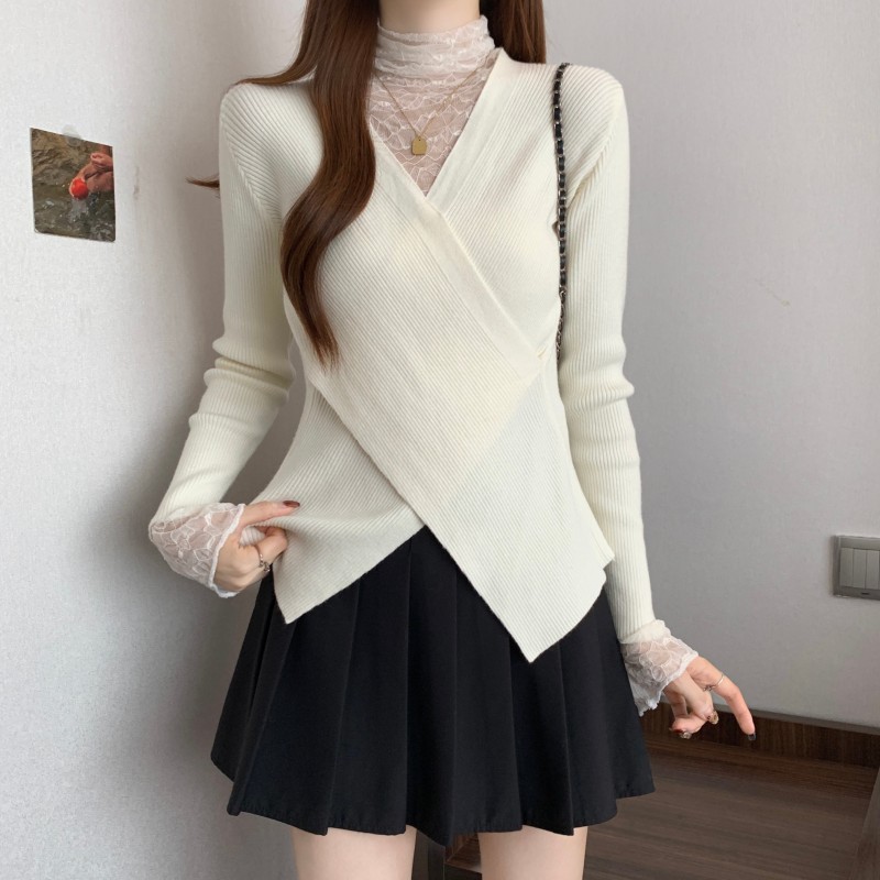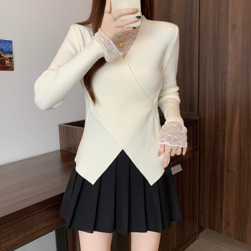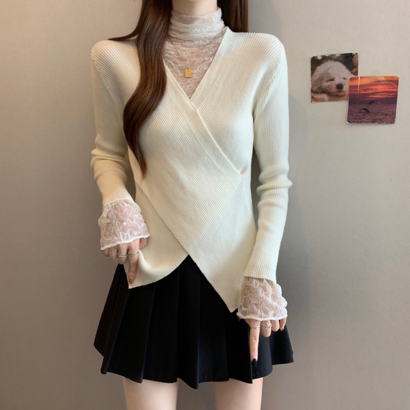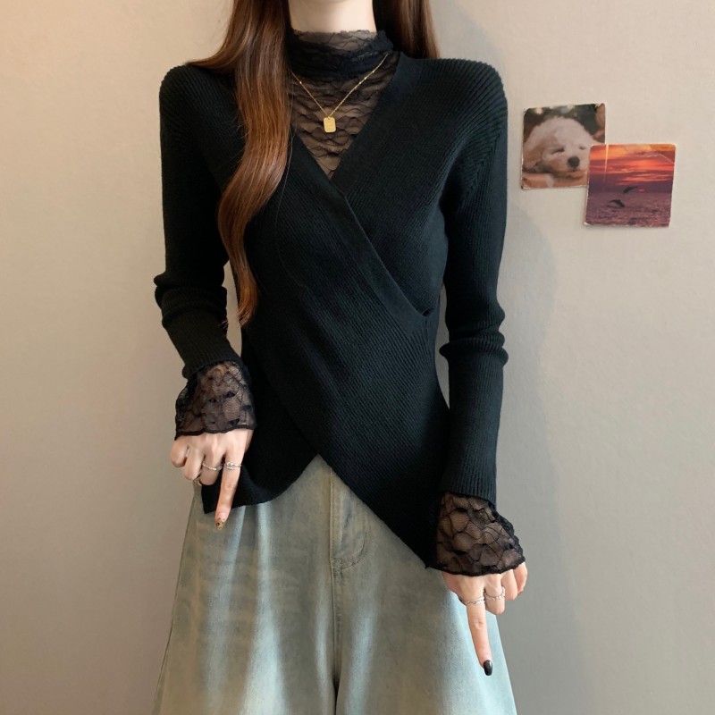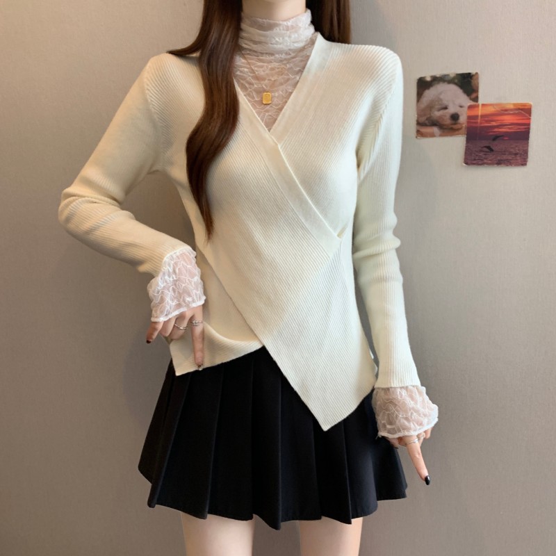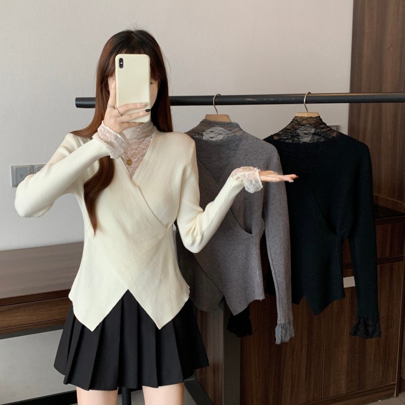 MY15758# 大码胖MM新款蕾丝V领交叉不对称下摆收腰套头长袖针织衫女裝貨源服裝批發