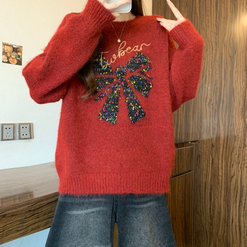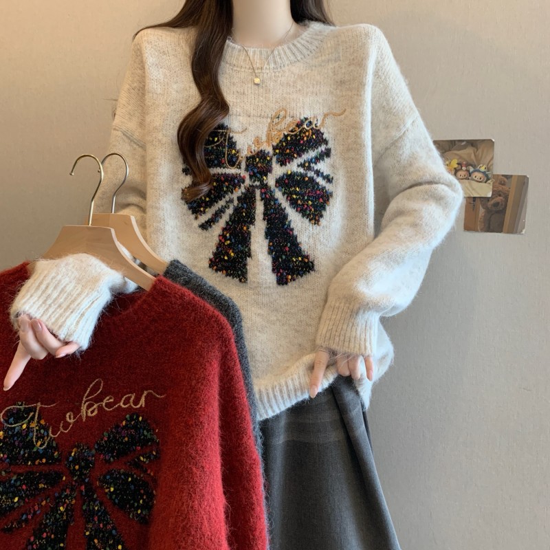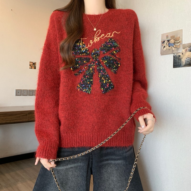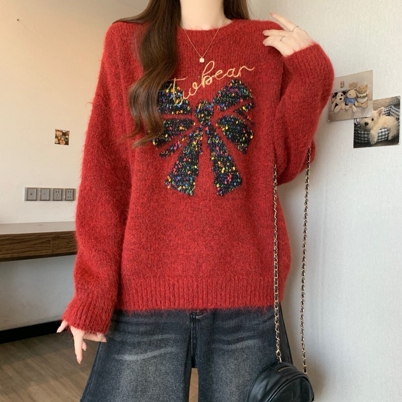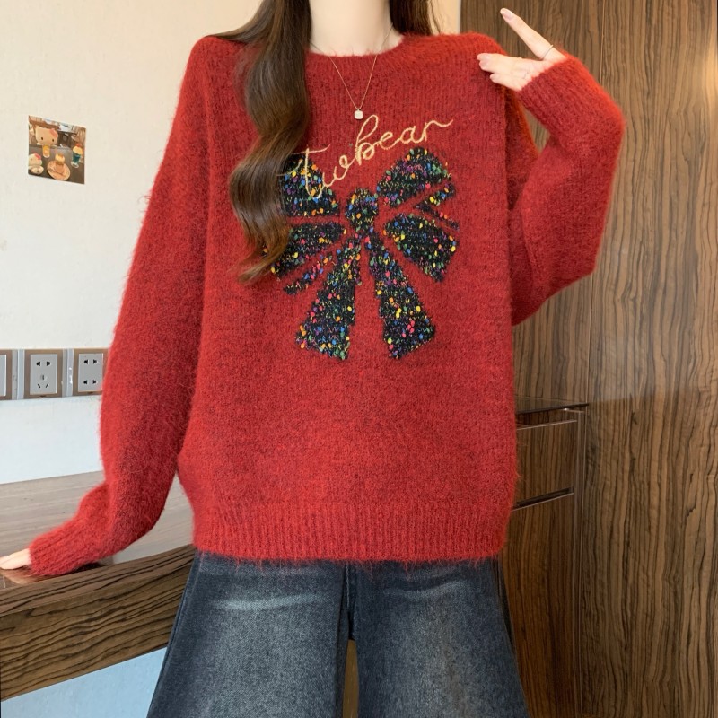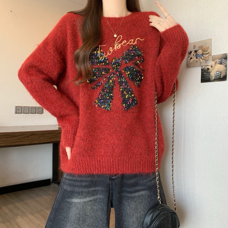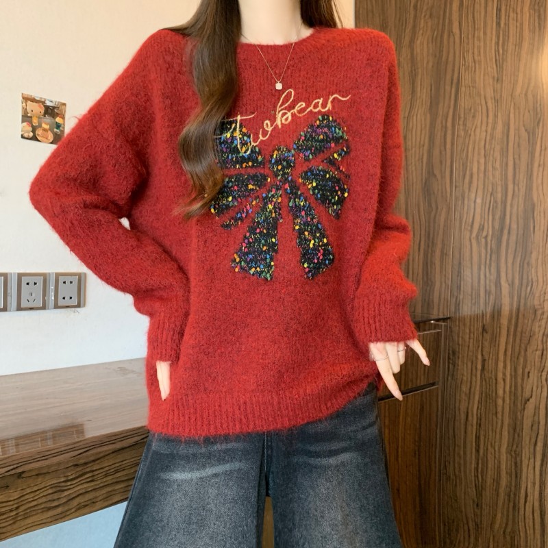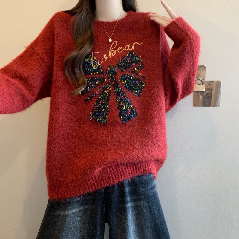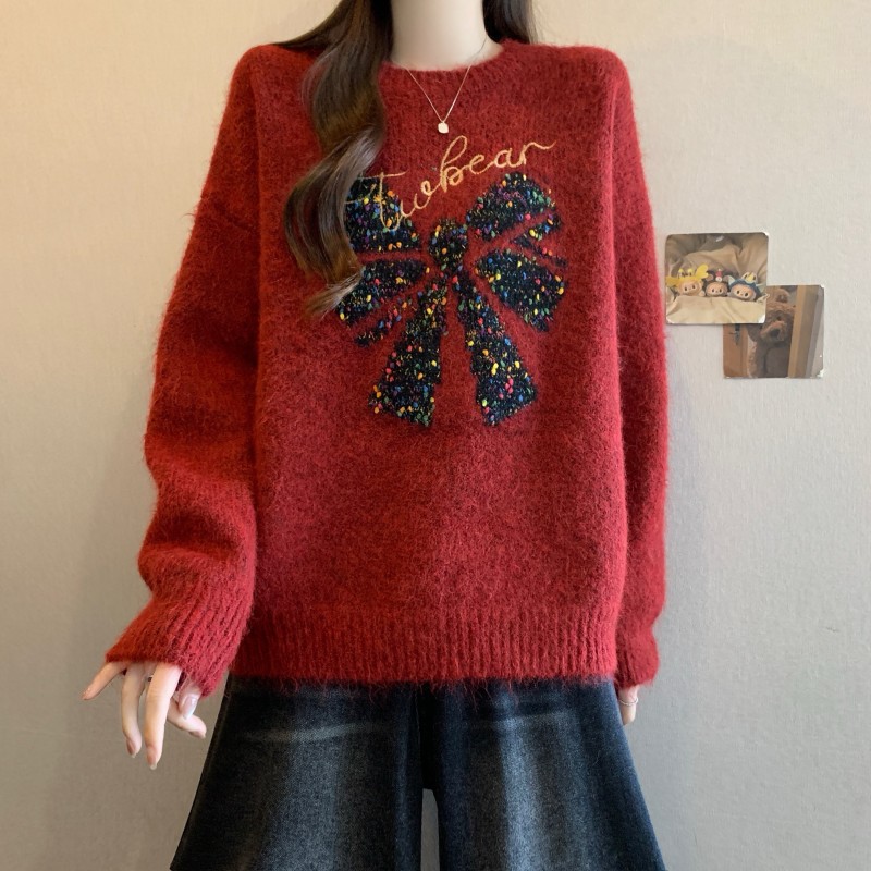 MY15762# 大码胖MM新款提花圣诞蝴蝶结字母绣花长袖套头毛衣女裝貨源服裝批發