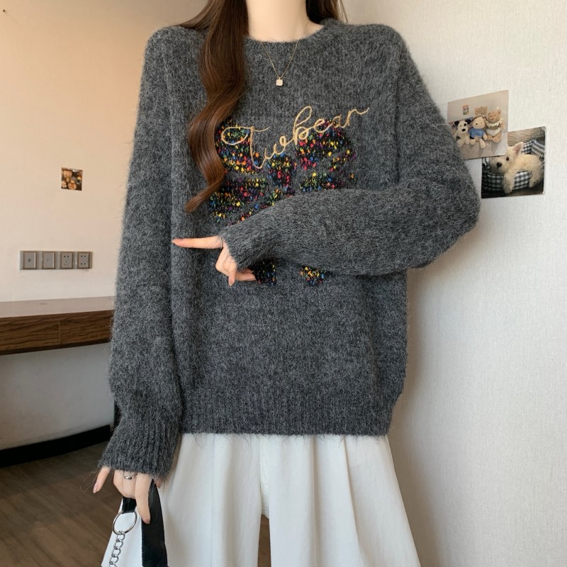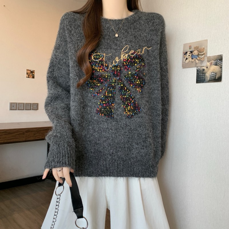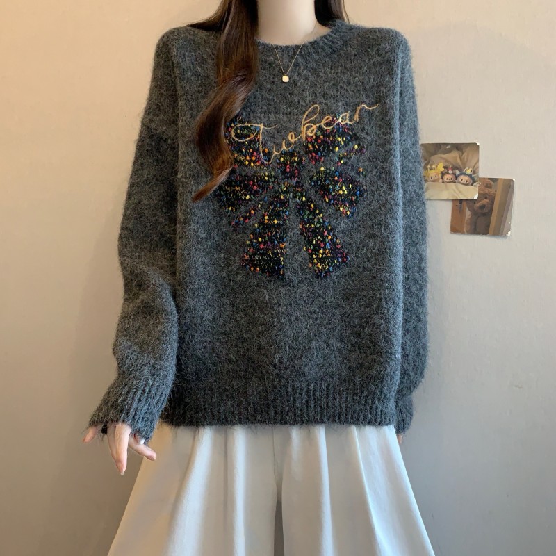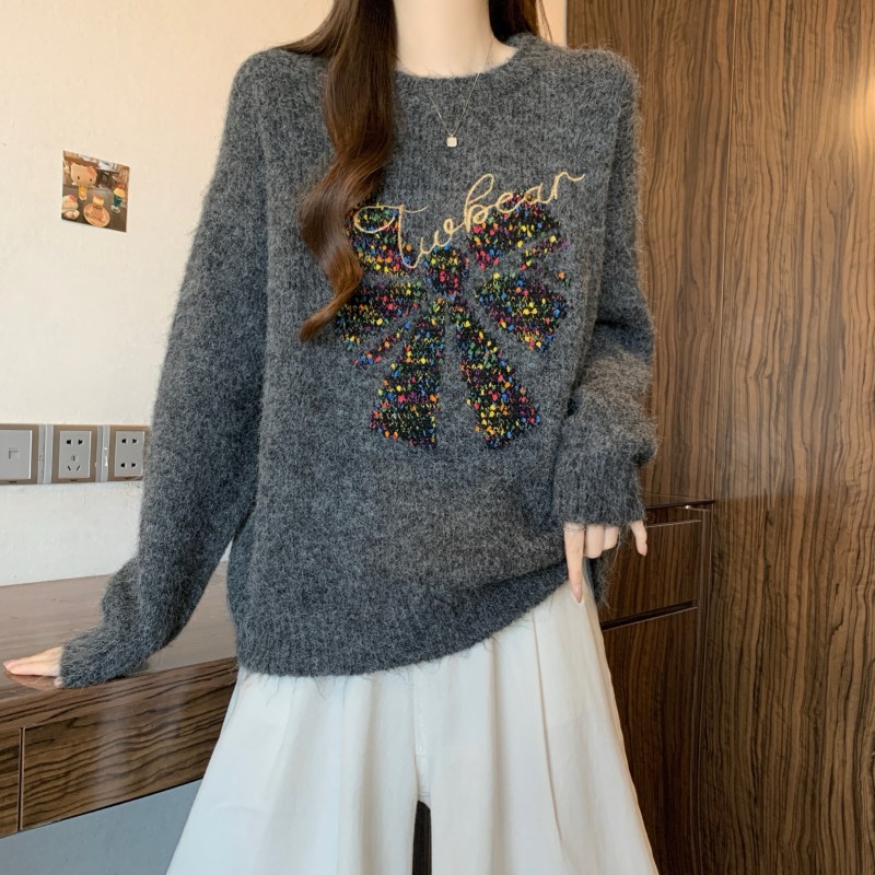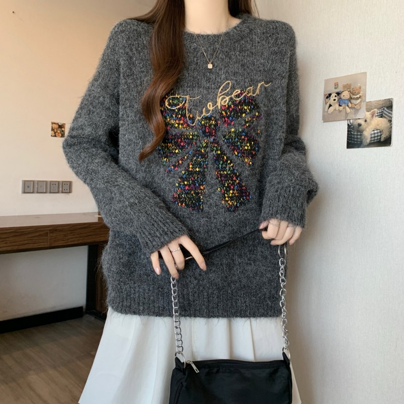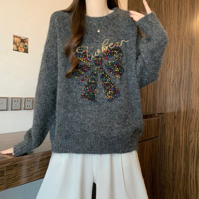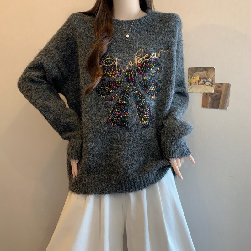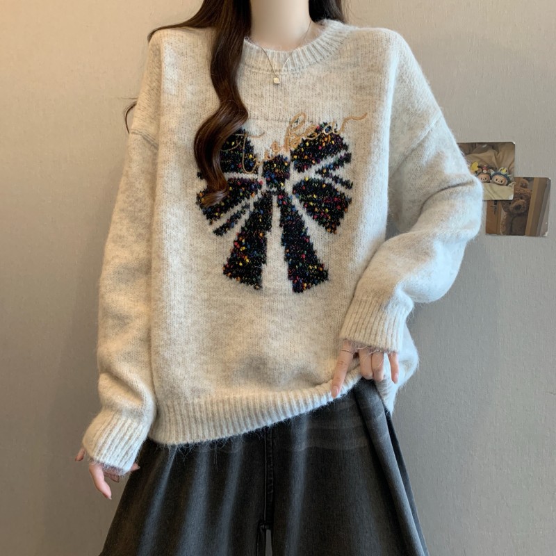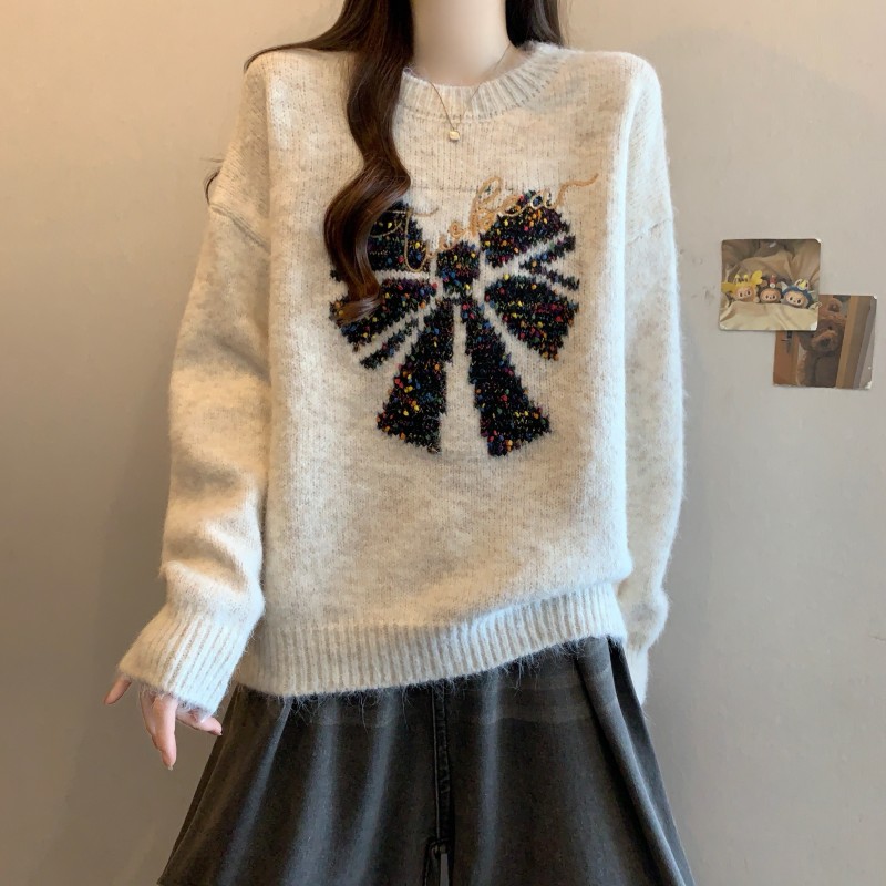 MY15762# 大码胖MM新款提花圣诞蝴蝶结字母绣花长袖套头毛衣女裝貨源服裝批發