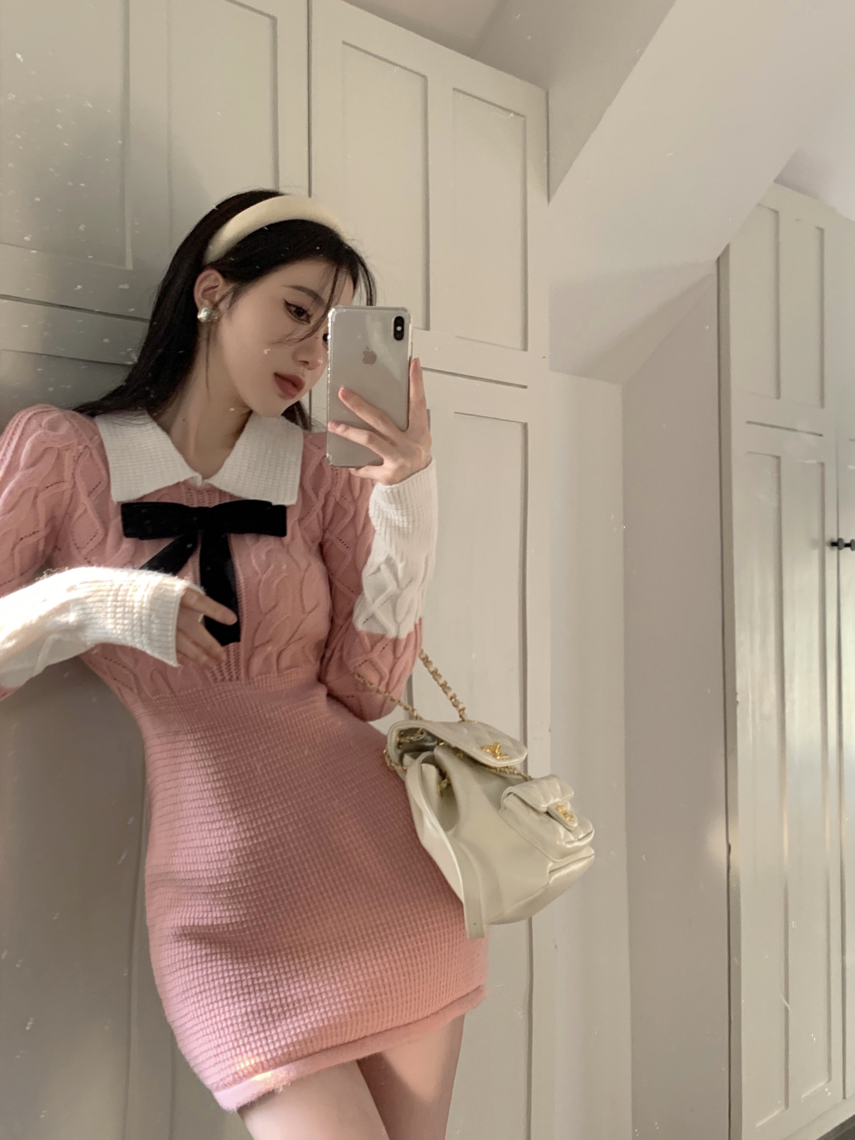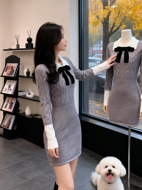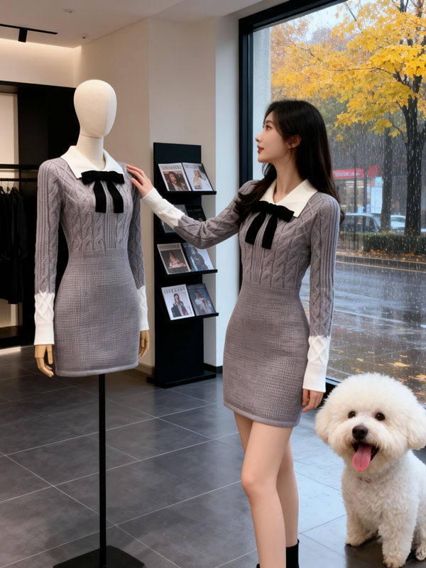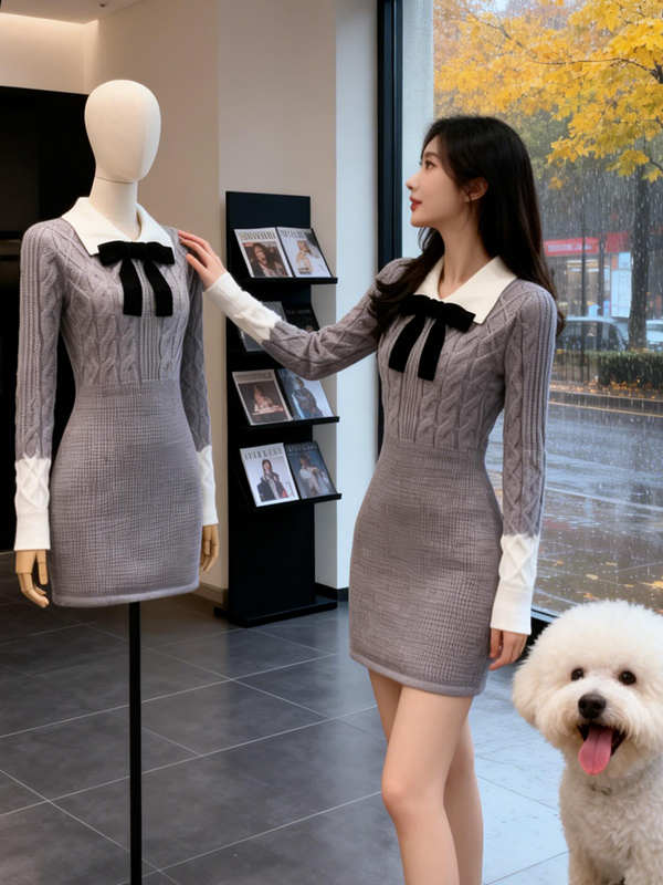 MY15772# 韩系学院风针织连衣裙蝴蝶结收腰显瘦高级感针织短裙子女裝貨源服裝批發