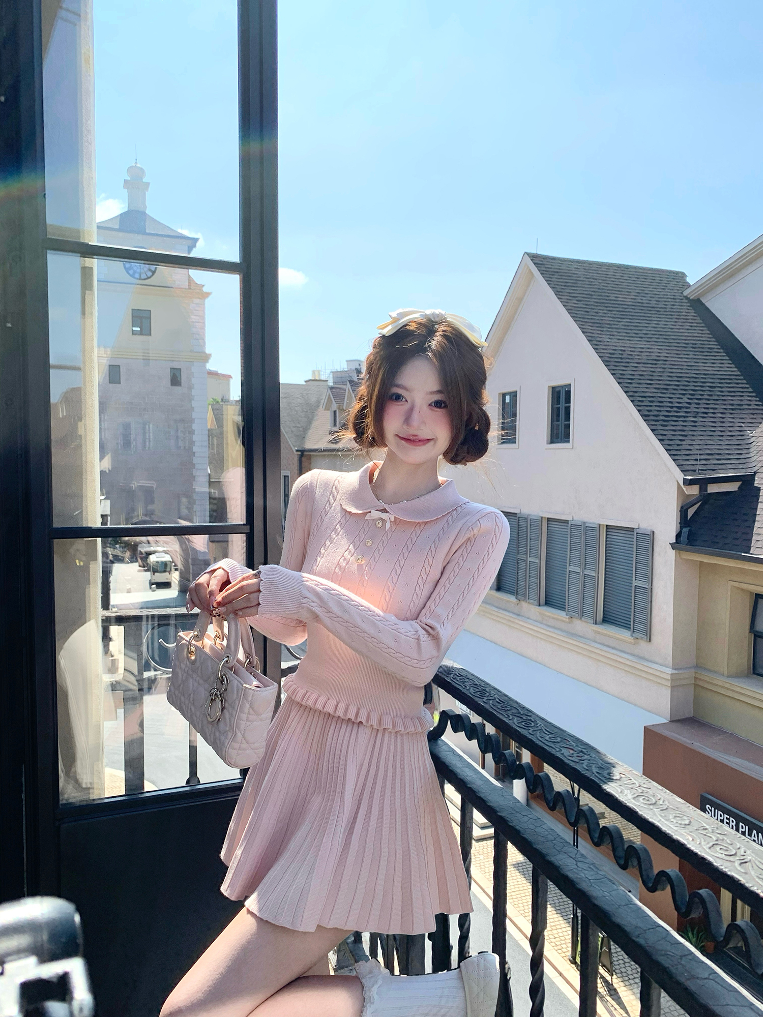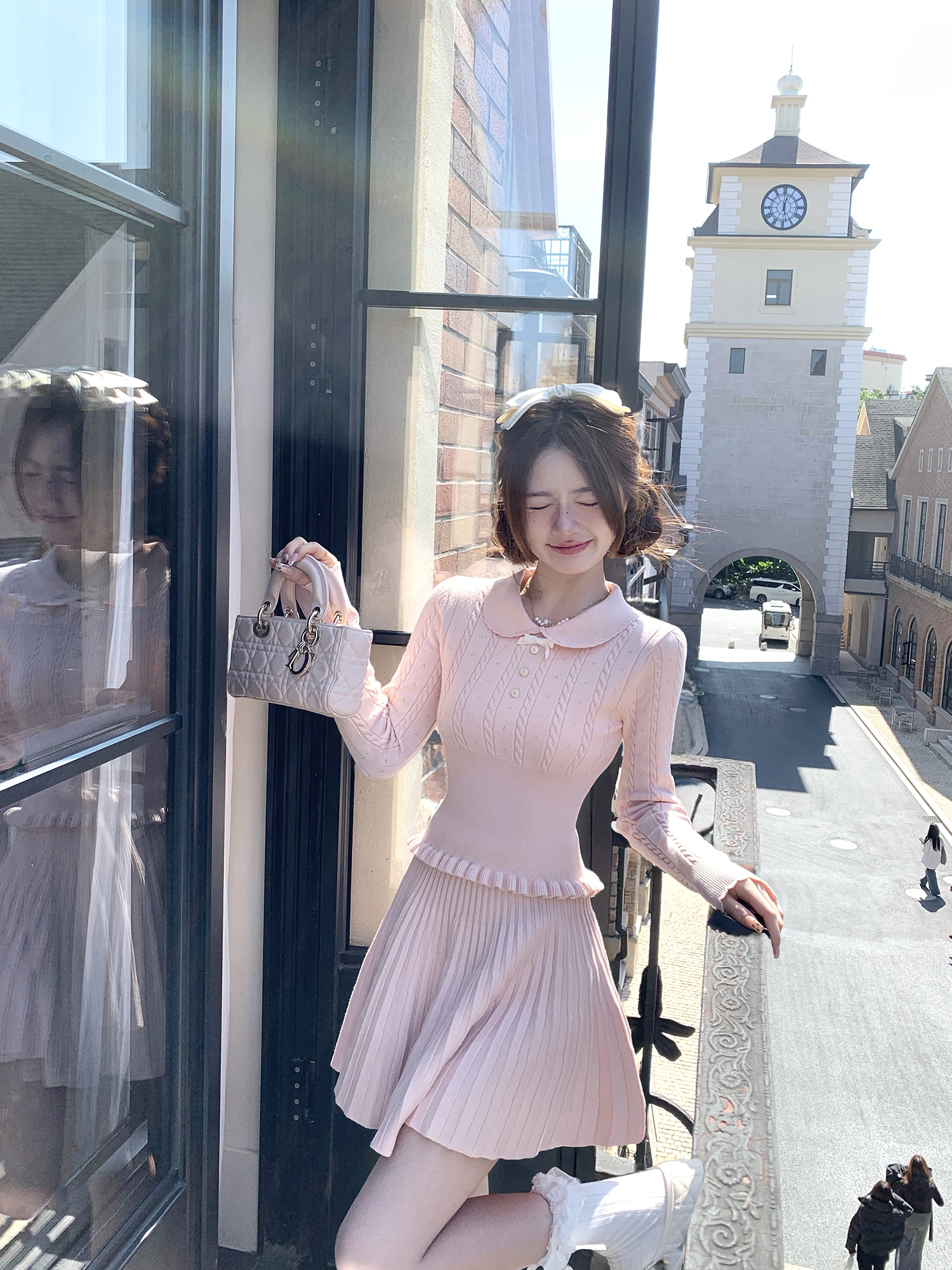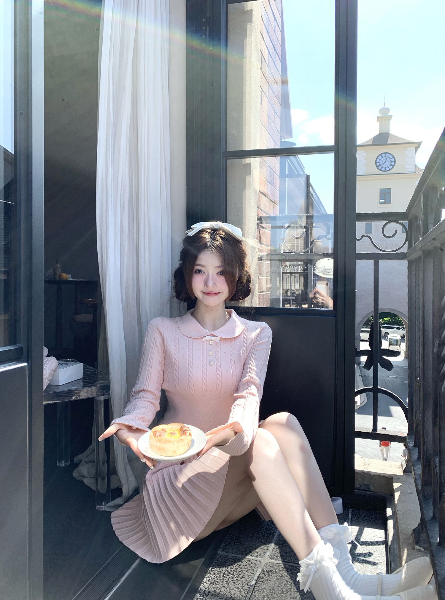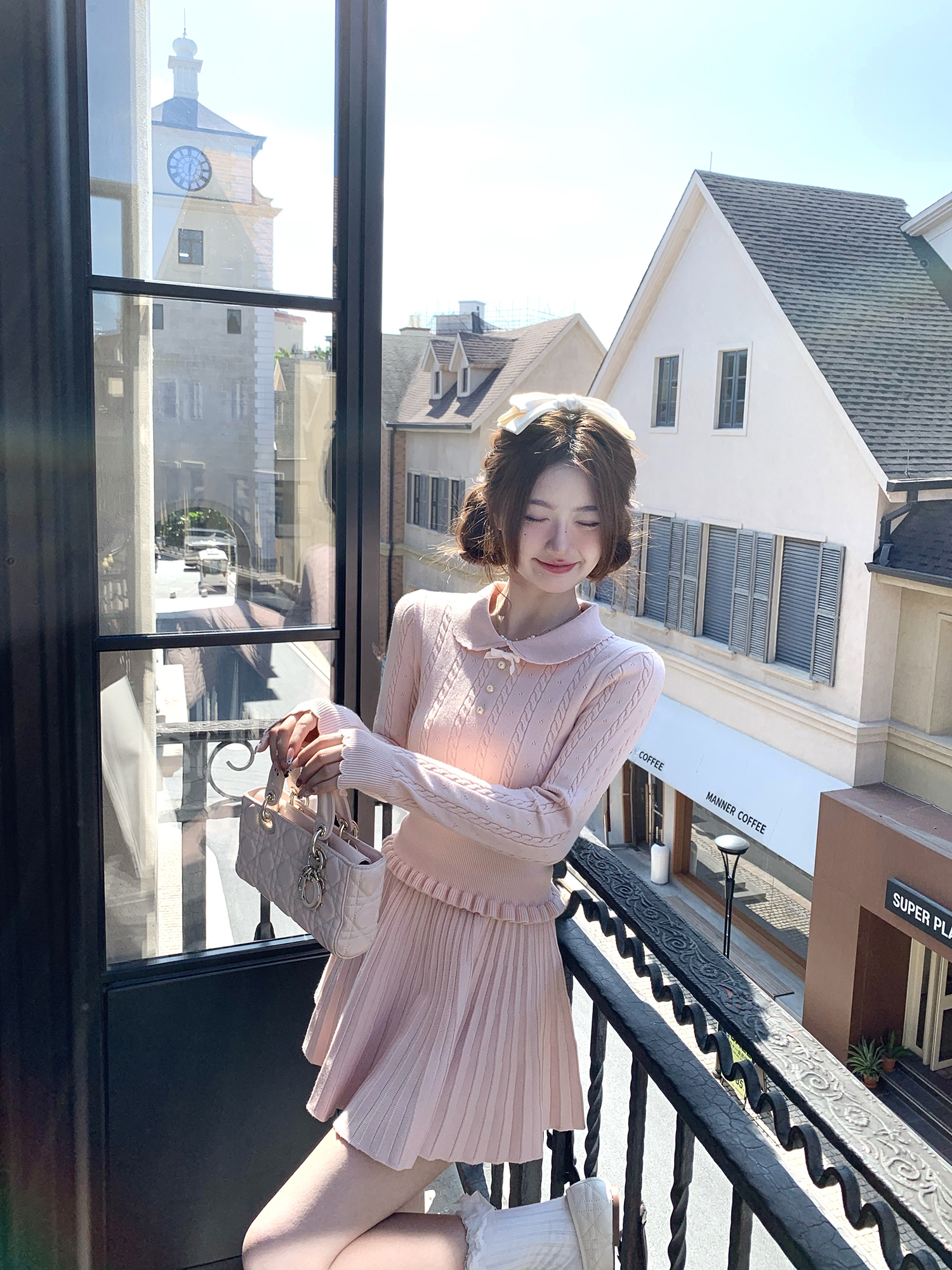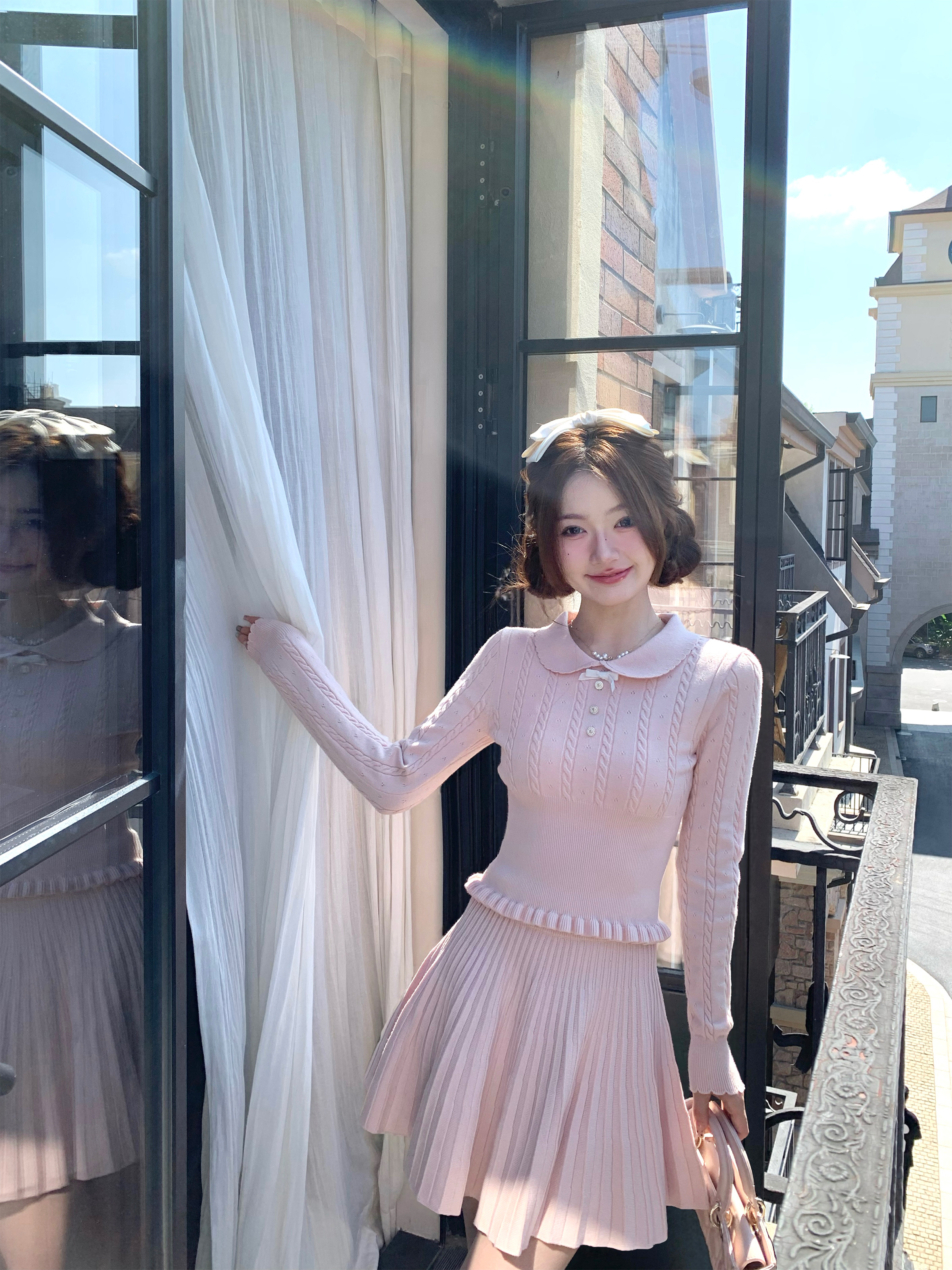 MY15774# 进修校花/千金感粉色长袖上衣针织毛衣超好看秋冬裙子套装女裝貨源服裝批發