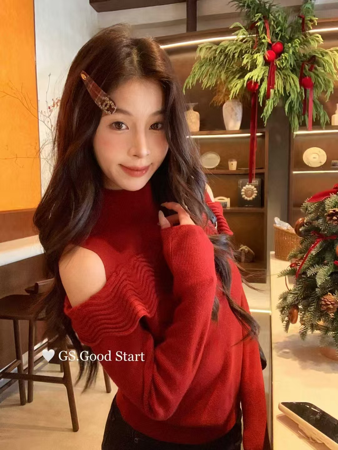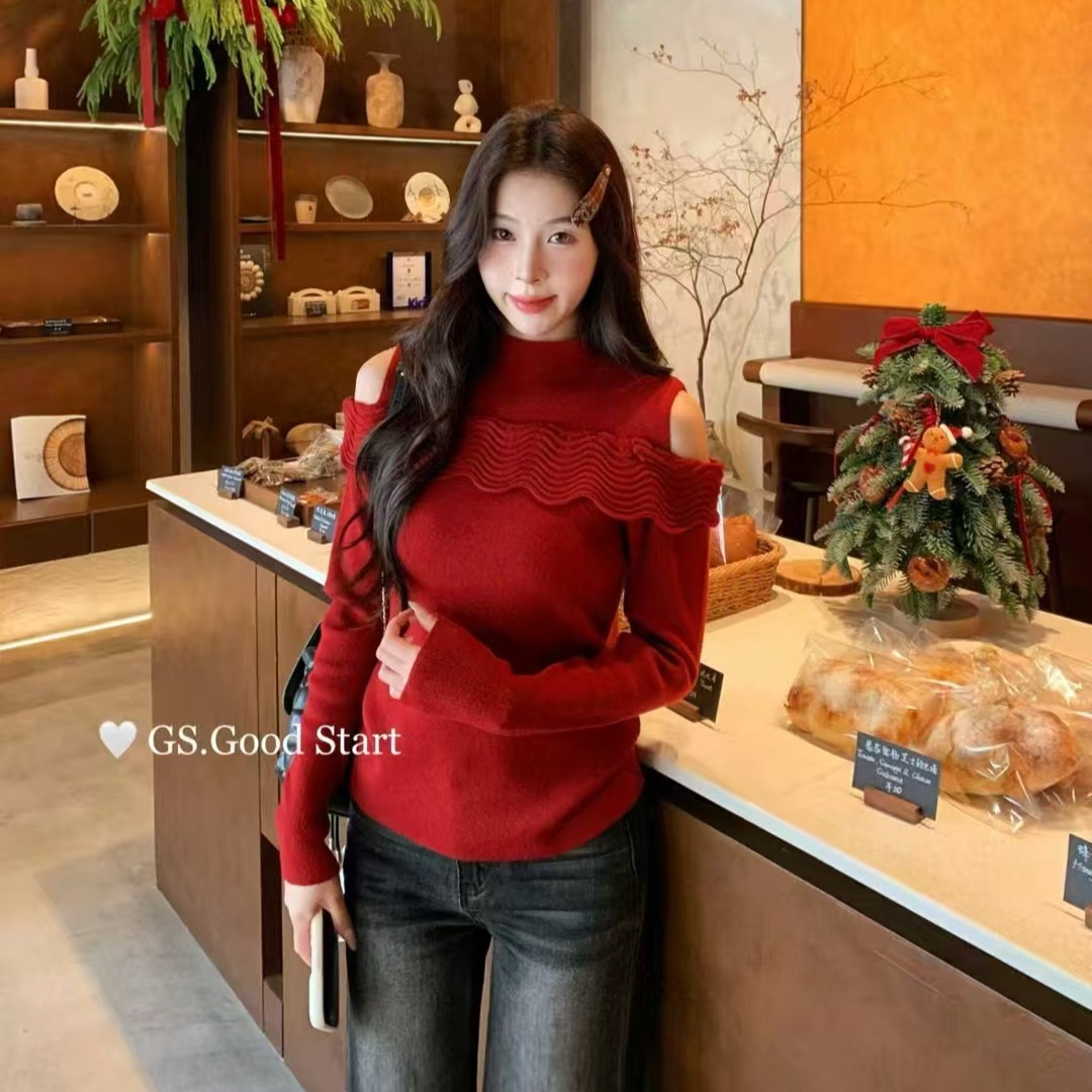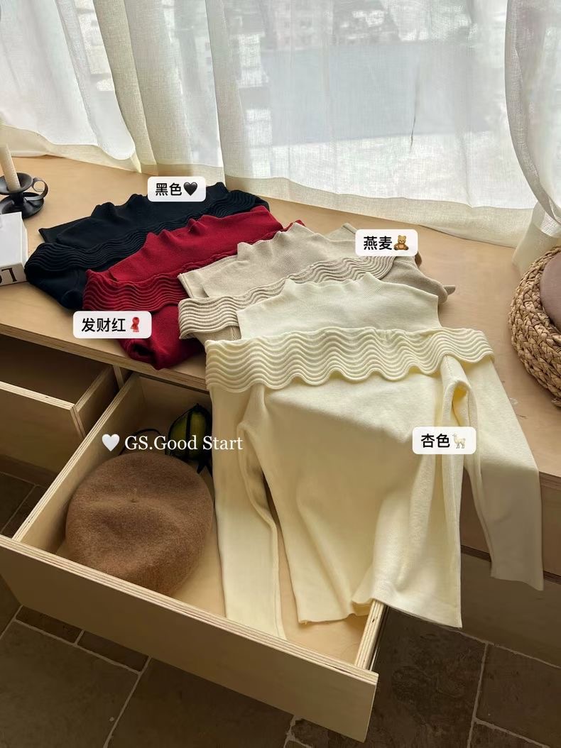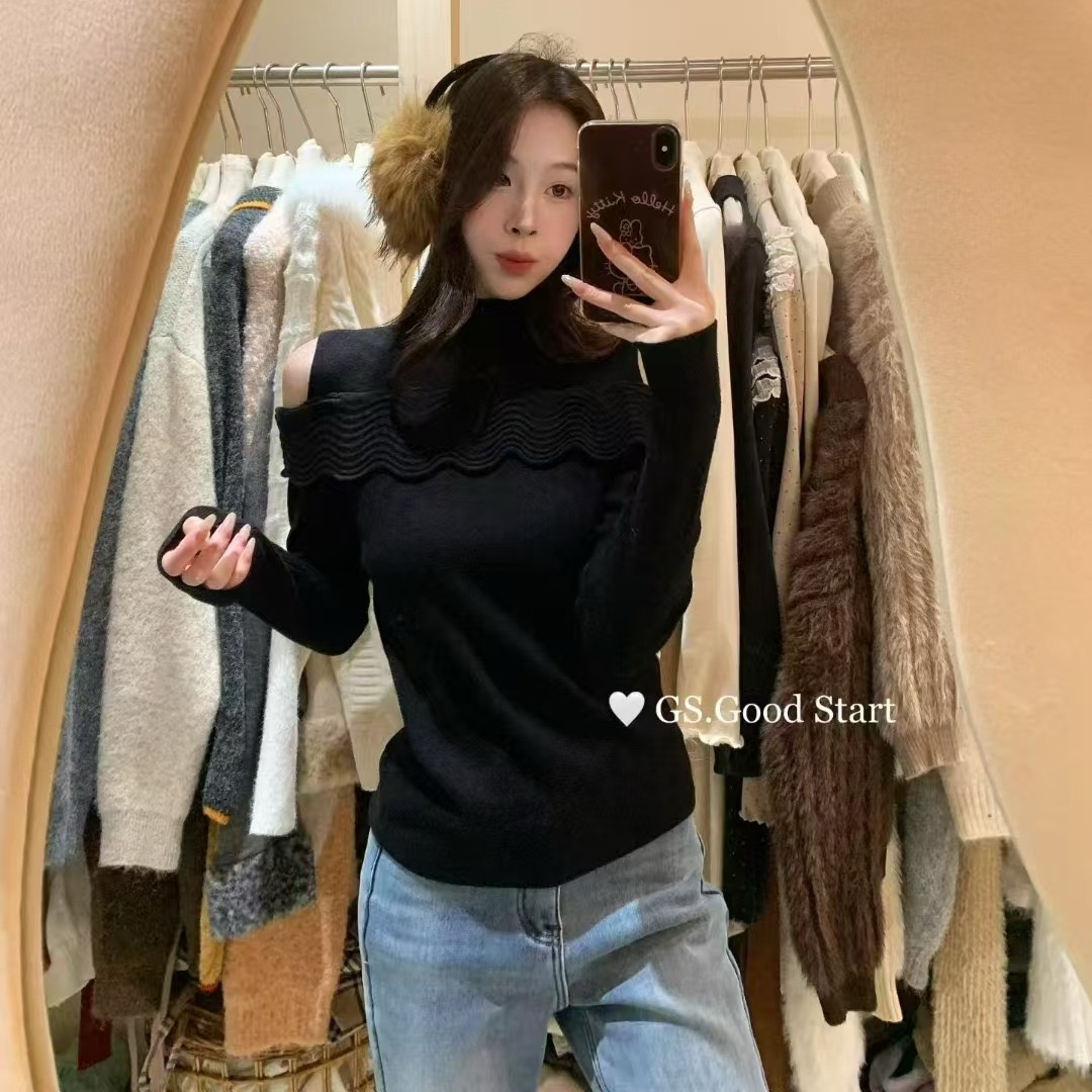 MY15776# 韩系气质设计感露肩针织上衣十三行新款半高领长袖打底衫女裝貨源服裝批發
