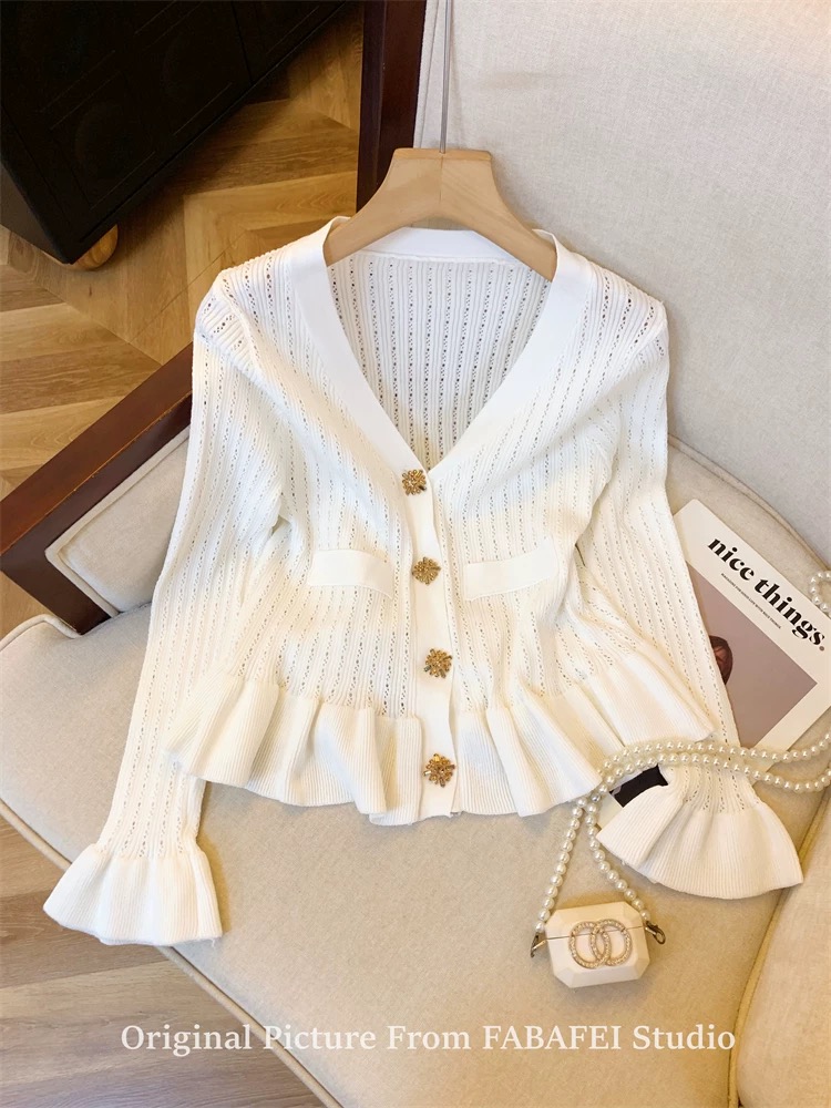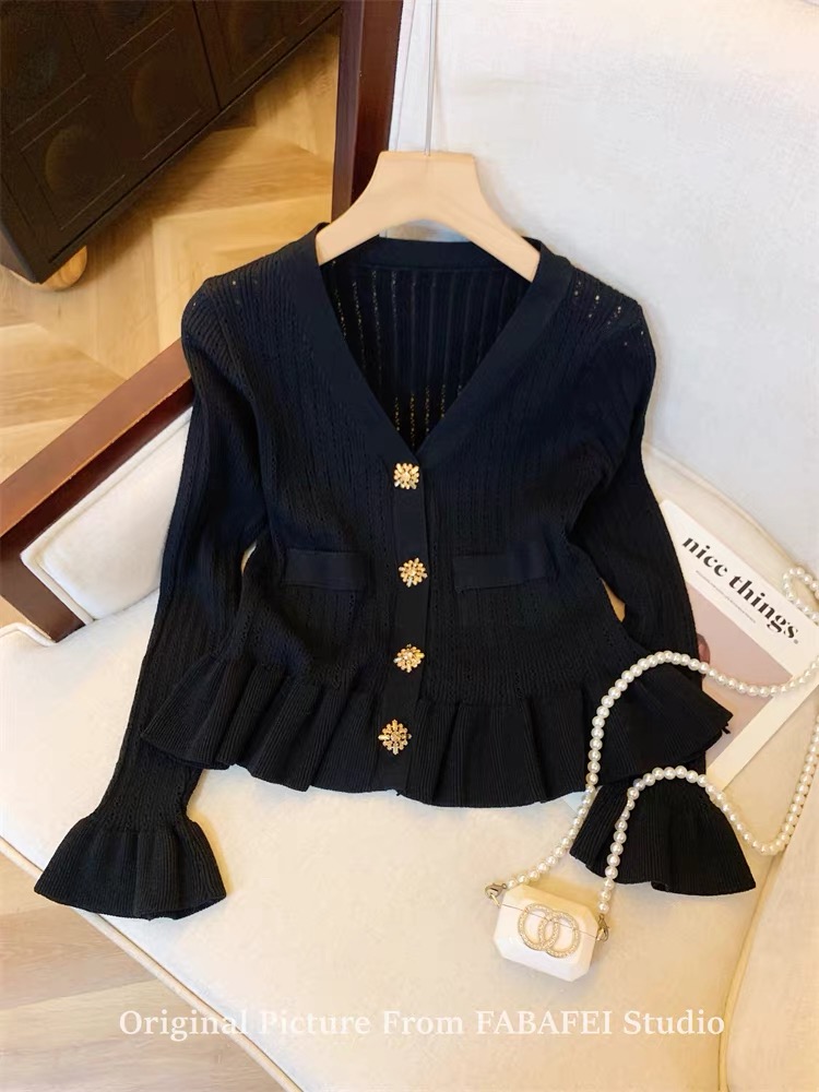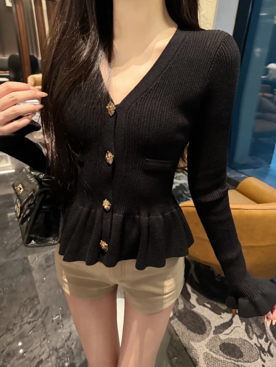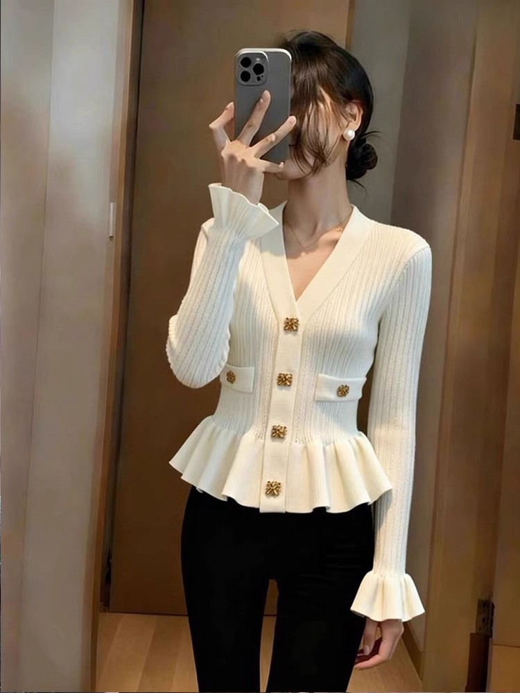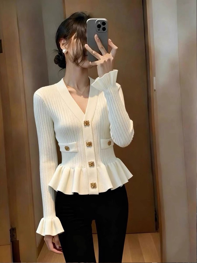 MY15777# 小香风V领荷叶边喇叭袖针织衫新款修身收腰独特漂亮上衣女裝貨源服裝批發