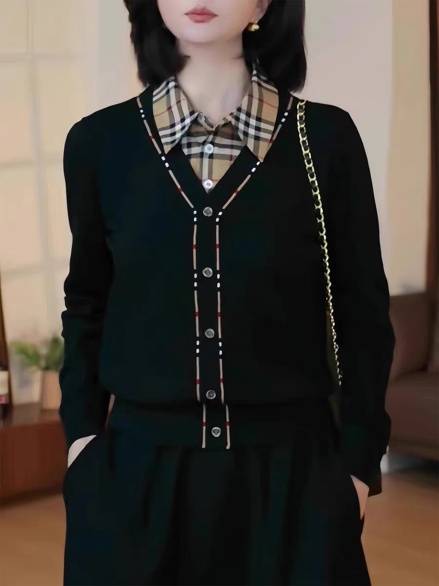 MY15779# 欧货时尚格纹翻领黑色毛衣针织开衫女秋冬新款复古高级显瘦上衣女裝貨源服裝批發