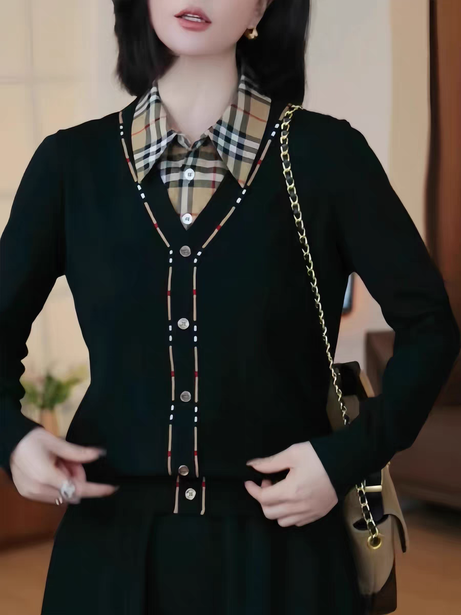 首页 > 女装批发-秋冬款 > 长袖连衣裙 > MY15779# 欧货时尚格纹翻领黑色毛衣针织开衫女秋冬新款复古高级显瘦上衣女裝貨源服裝批發