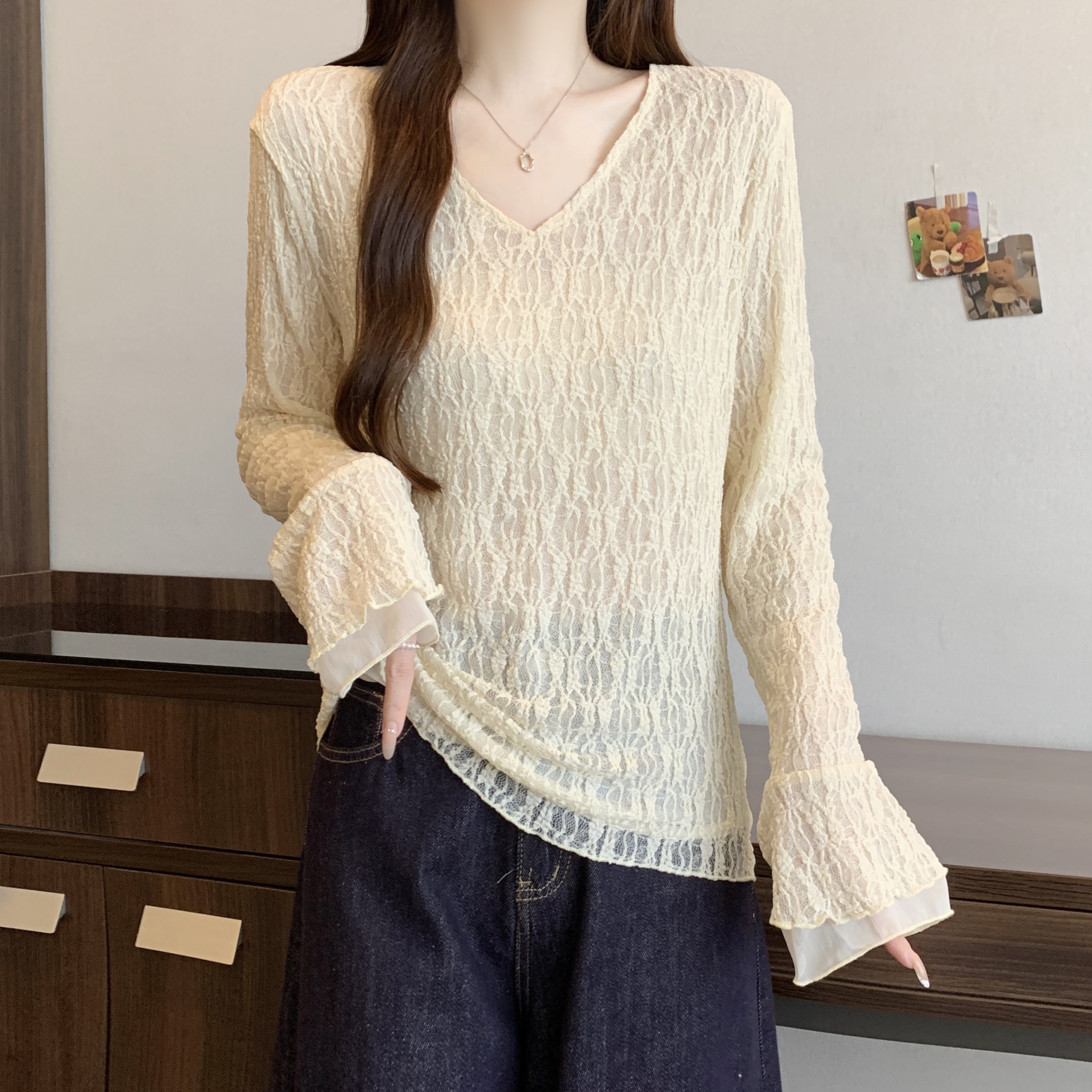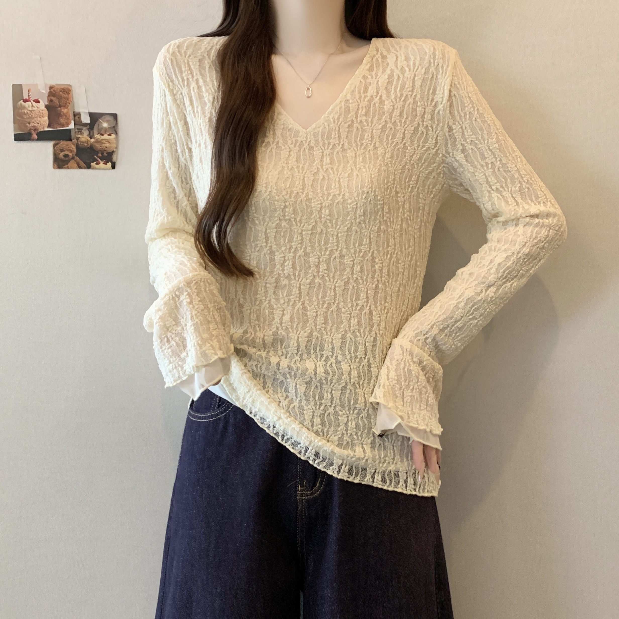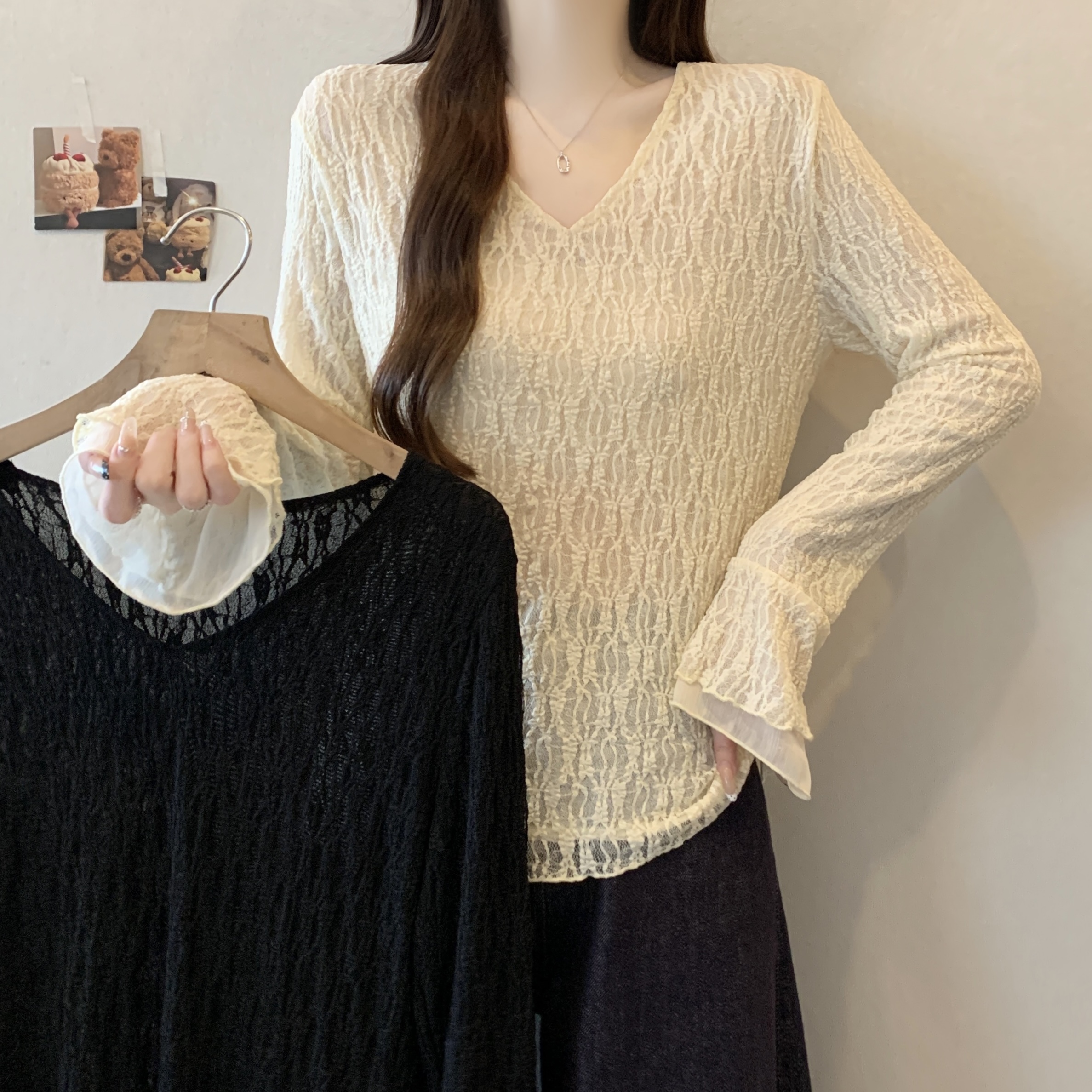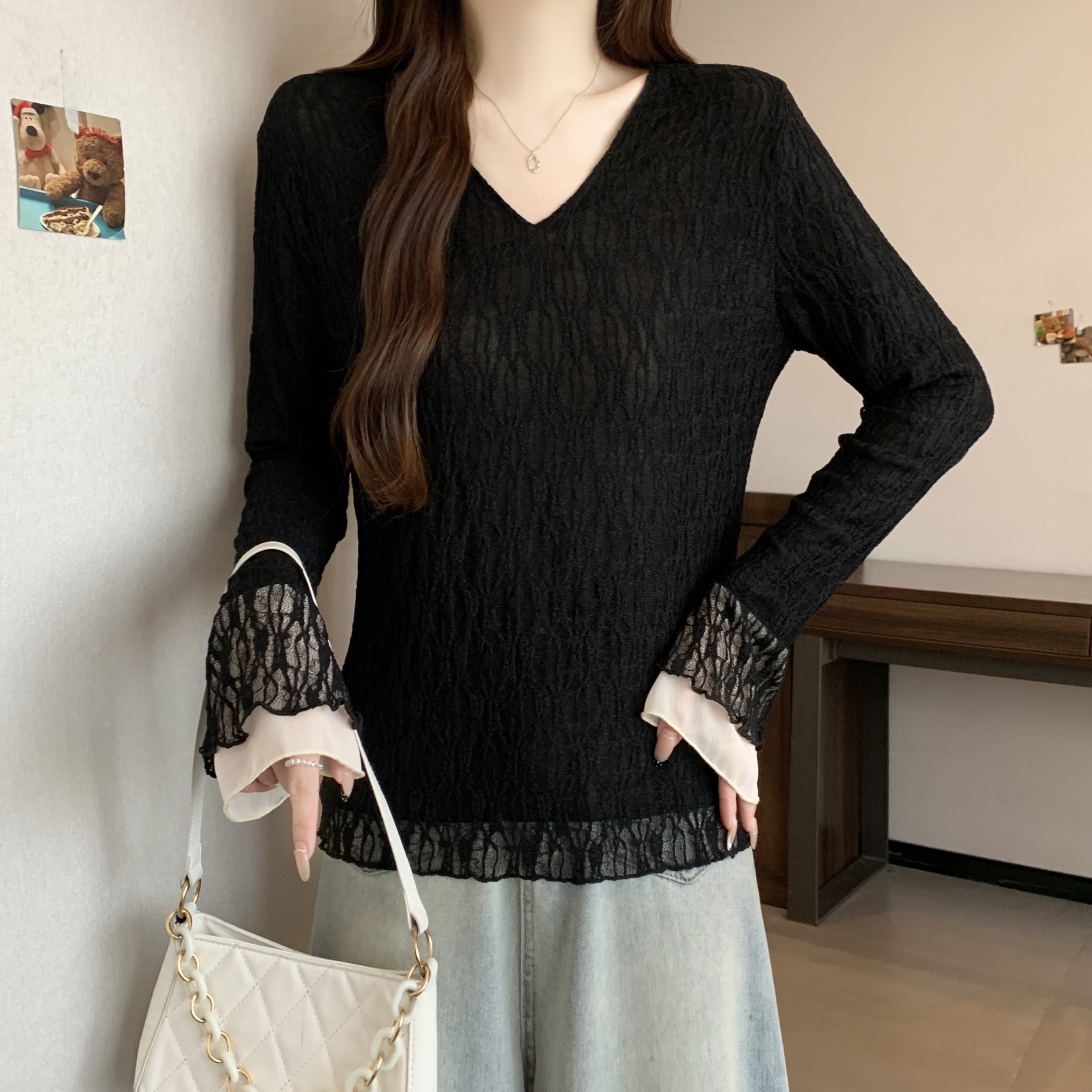 MY15795# 大码女装法式V领温柔气质蕾丝上衣喇叭袖正肩洋气减龄上衣女裝貨源服裝批發