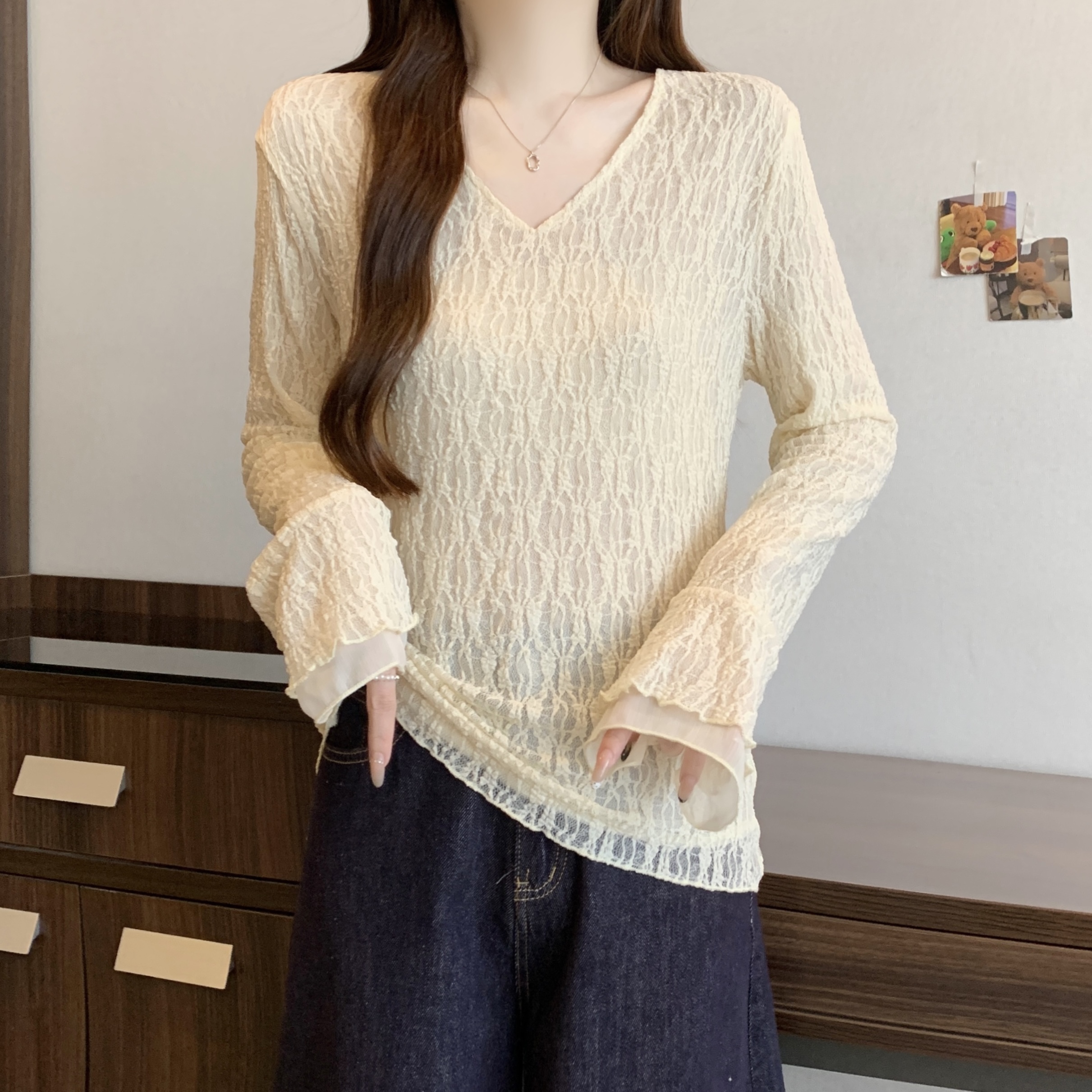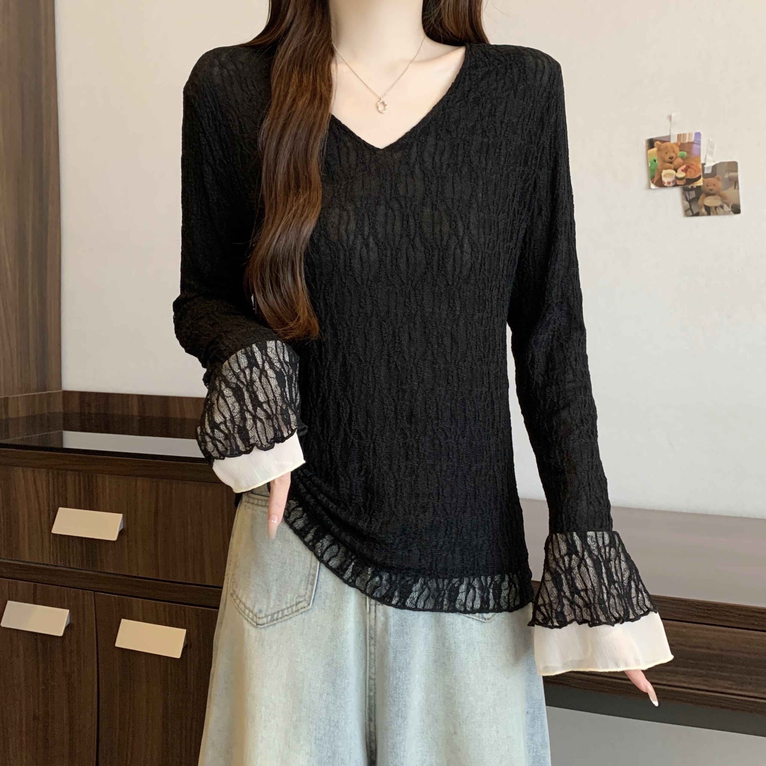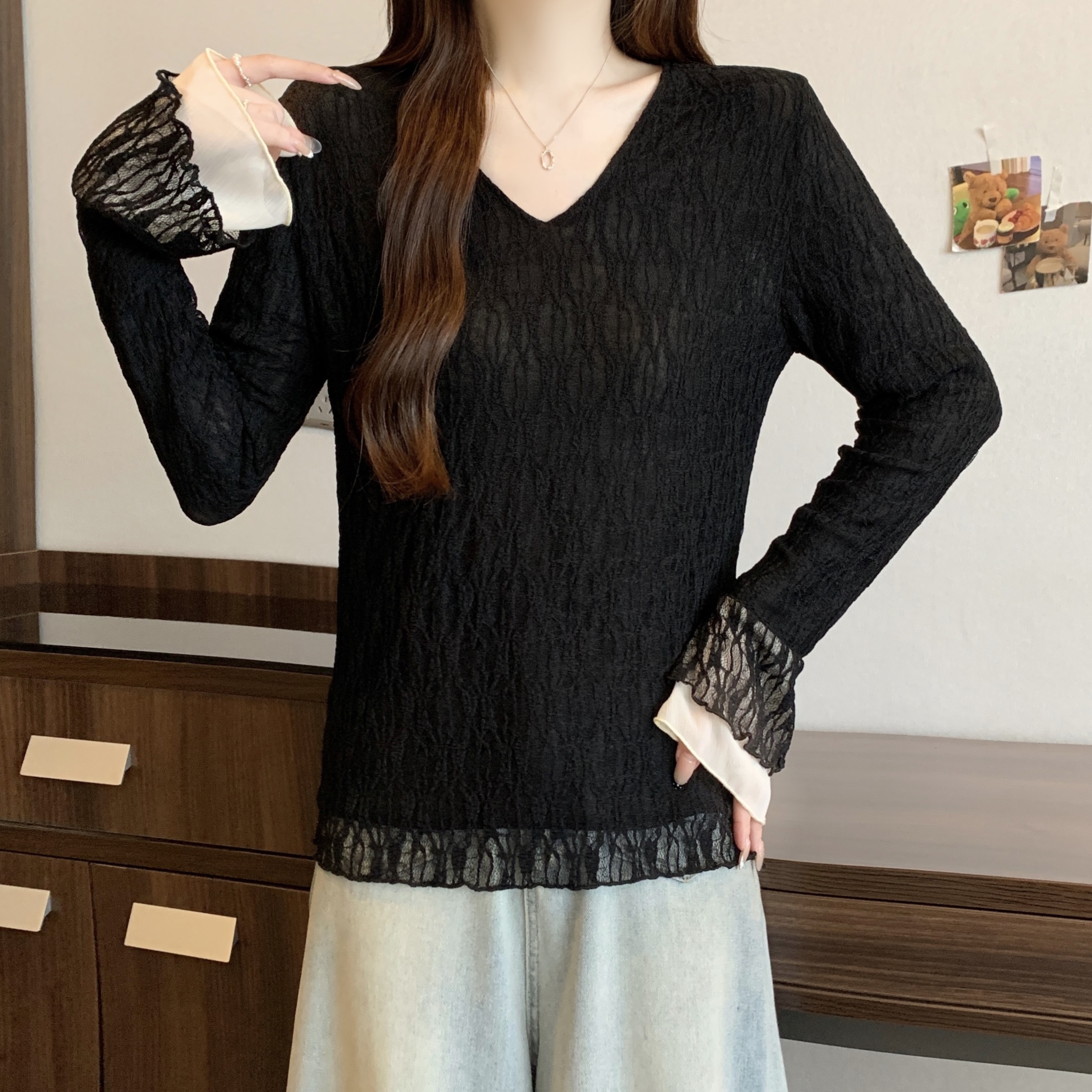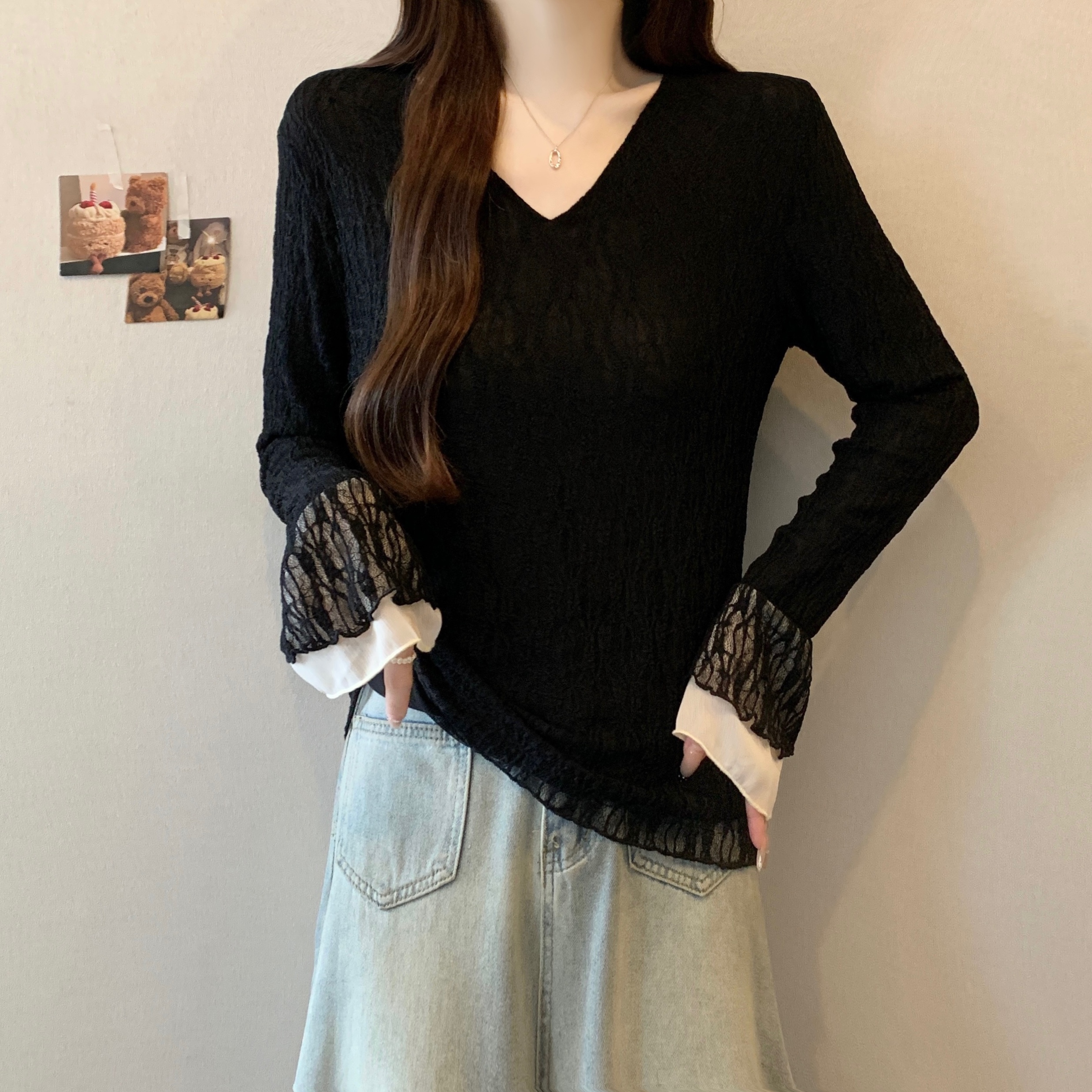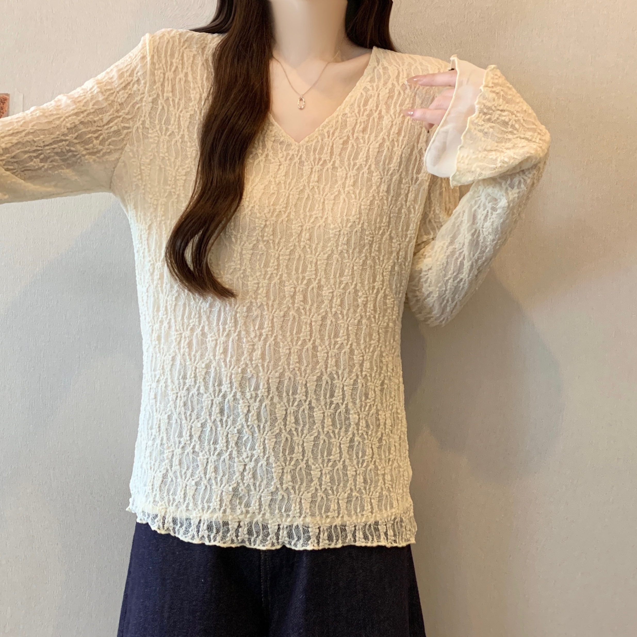 MY15795# 大码女装法式V领温柔气质蕾丝上衣喇叭袖正肩洋气减龄上衣女裝貨源服裝批發