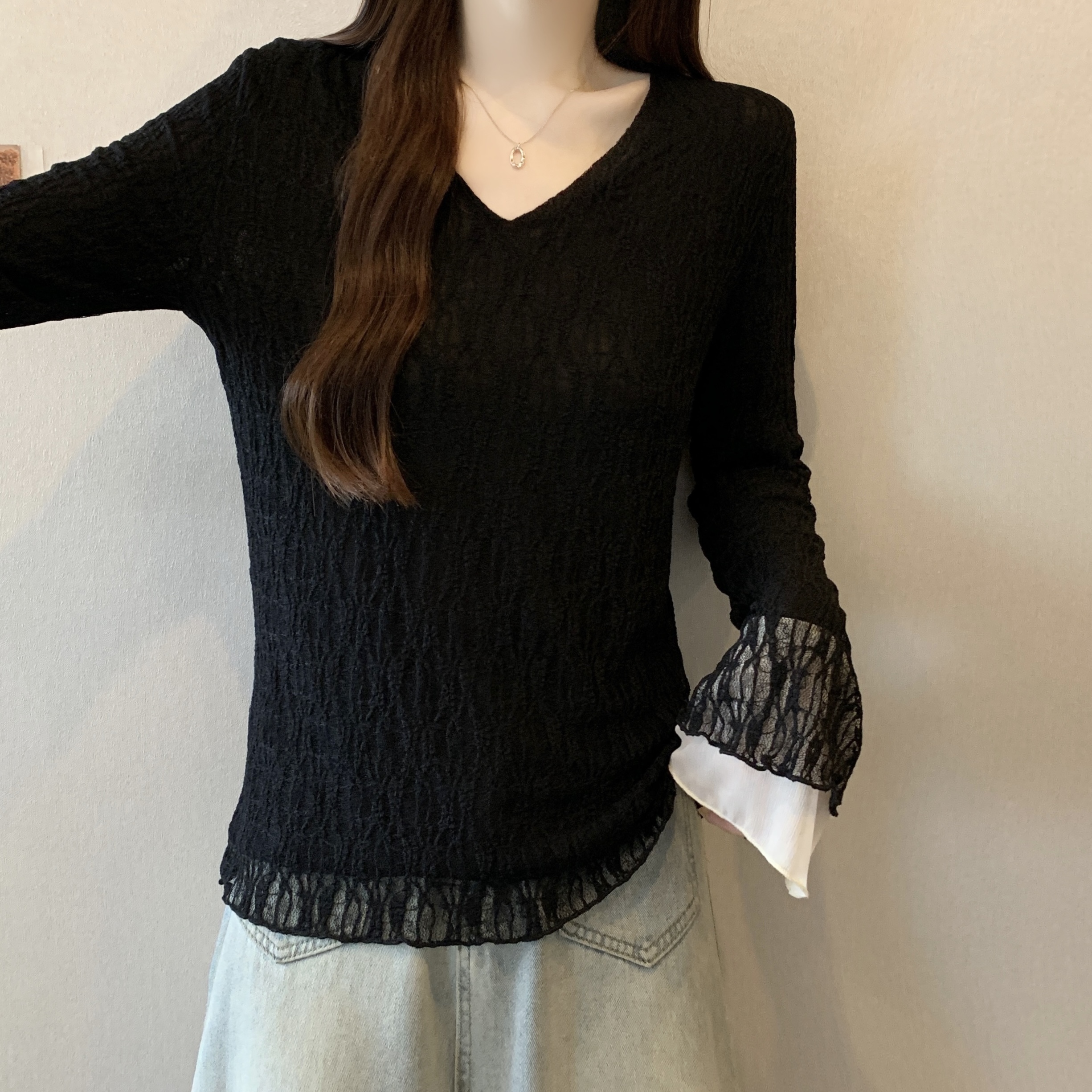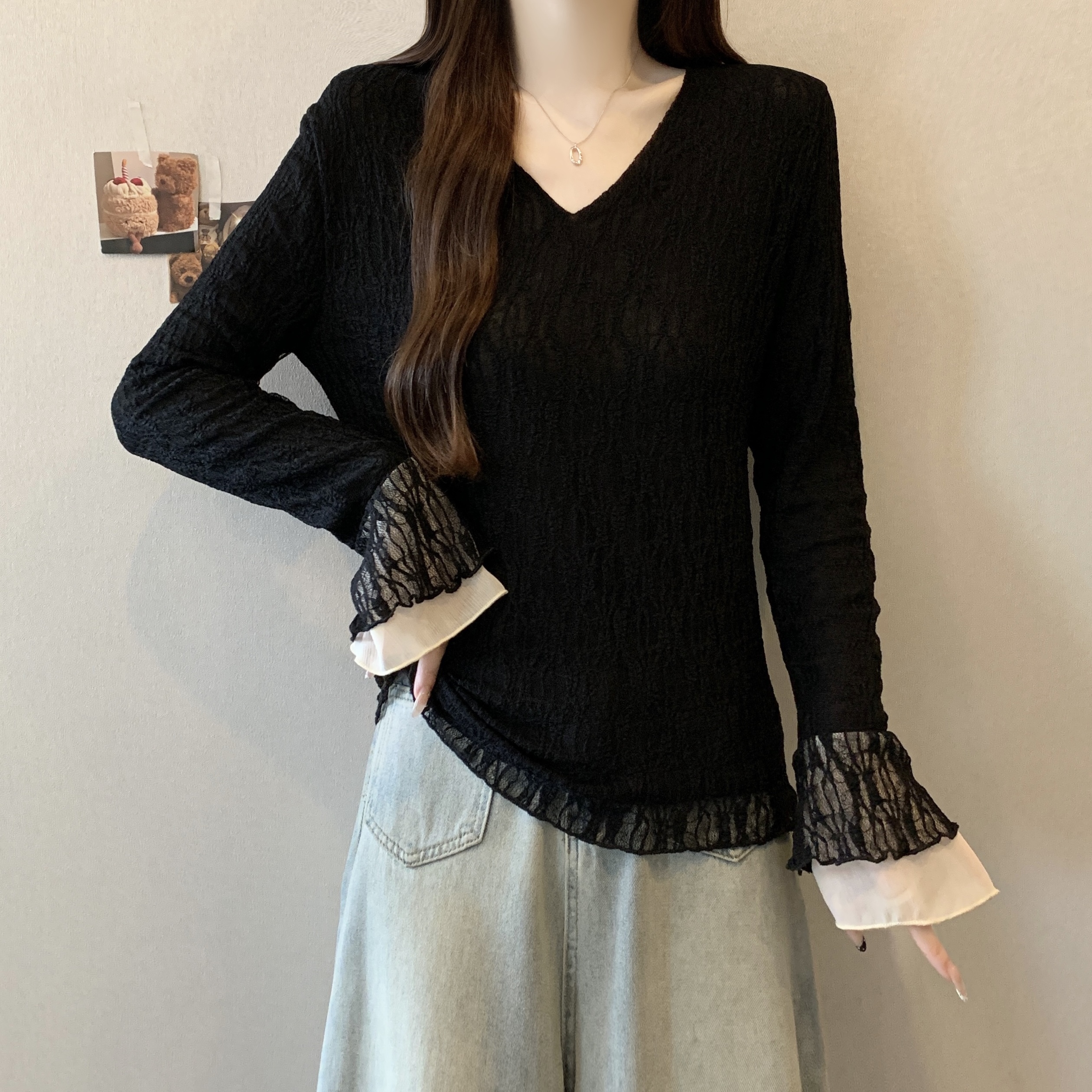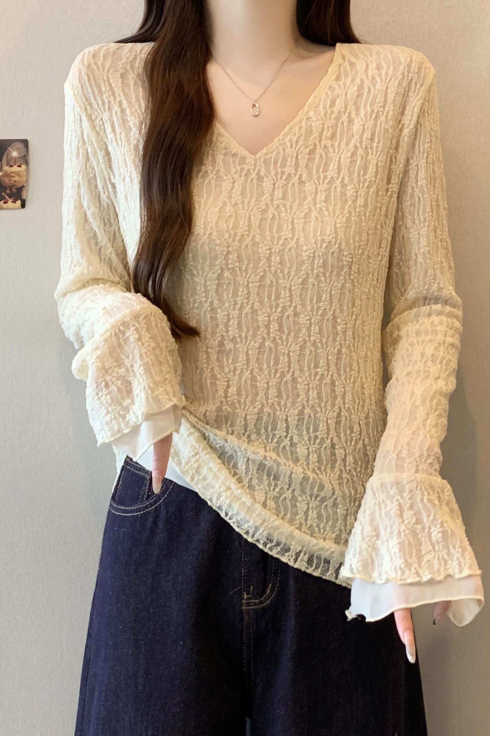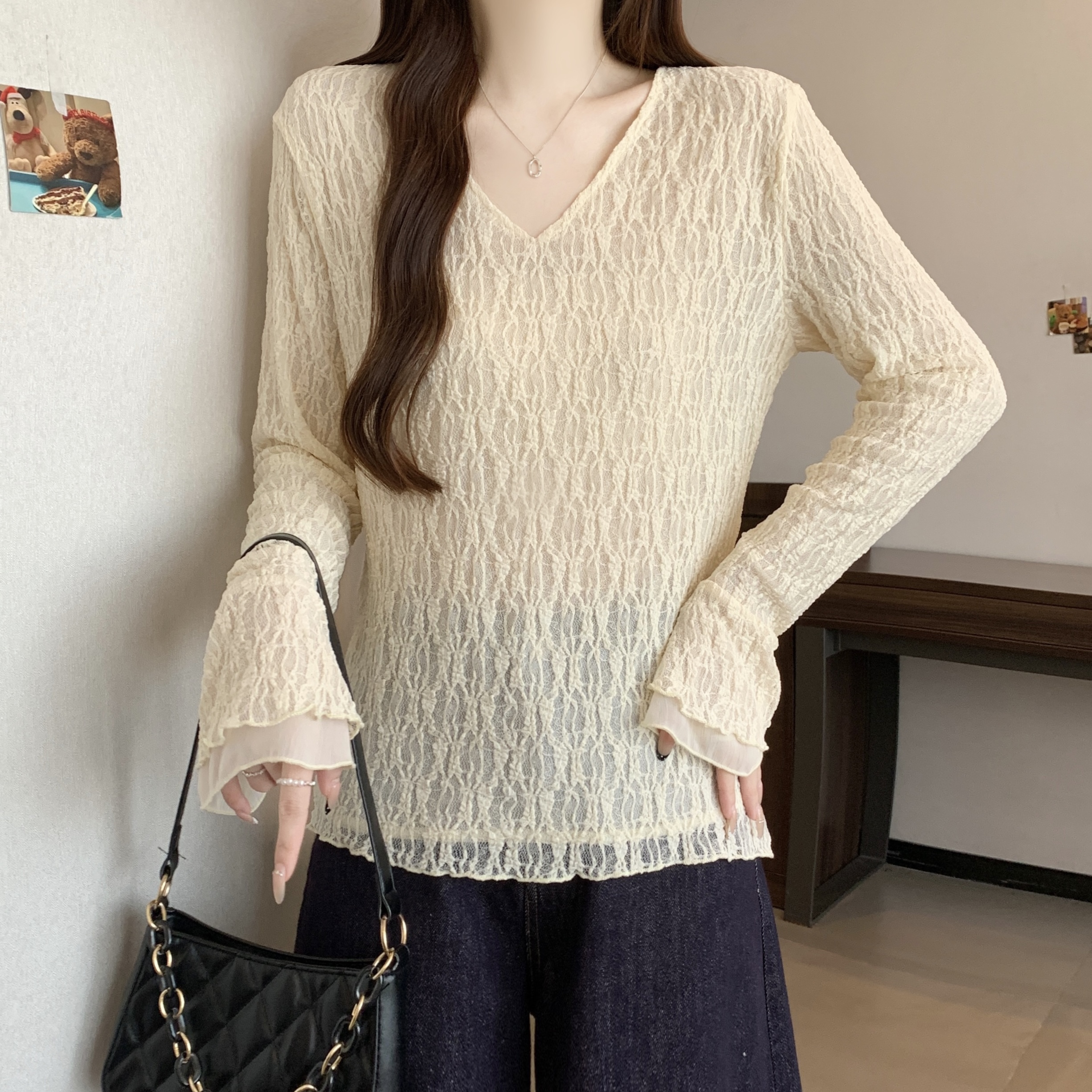 MY15795# 大码女装法式V领温柔气质蕾丝上衣喇叭袖正肩洋气减龄上衣女裝貨源服裝批發