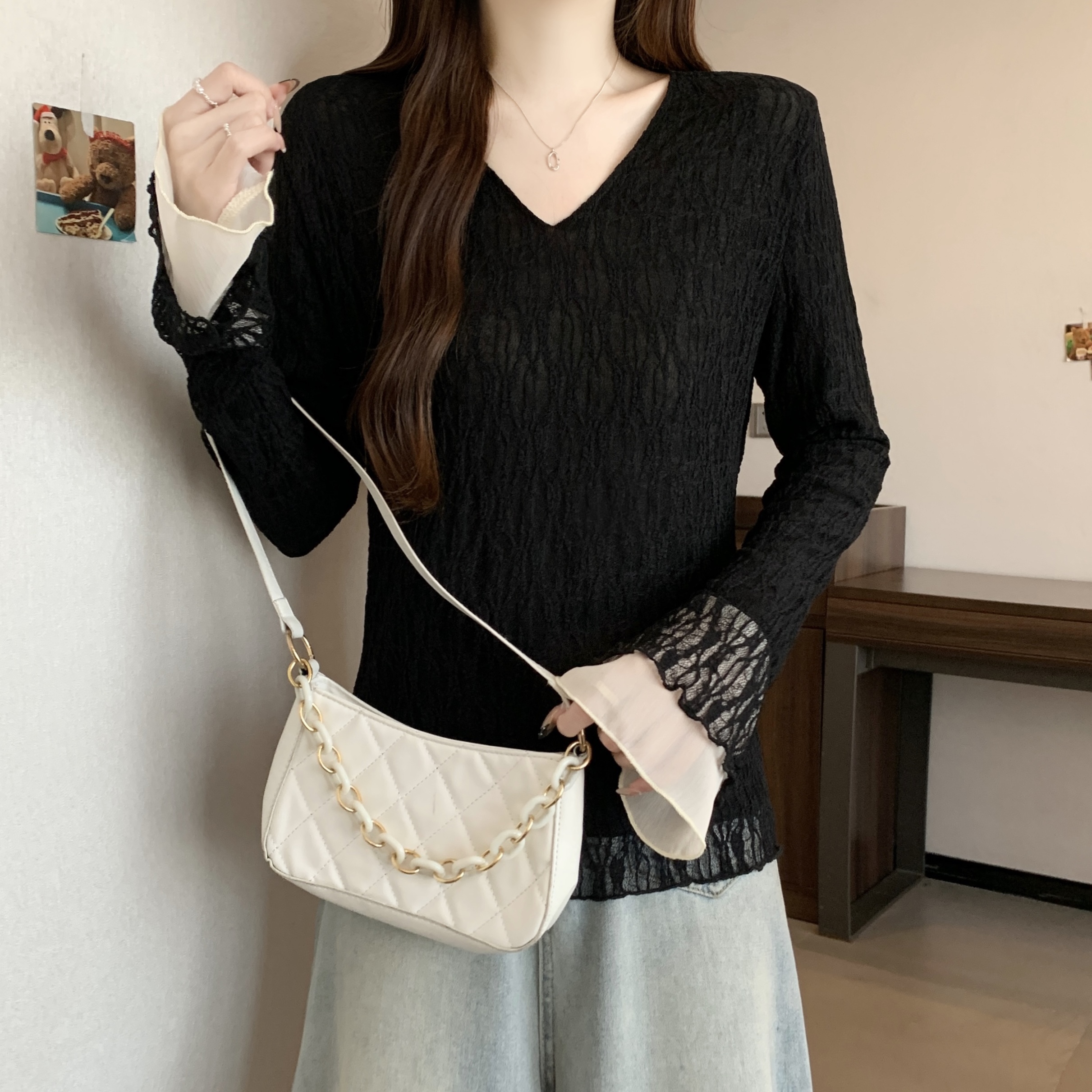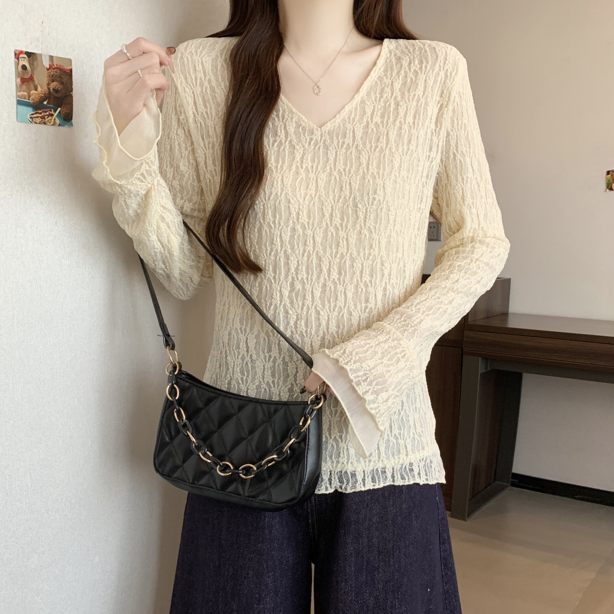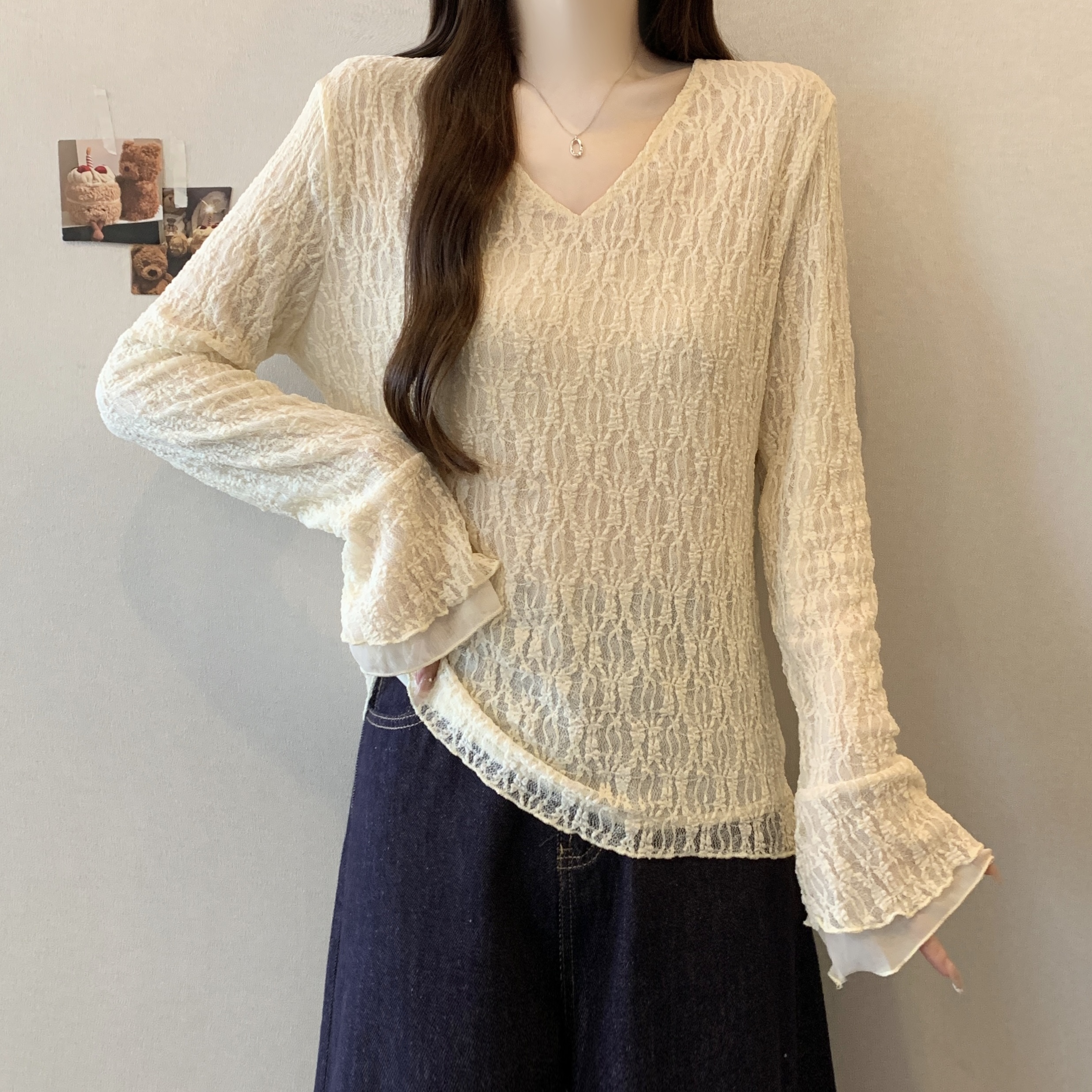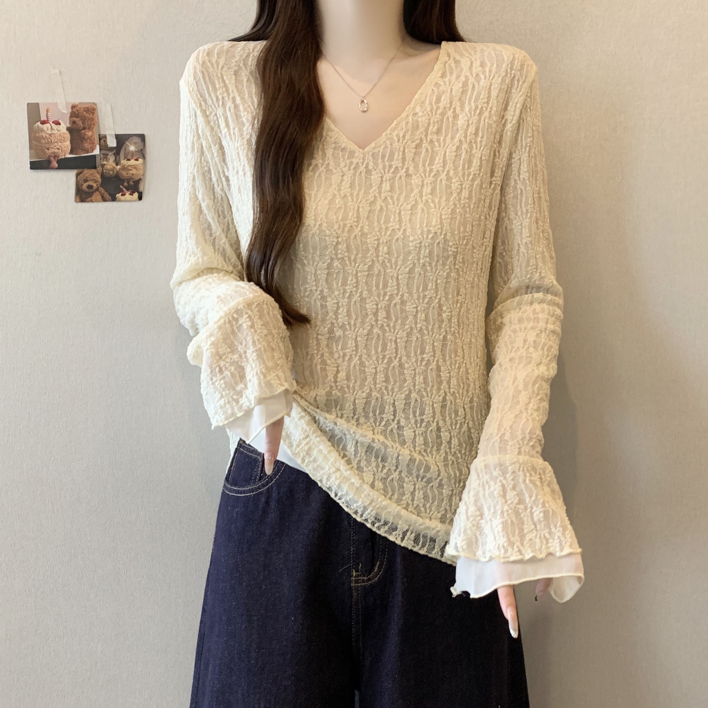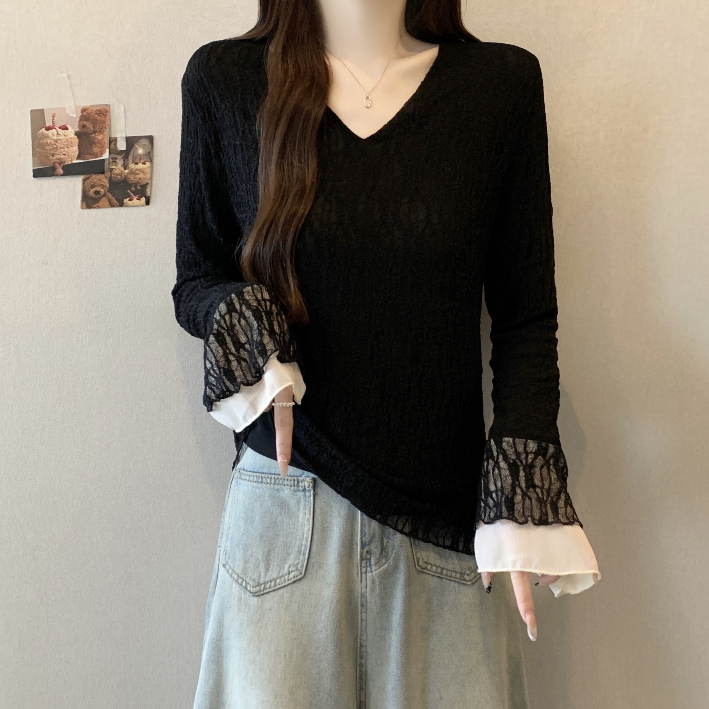 MY15795# 大码女装法式V领温柔气质蕾丝上衣喇叭袖正肩洋气减龄上衣女裝貨源服裝批發