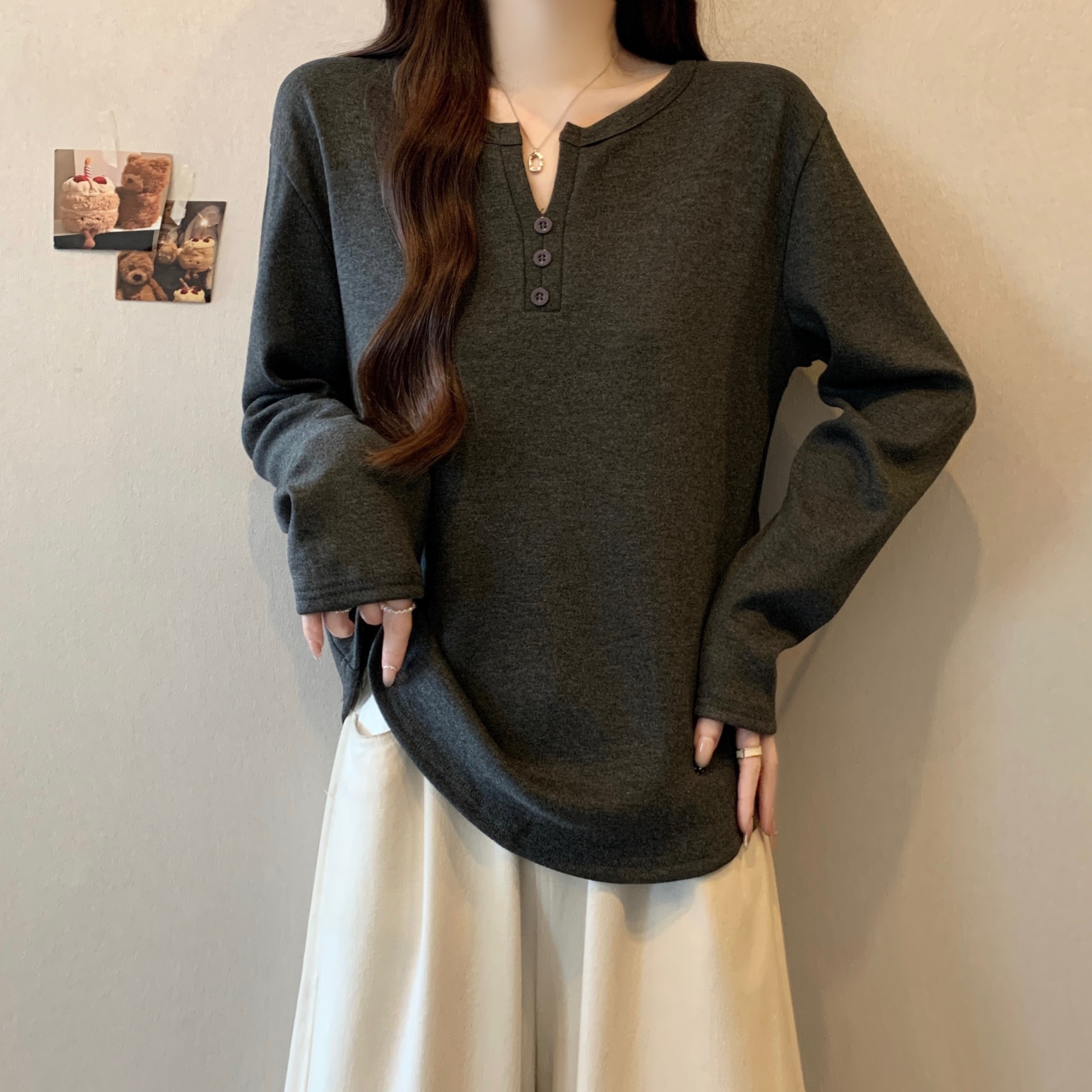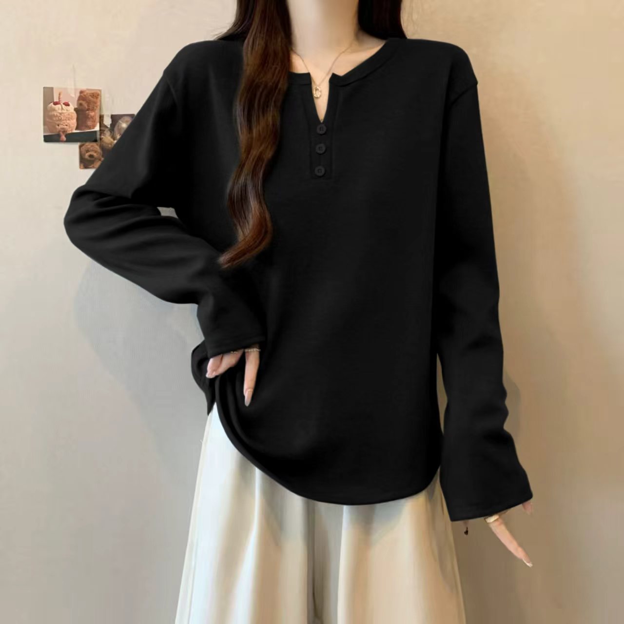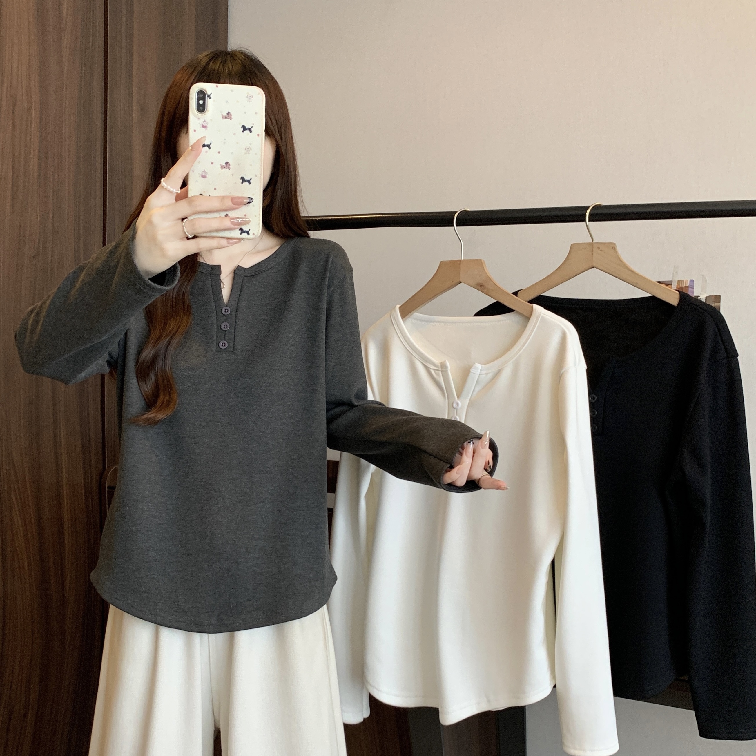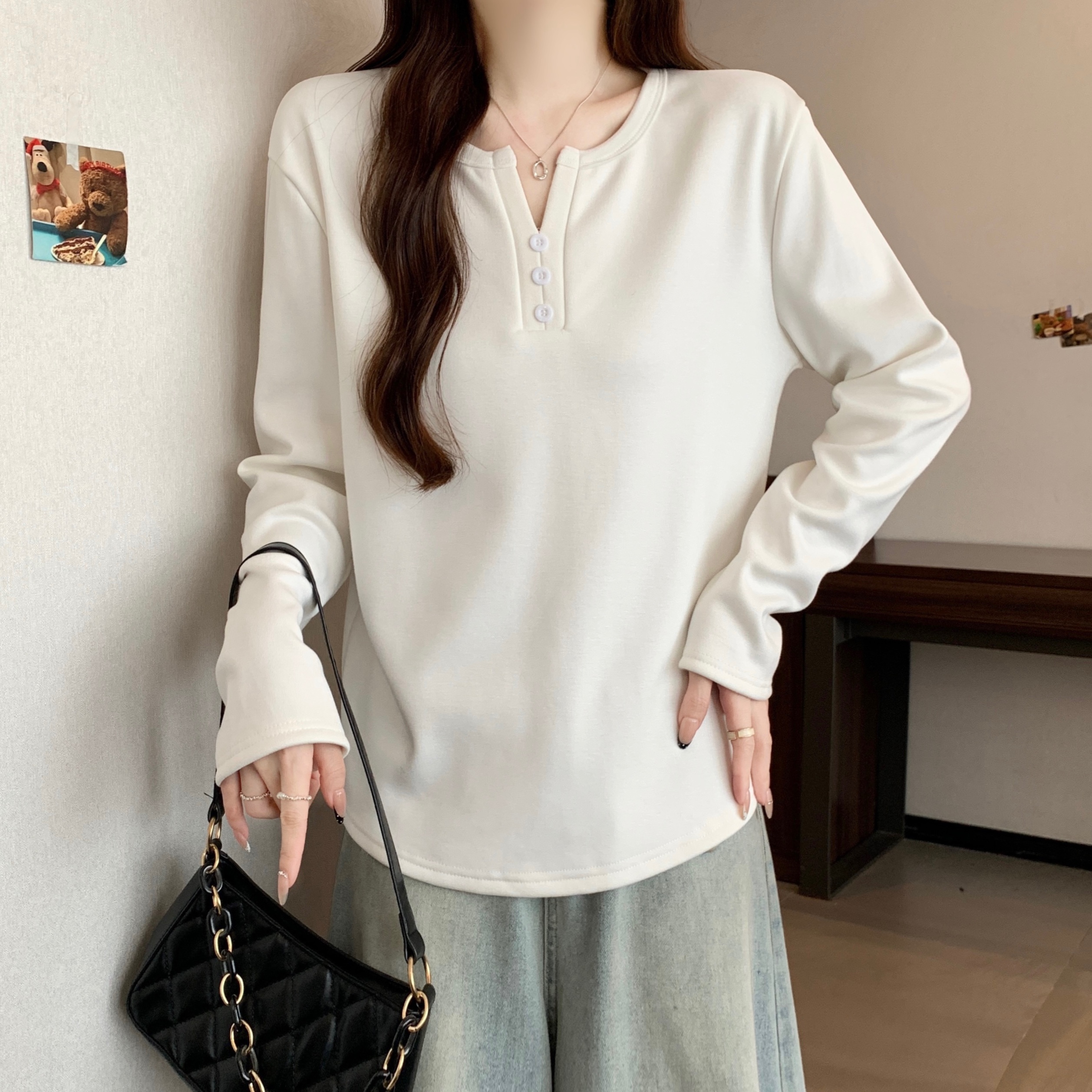 MY15796# 大码女装新款V领长袖正肩加绒加厚打底衫显瘦上衣女裝貨源服裝批發