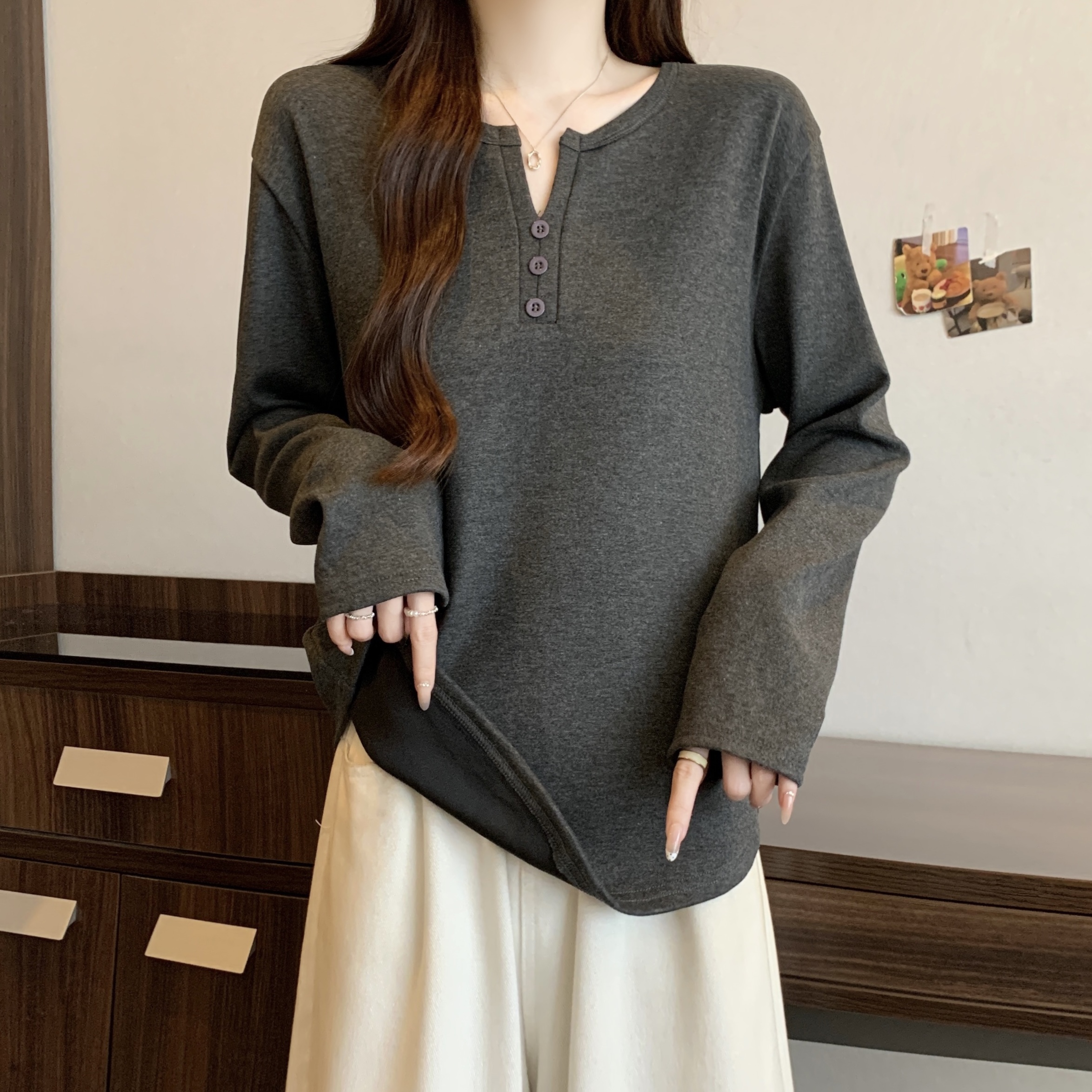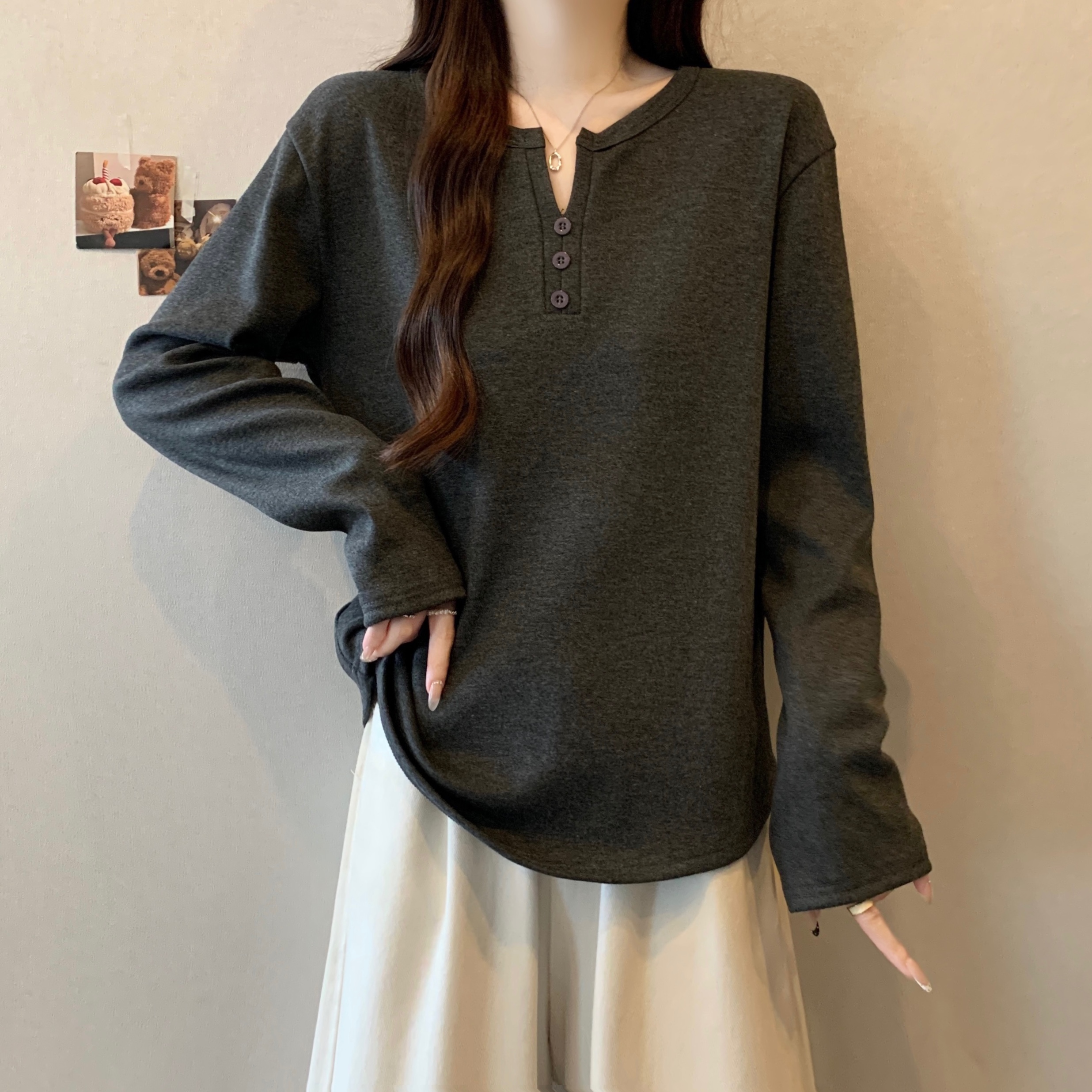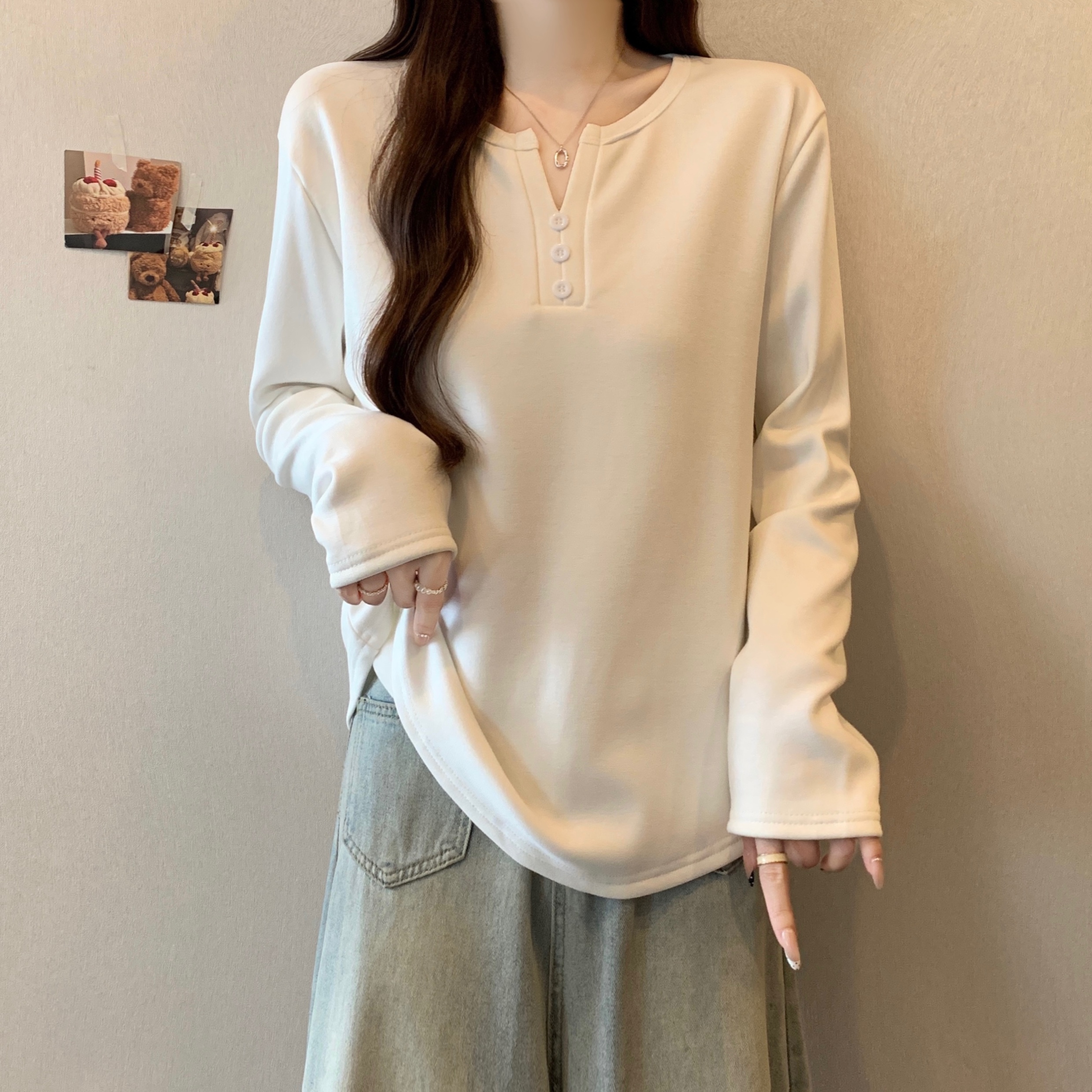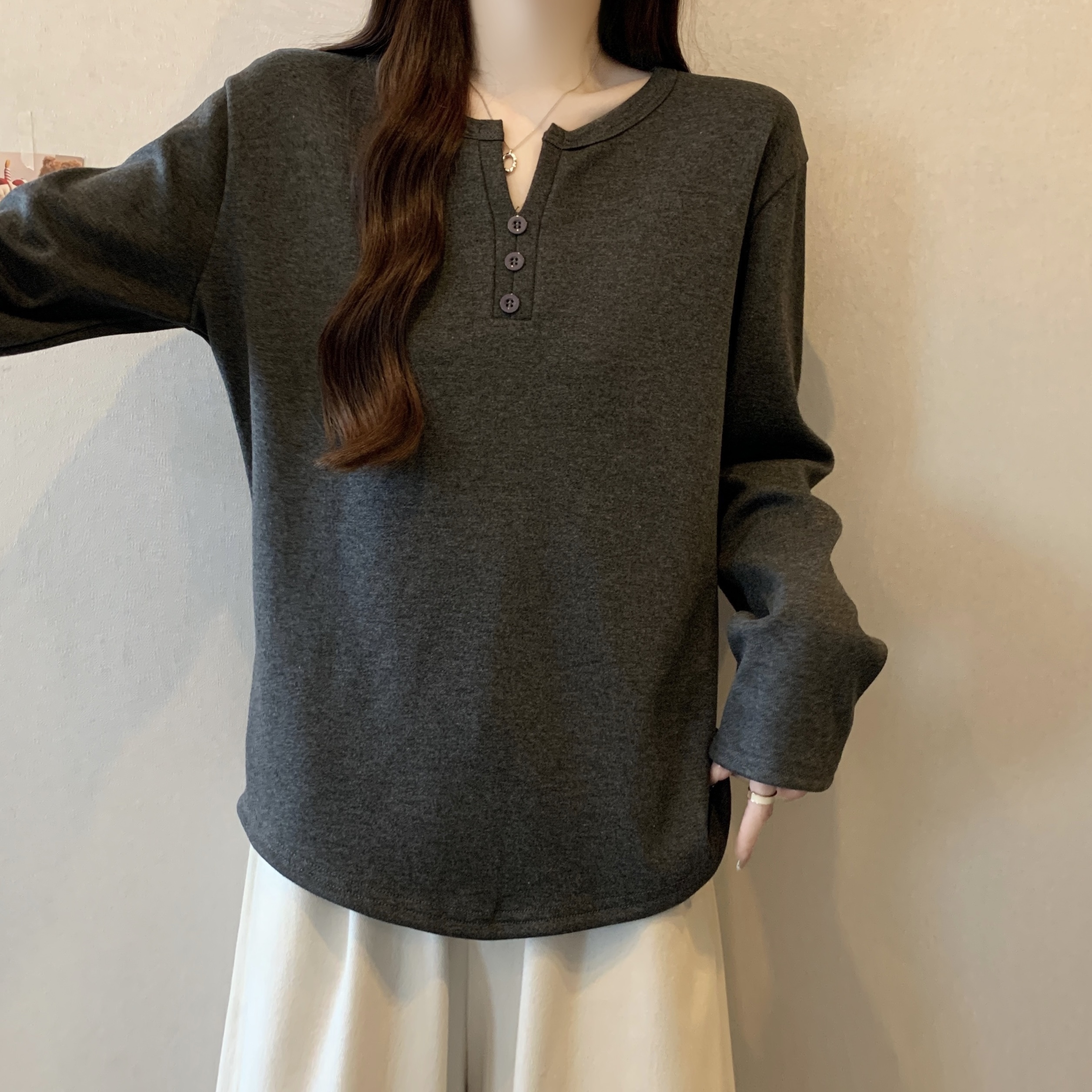 MY15796# 大码女装新款V领长袖正肩加绒加厚打底衫显瘦上衣女裝貨源服裝批發