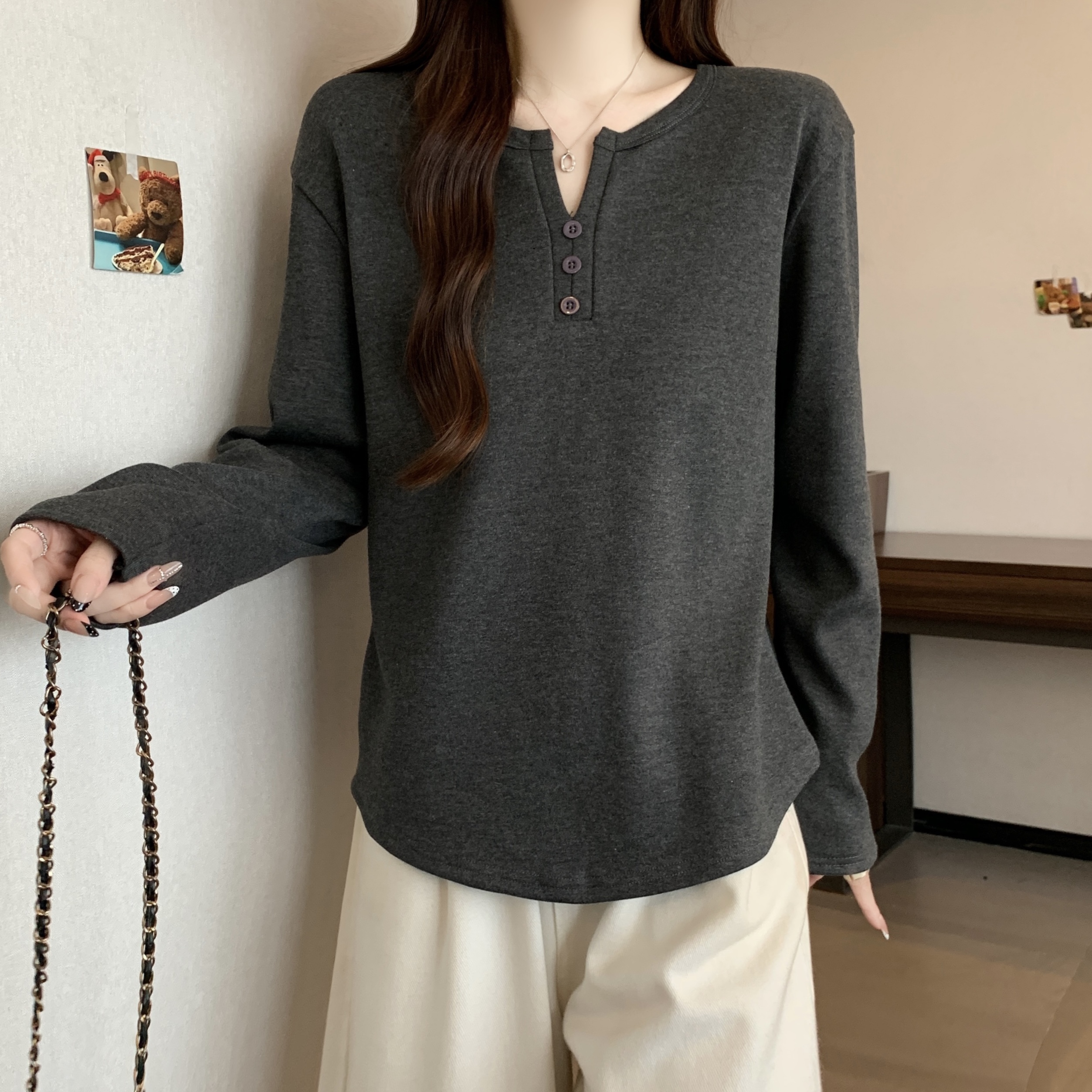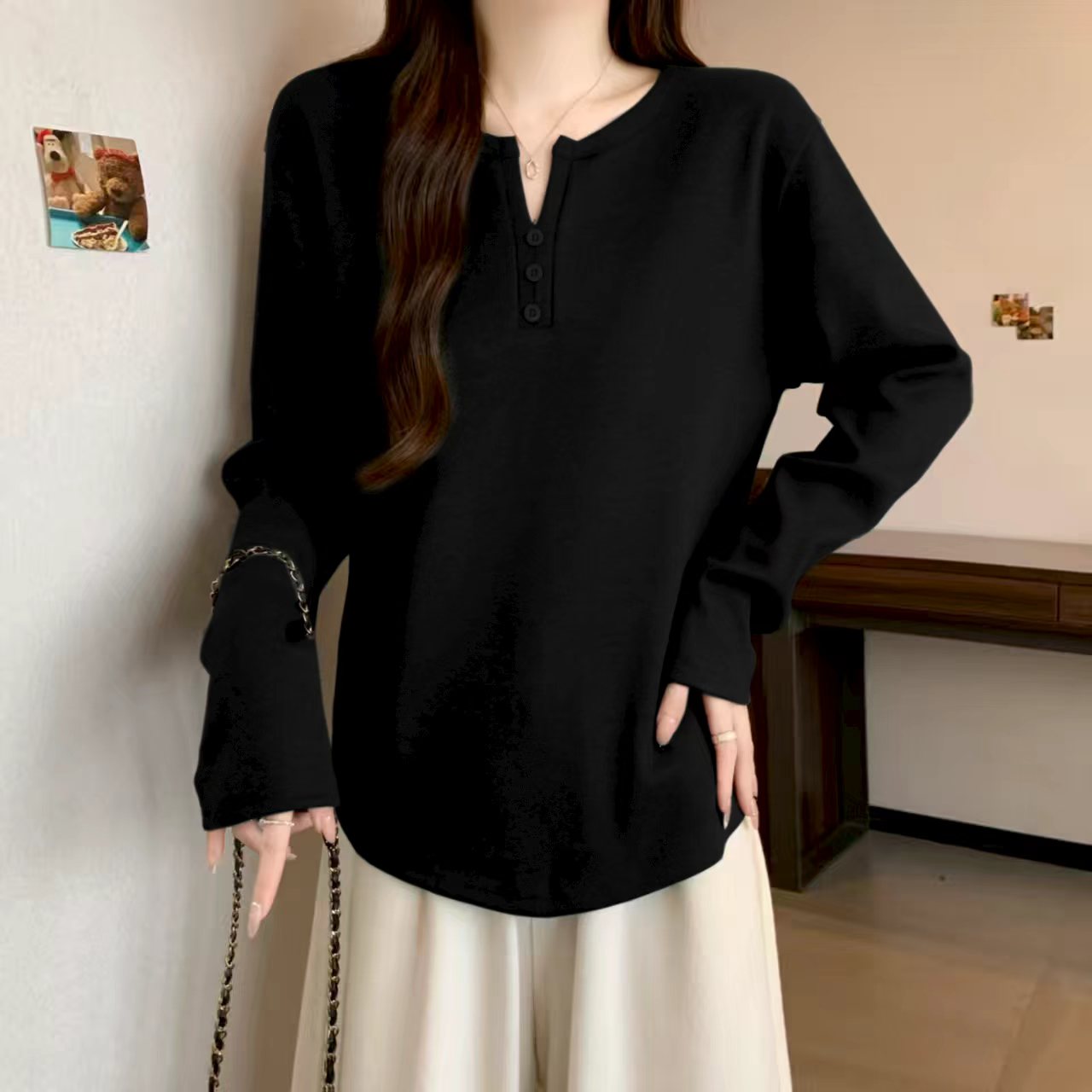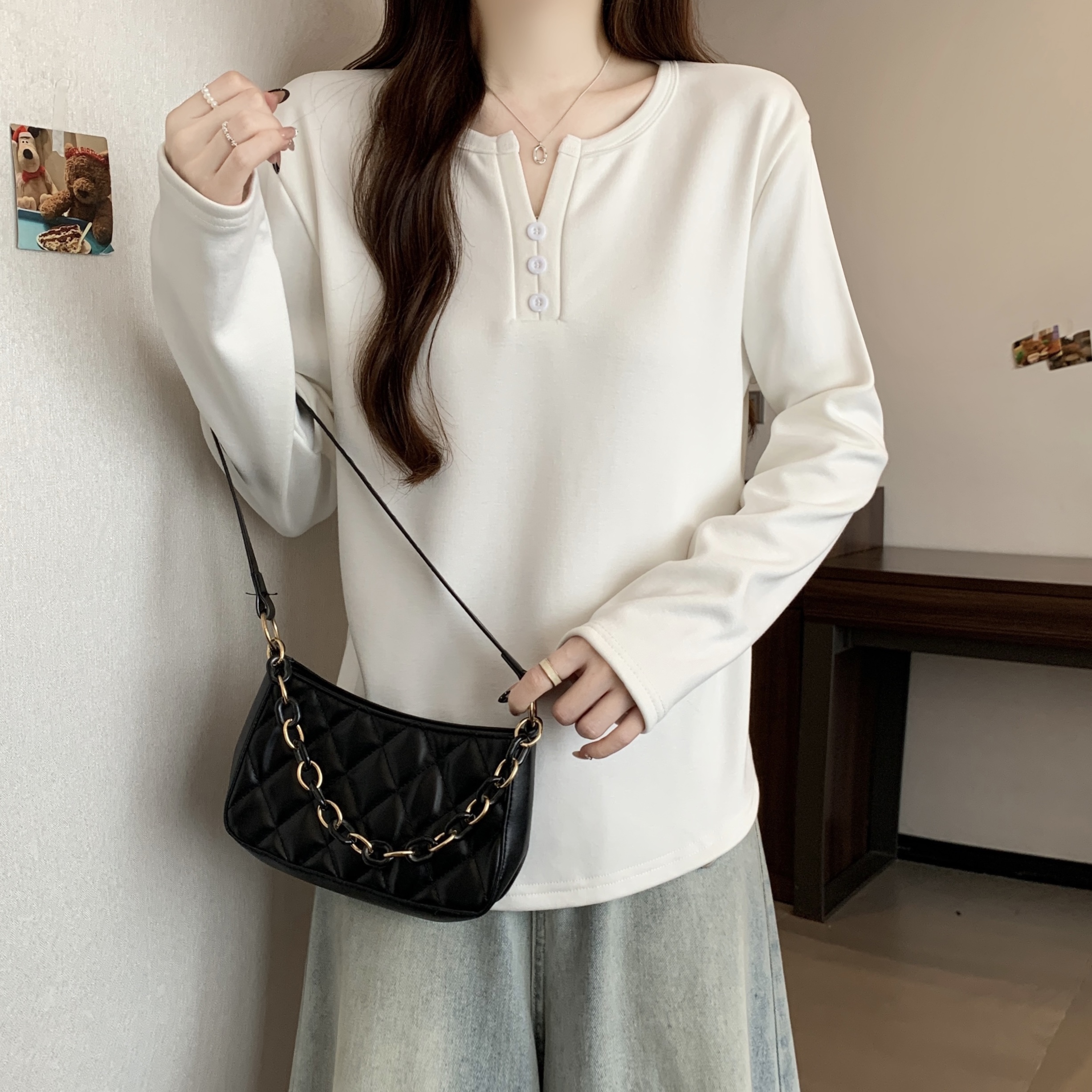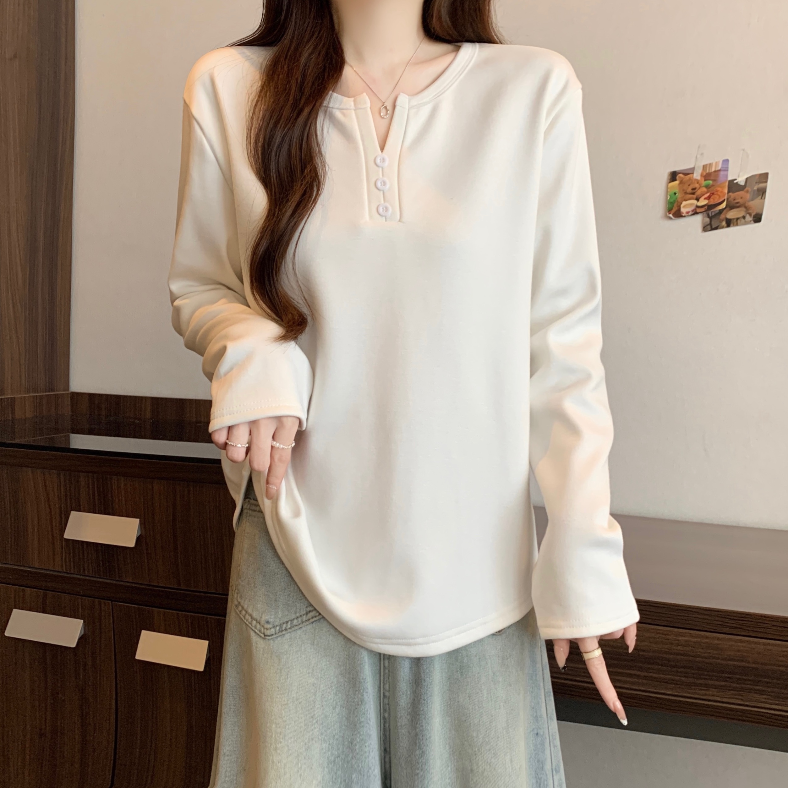MY15796# 大码女装新款V领长袖正肩加绒加厚打底衫显瘦上衣女裝貨源服裝批發