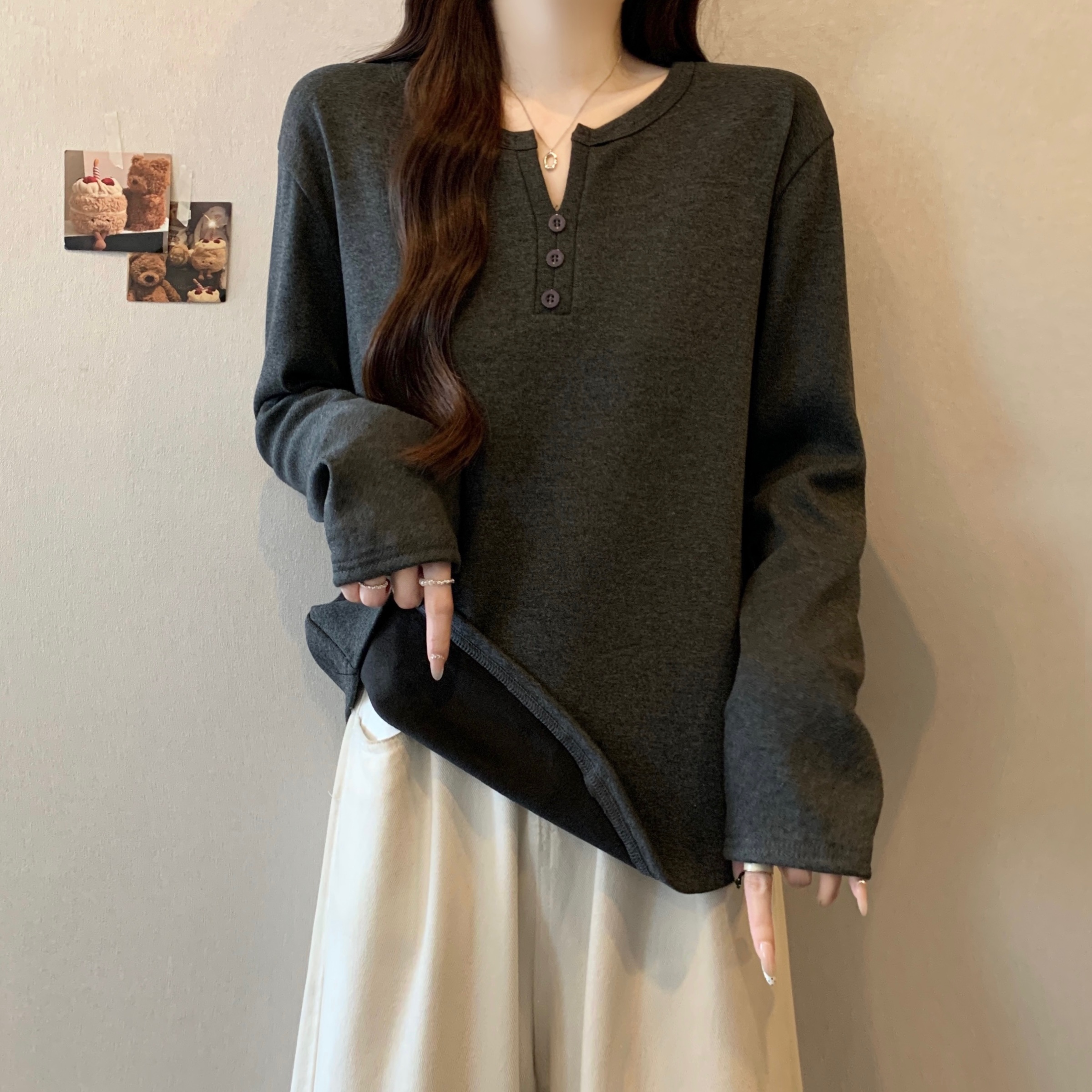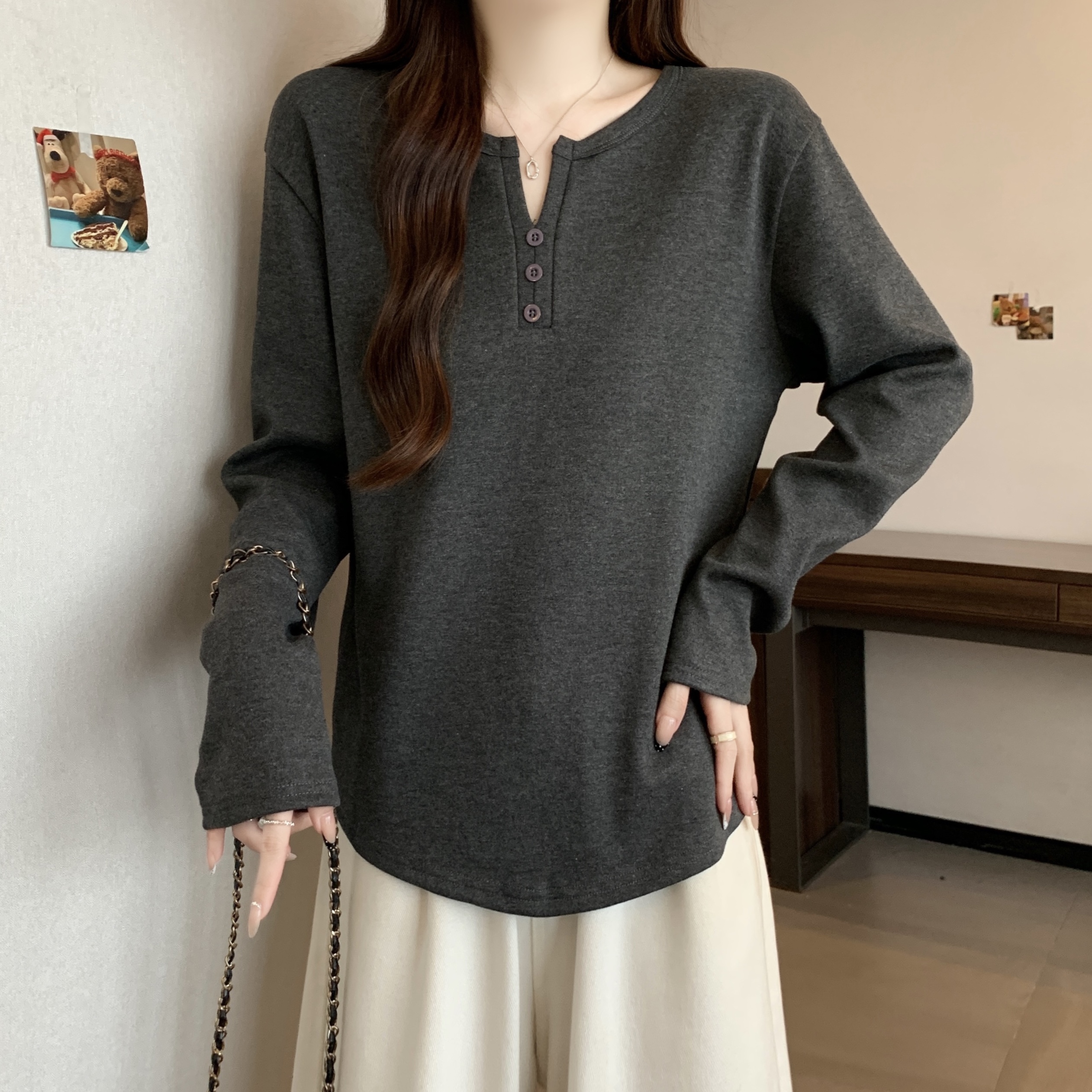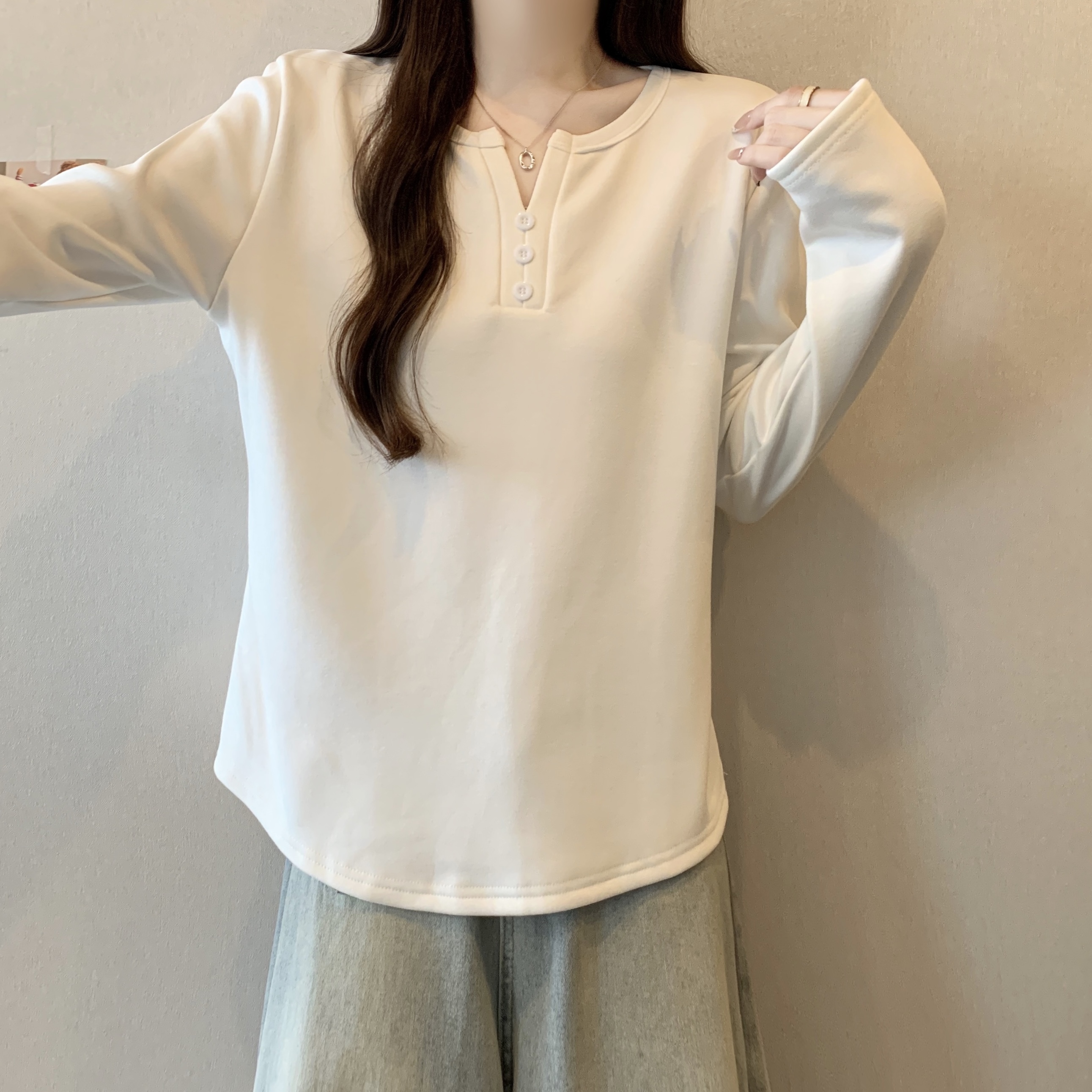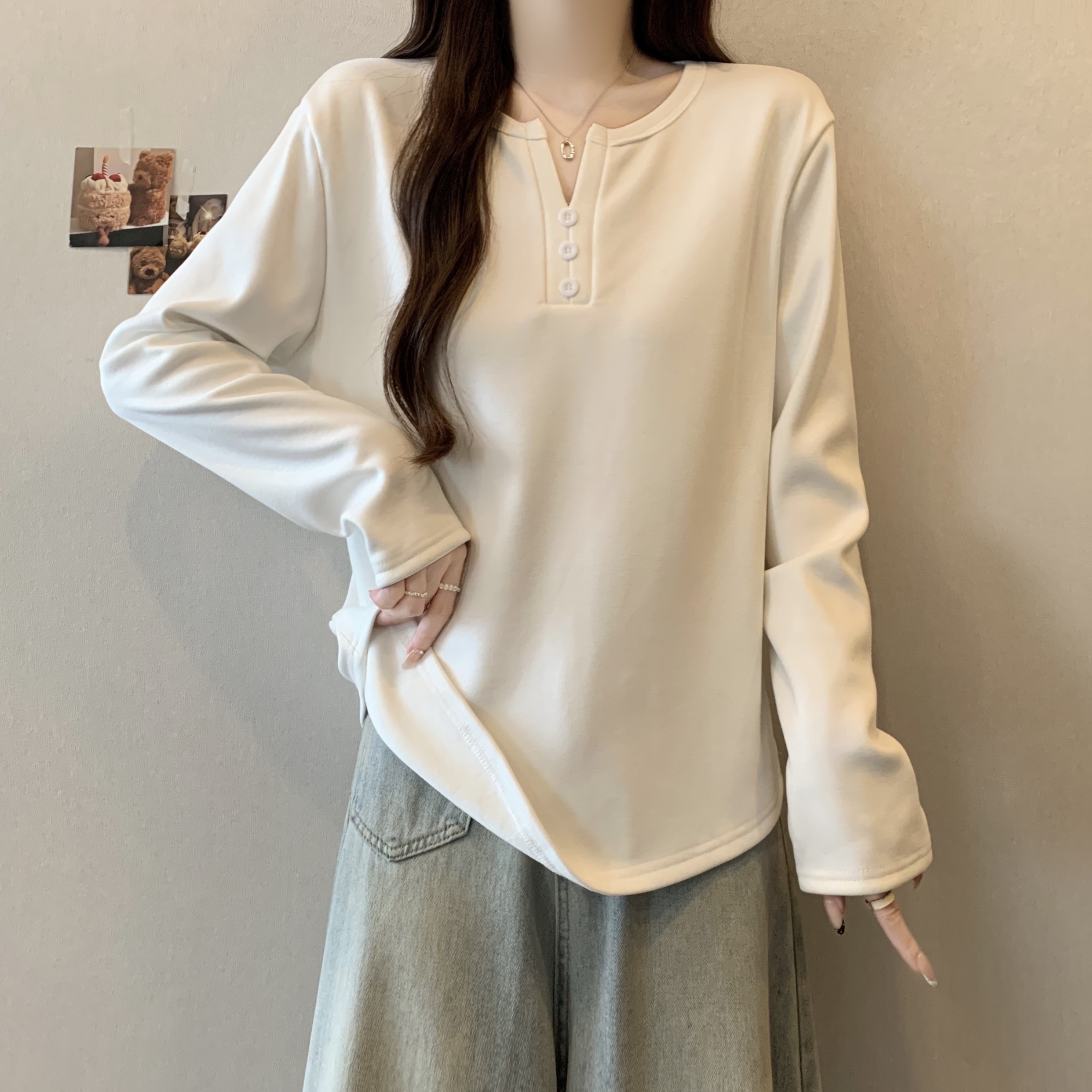 MY15796# 大码女装新款V领长袖正肩加绒加厚打底衫显瘦上衣女裝貨源服裝批發