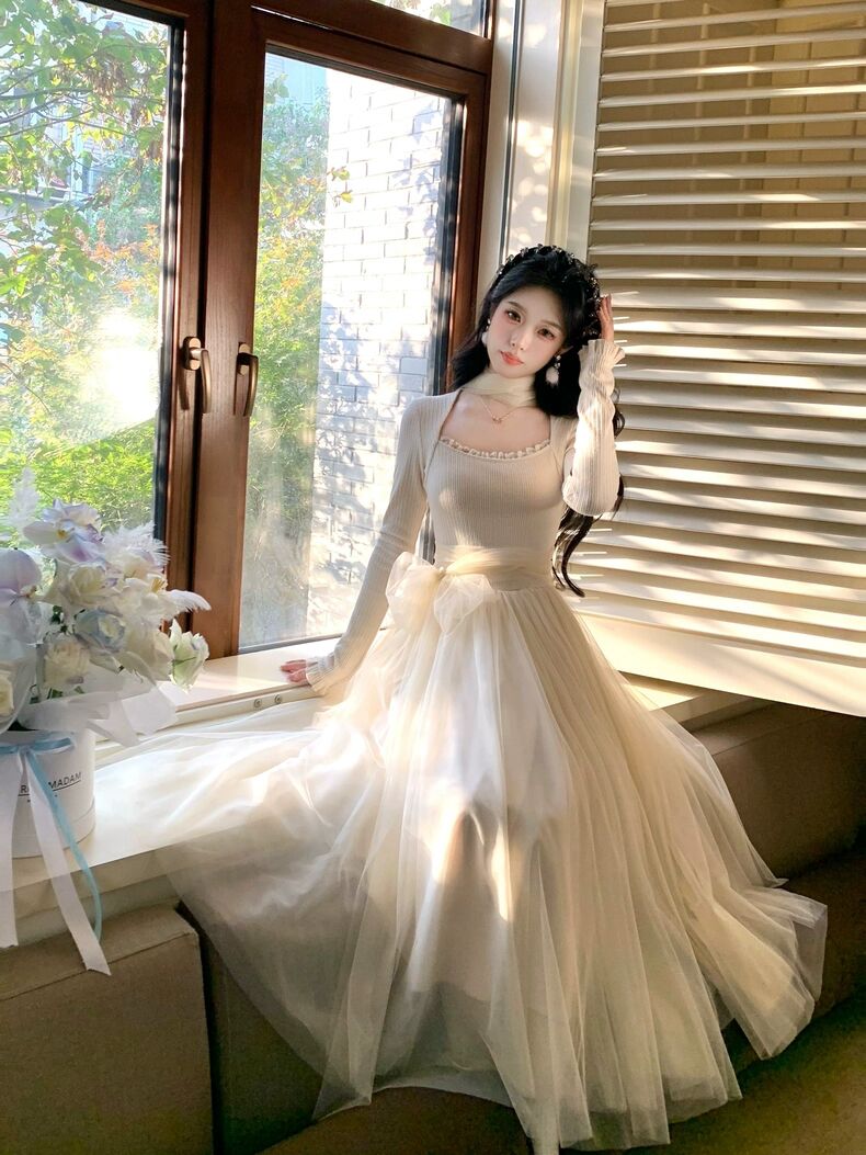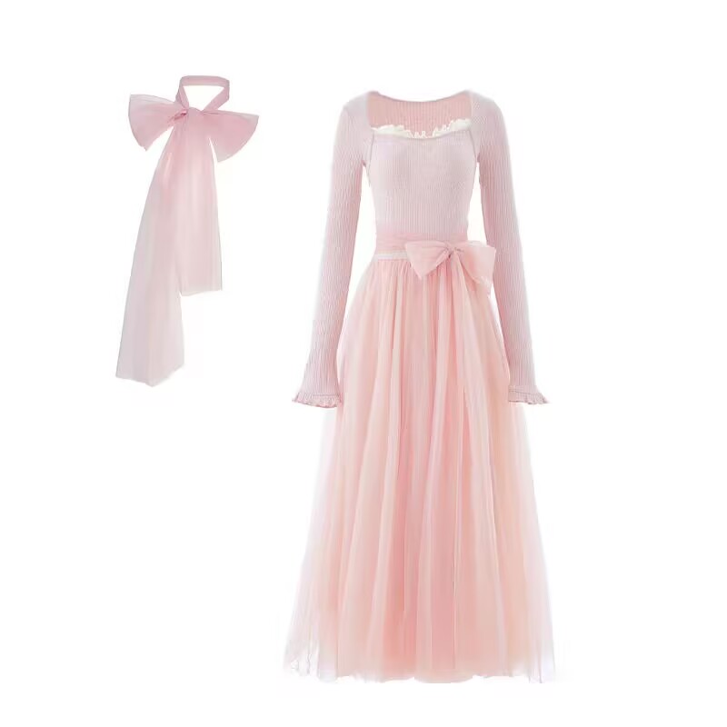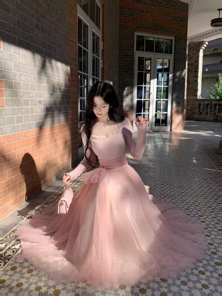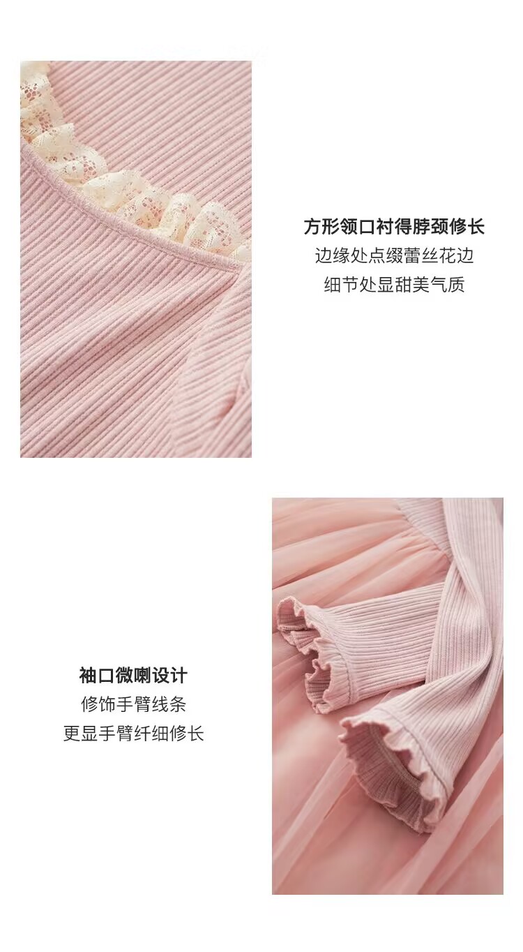MY15803# 少女感温柔拼接网纱仙女风显瘦长袖连衣裙加厚女裝貨源服裝批發