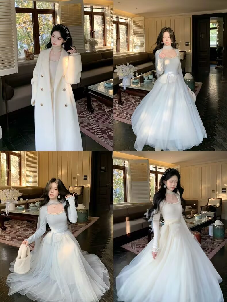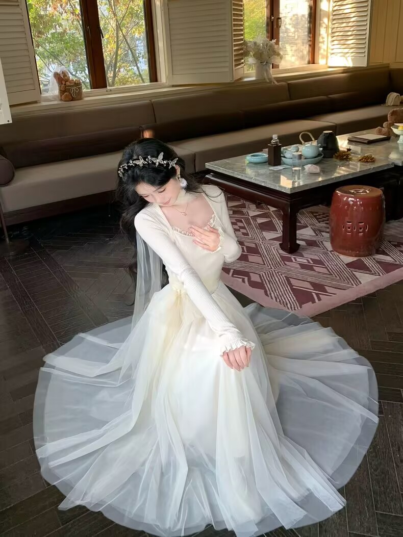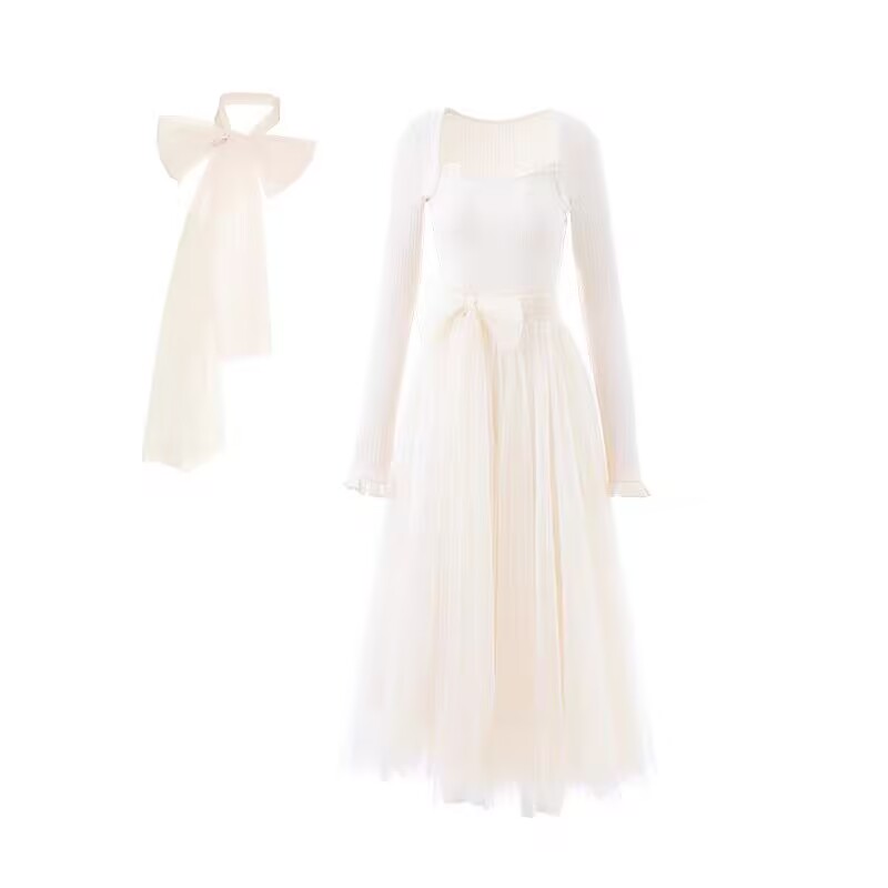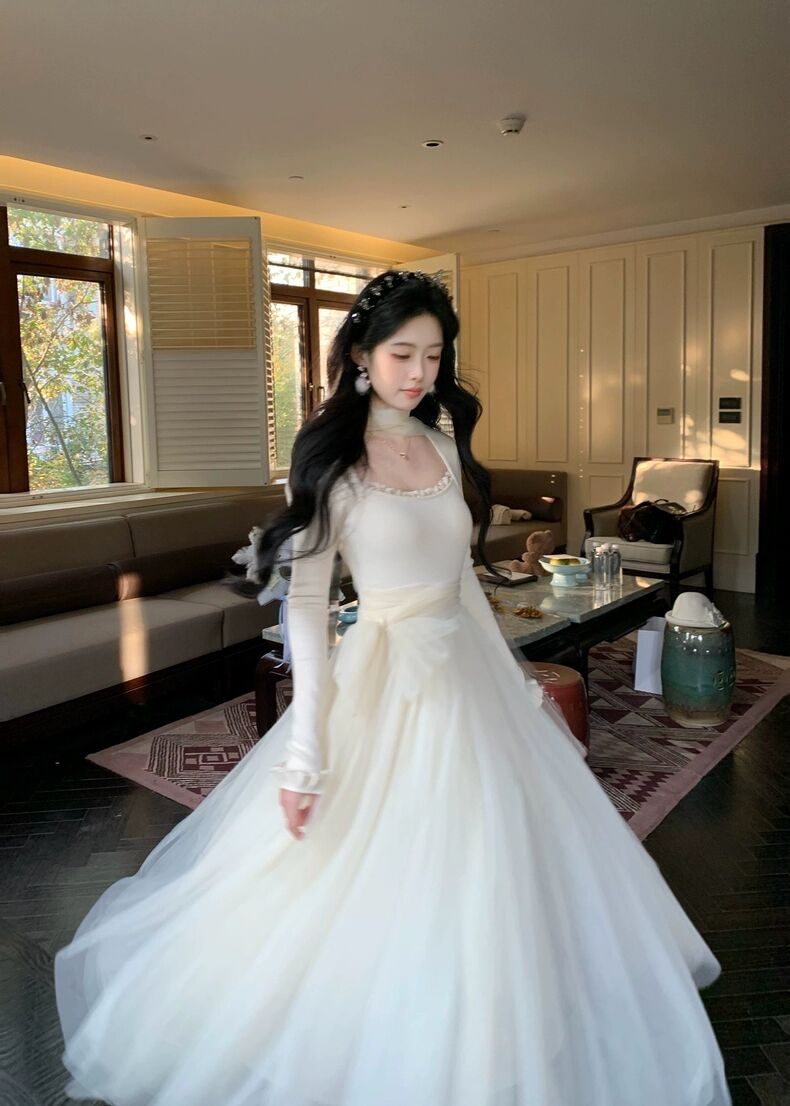 MY15803# 少女感温柔拼接网纱仙女风显瘦长袖连衣裙加厚女裝貨源服裝批發
