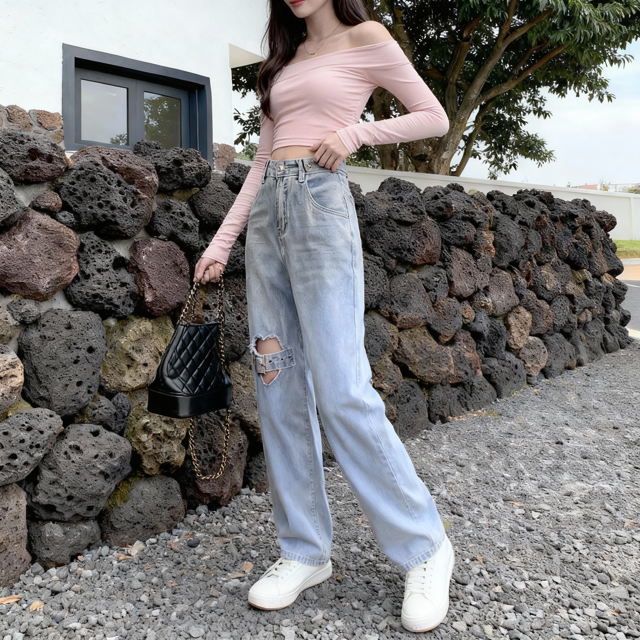 MY15806# 小个子韩版高腰爱心破洞宽松显高垂感牛仔长裤女xs直筒九分女裝貨源服裝批發