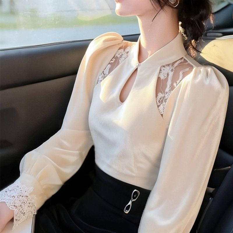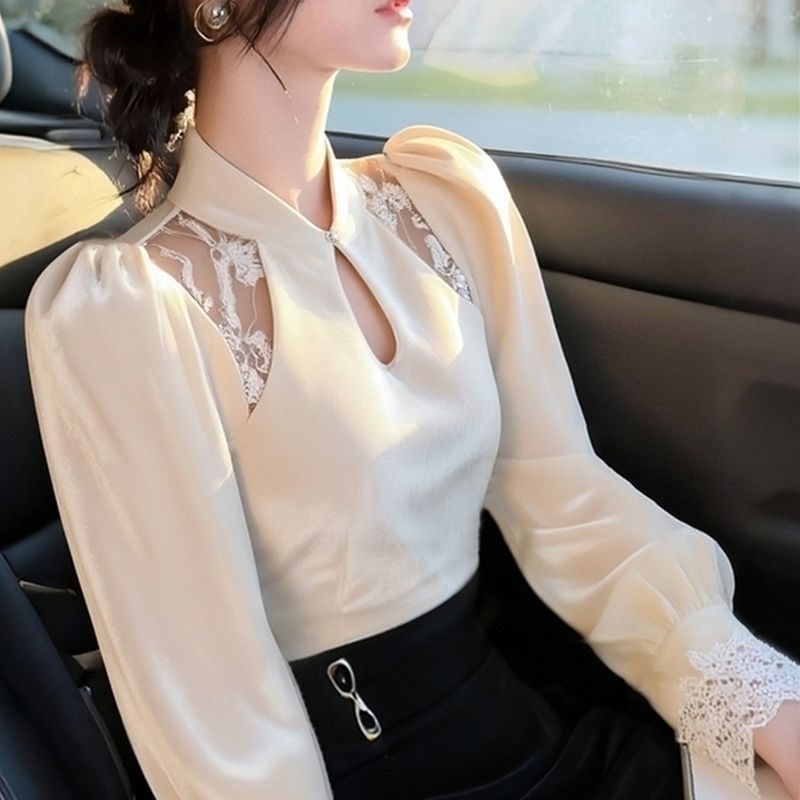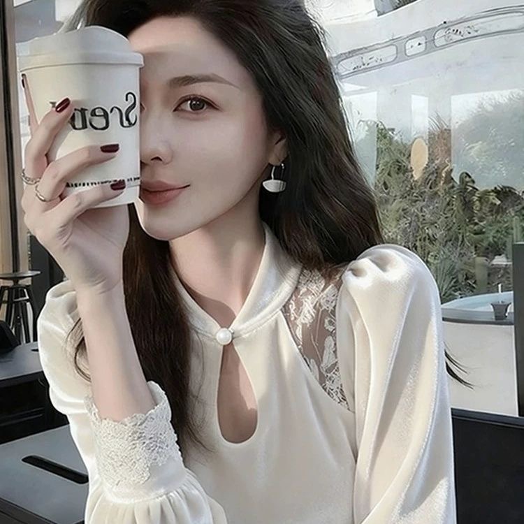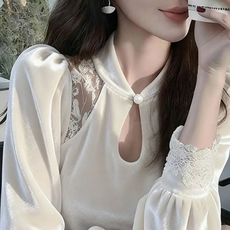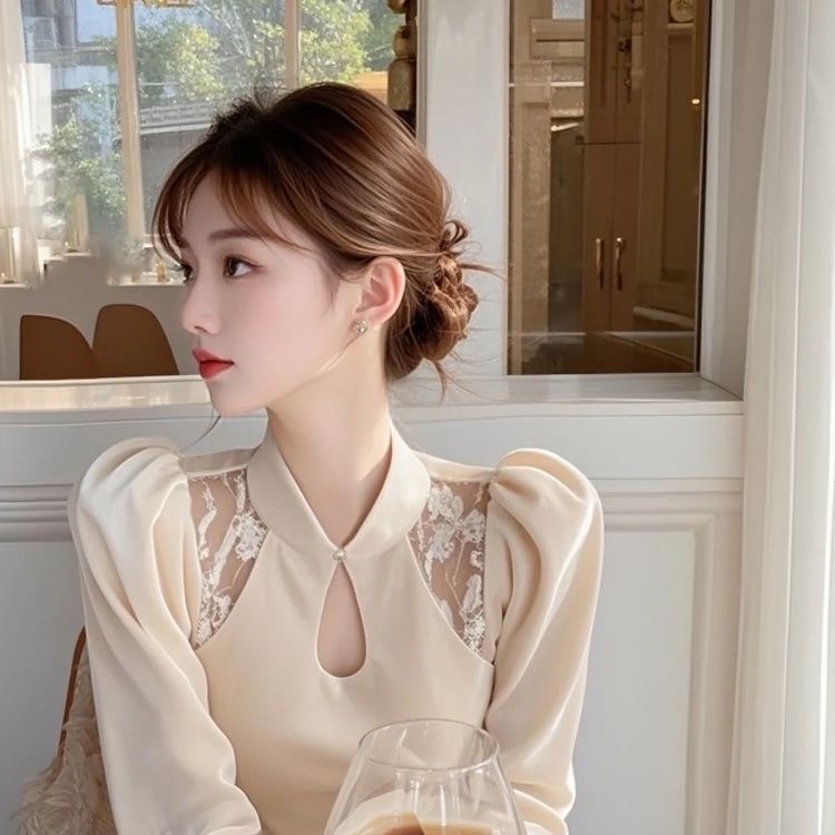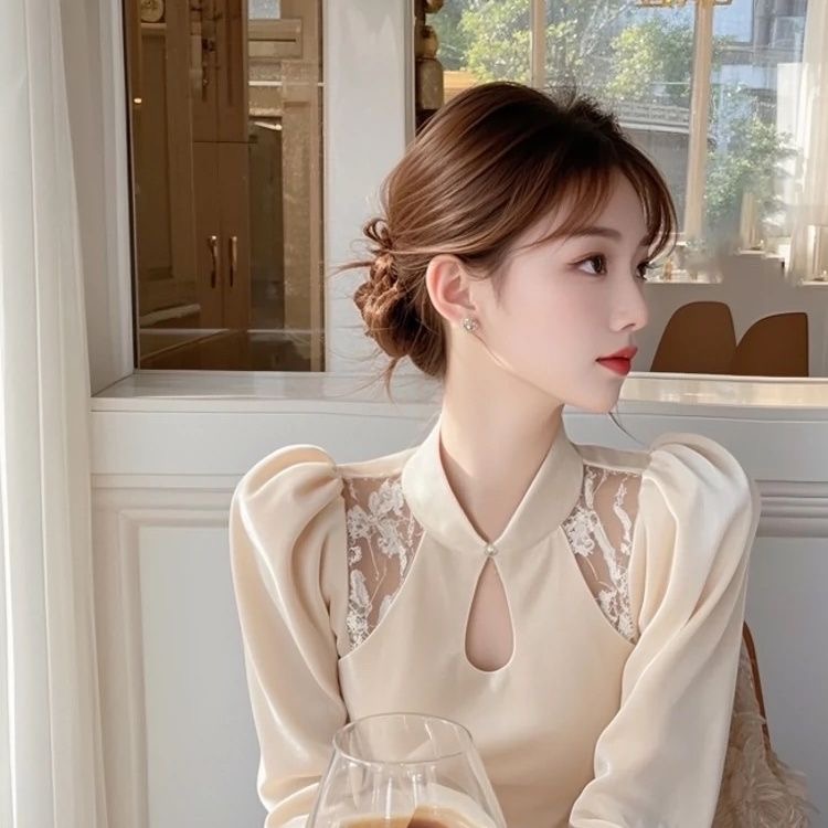 MY15808# 新中式流行漂亮国风上衣小众设计感独特超好看杏色丝绒衬衫高级女裝貨源服裝批發