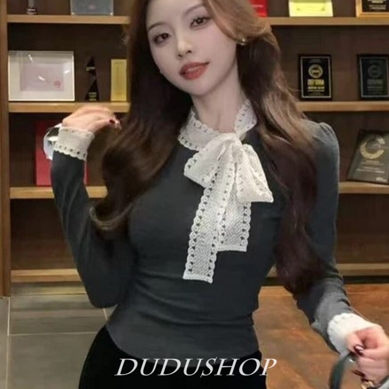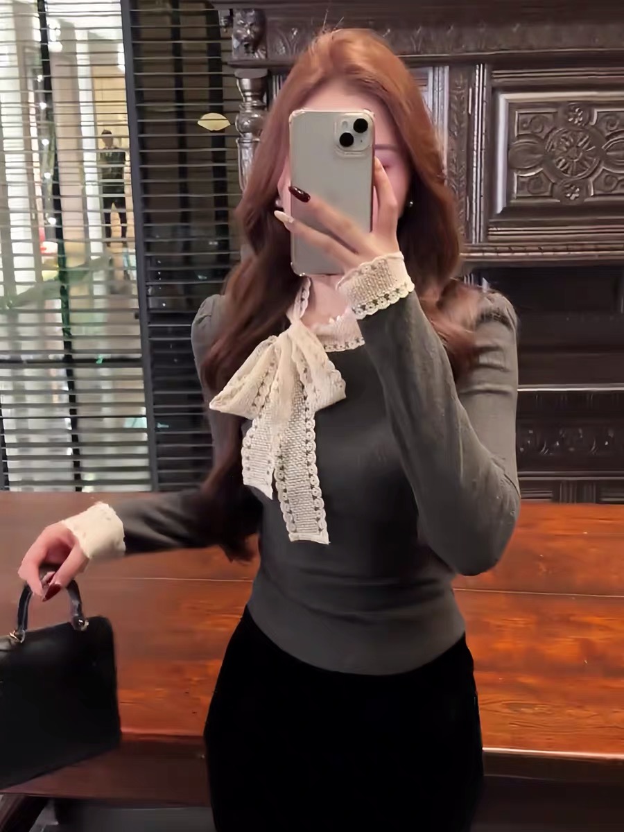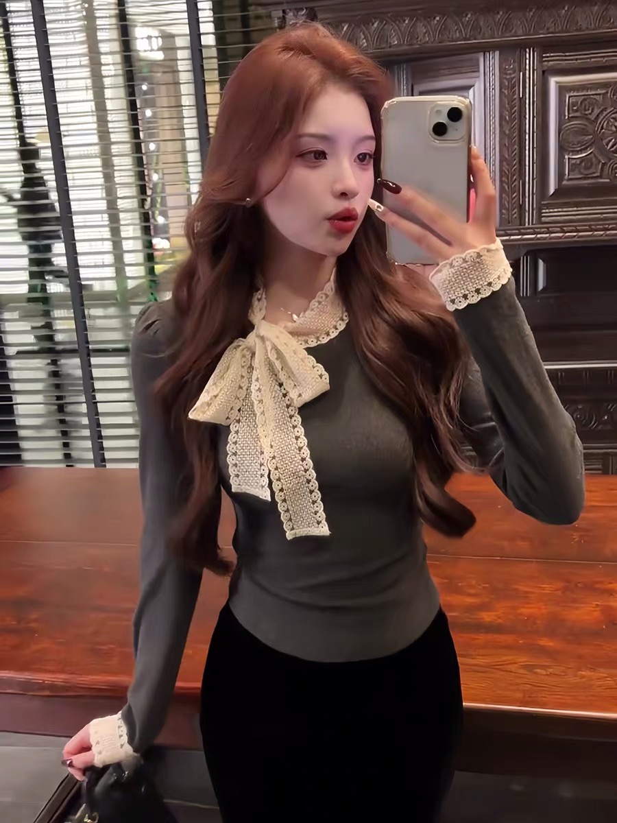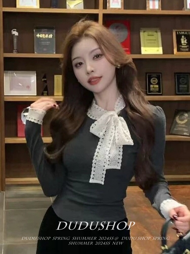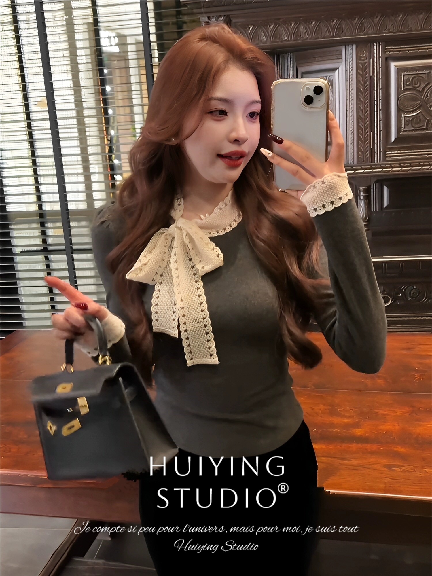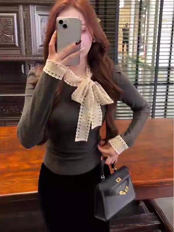 MY15812# 法式蝴蝶结绑带深灰色加厚打底衫设计感小众内搭上衣女裝貨源服裝批發