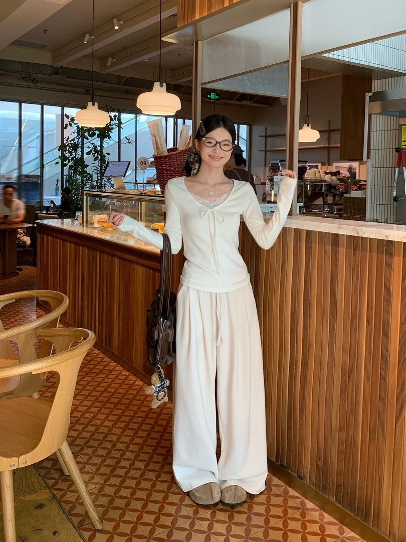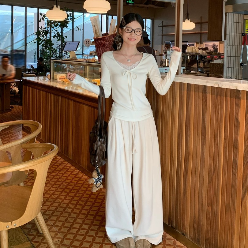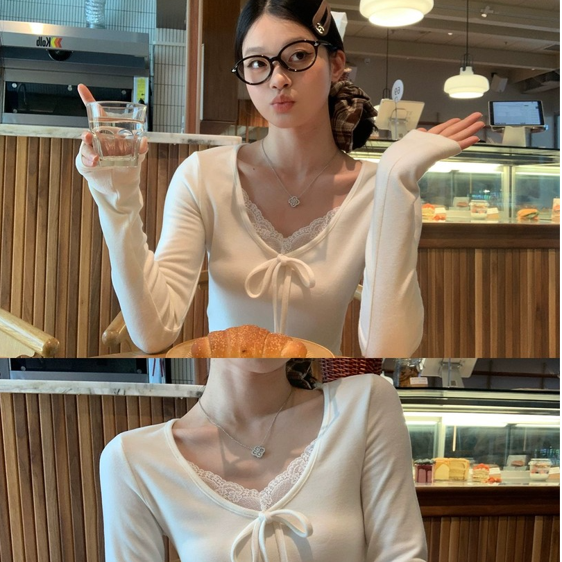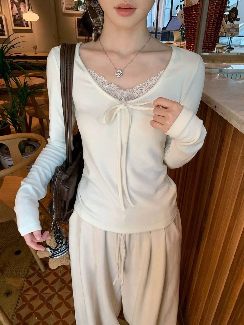 MY15817# 德绒+原版花边蕾丝拼接蝴蝶结长袖T恤打底衫气质内搭女裝貨源服裝批發