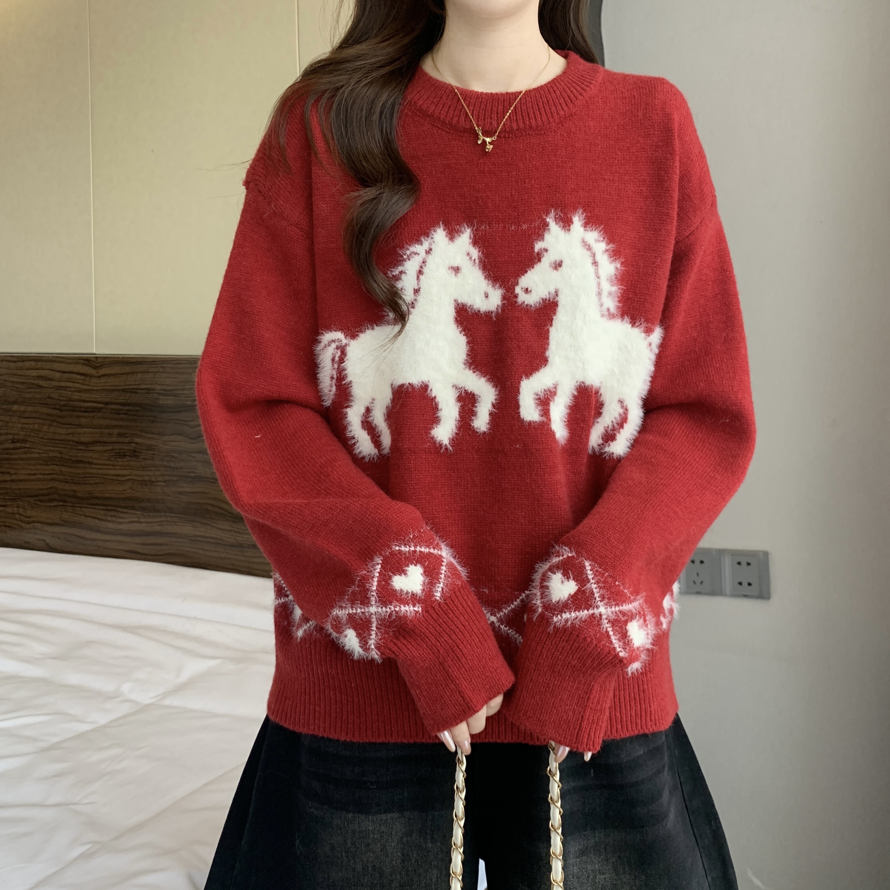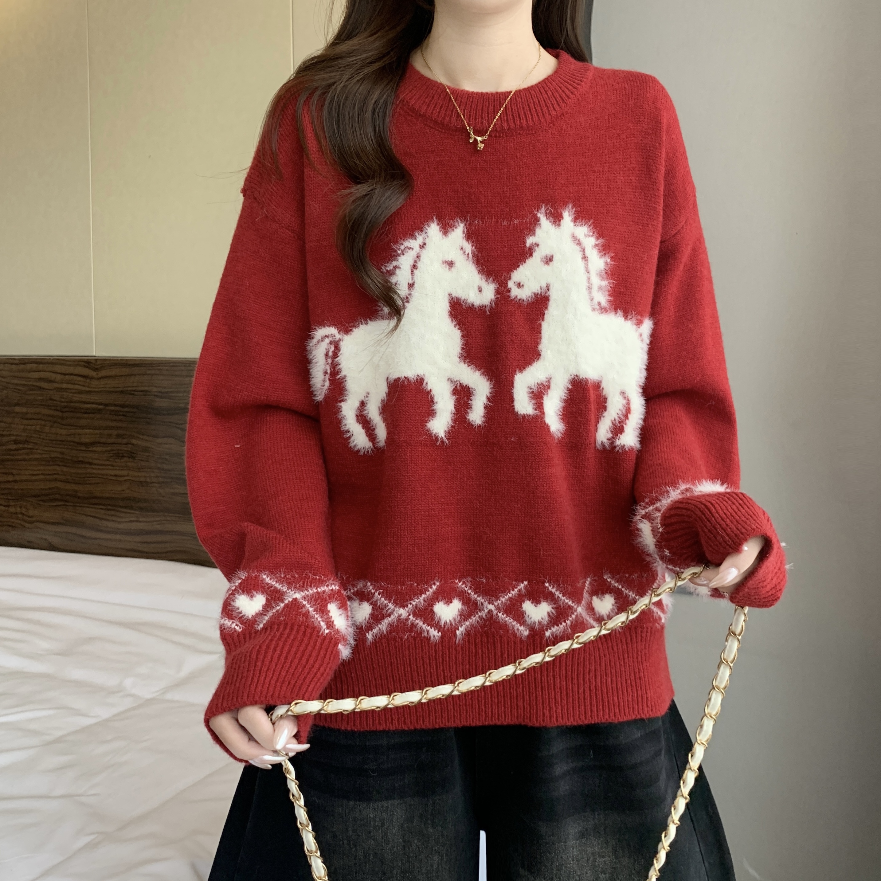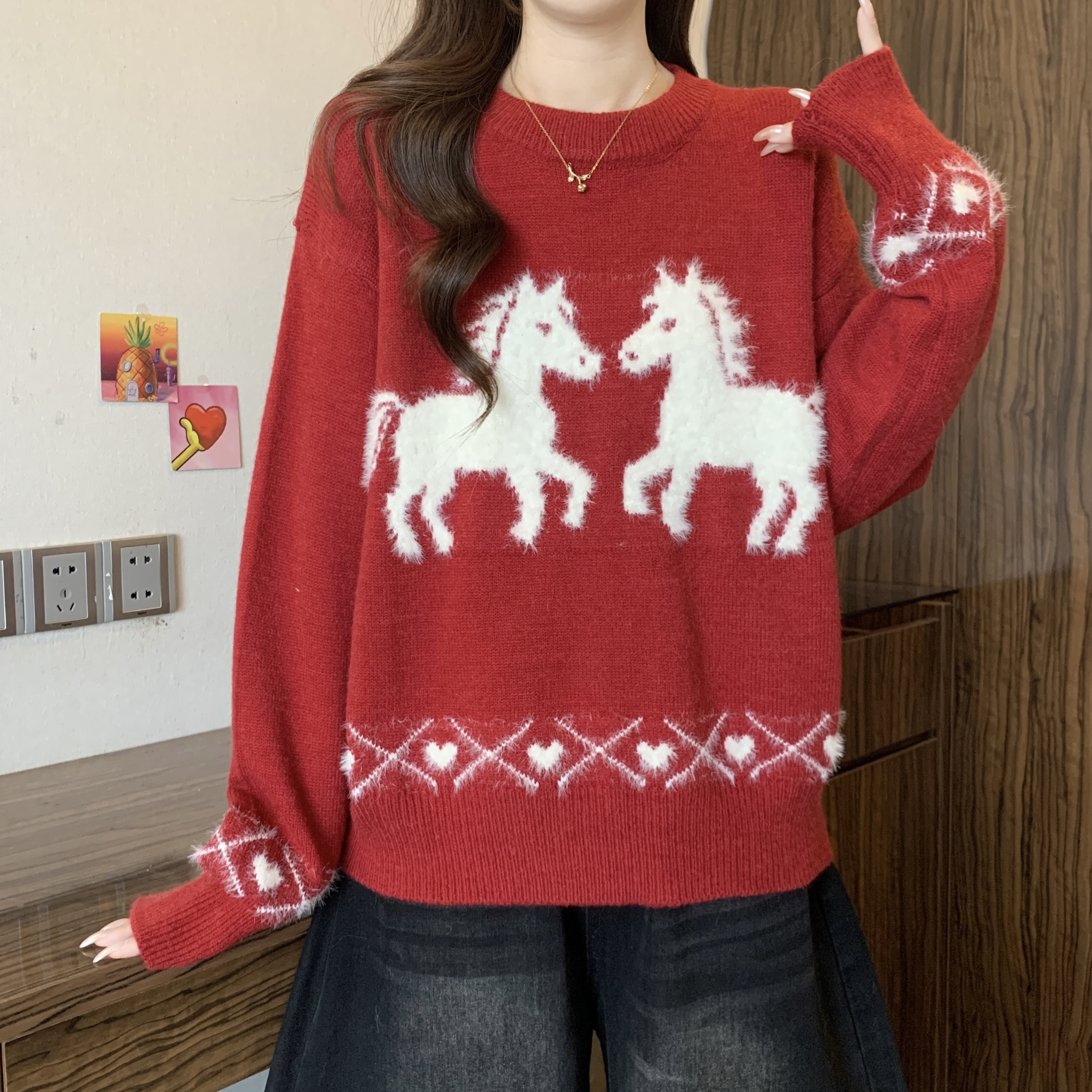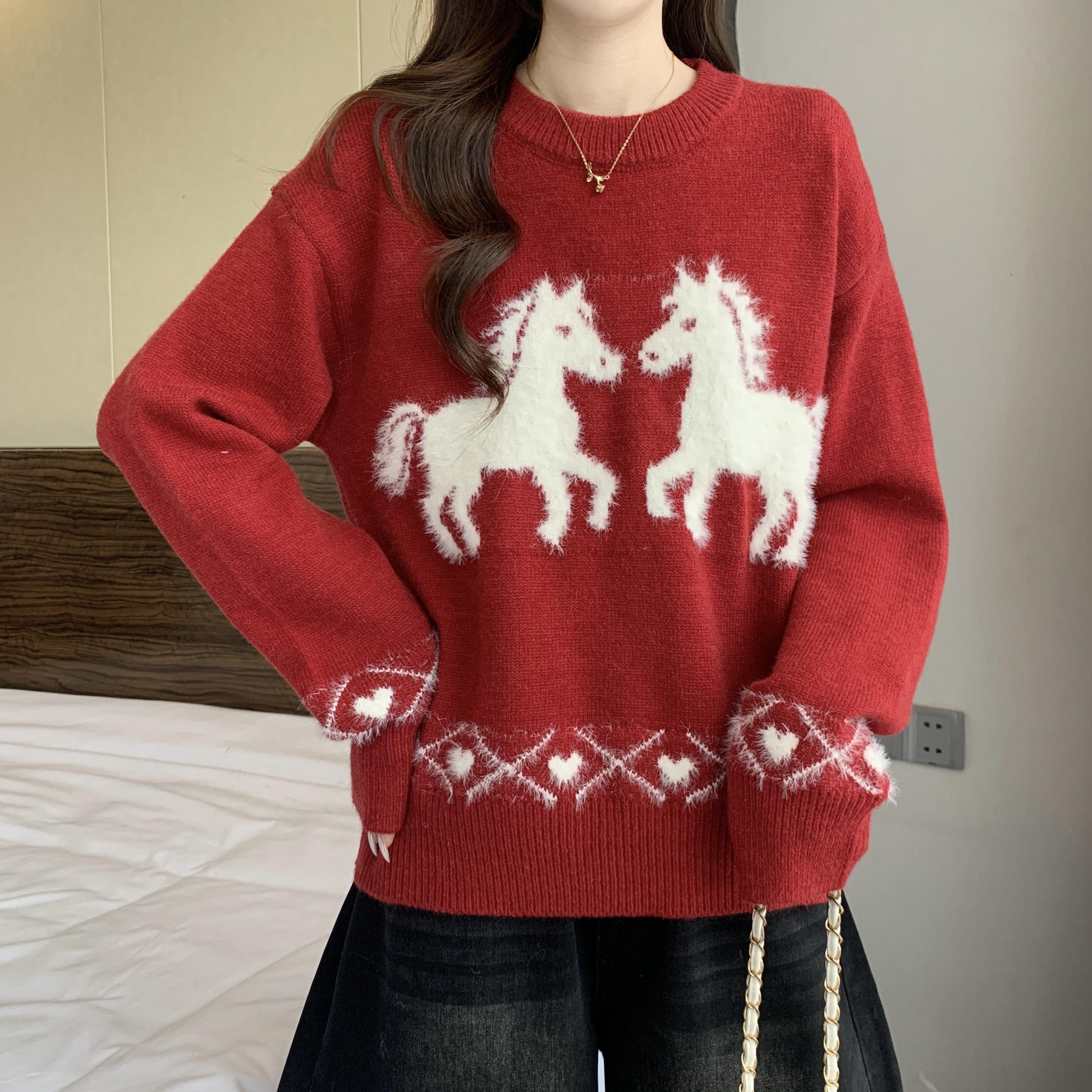 MY15819# 新年圣诞毛巾绣马红色毛衣新款胖MM时尚减龄显瘦巨好看针织衫女裝貨源服裝批發