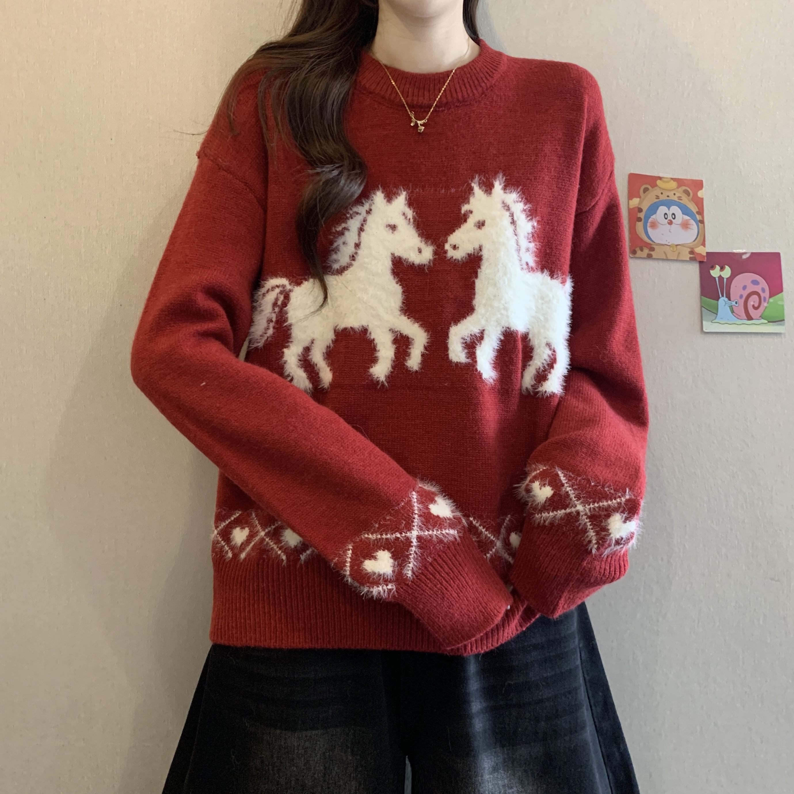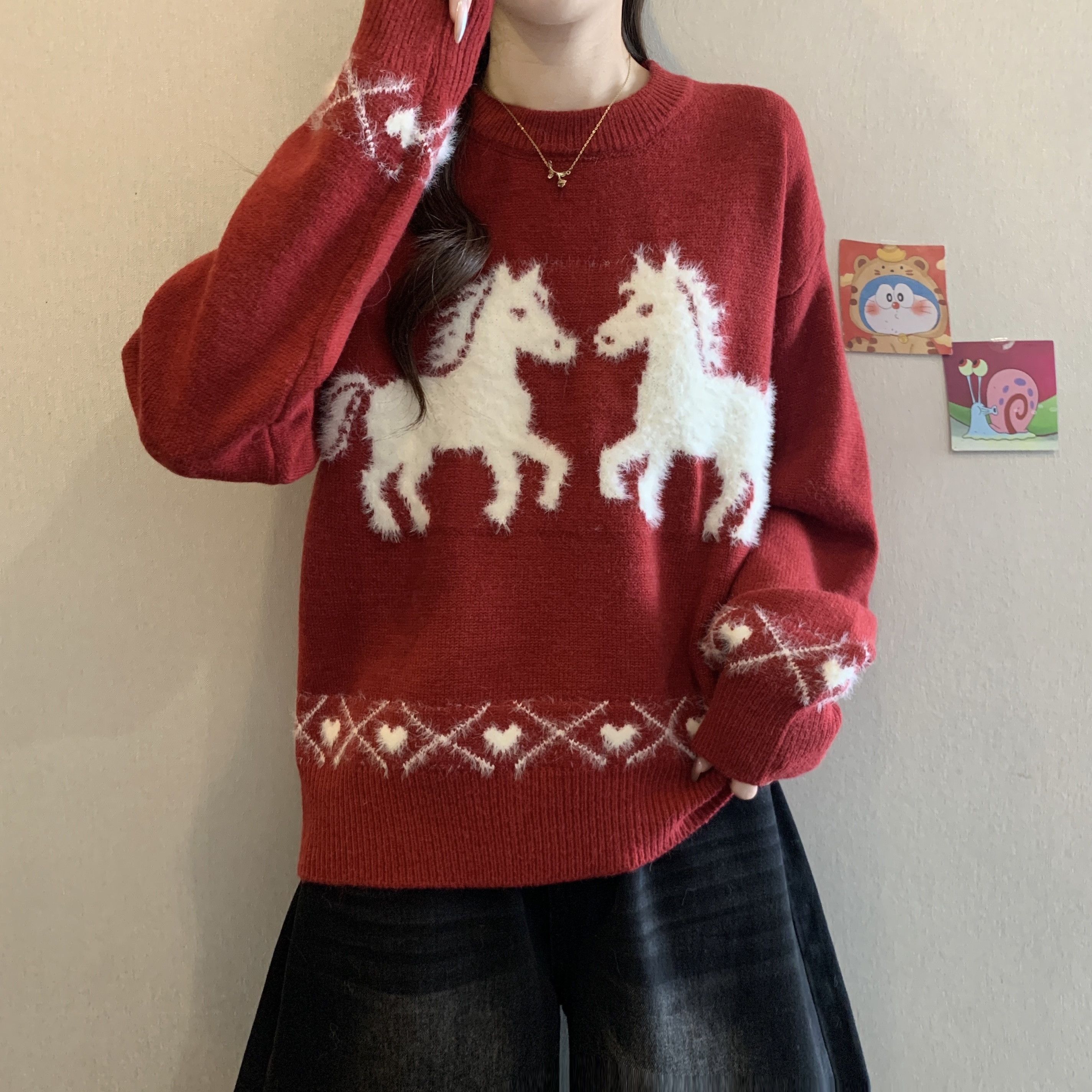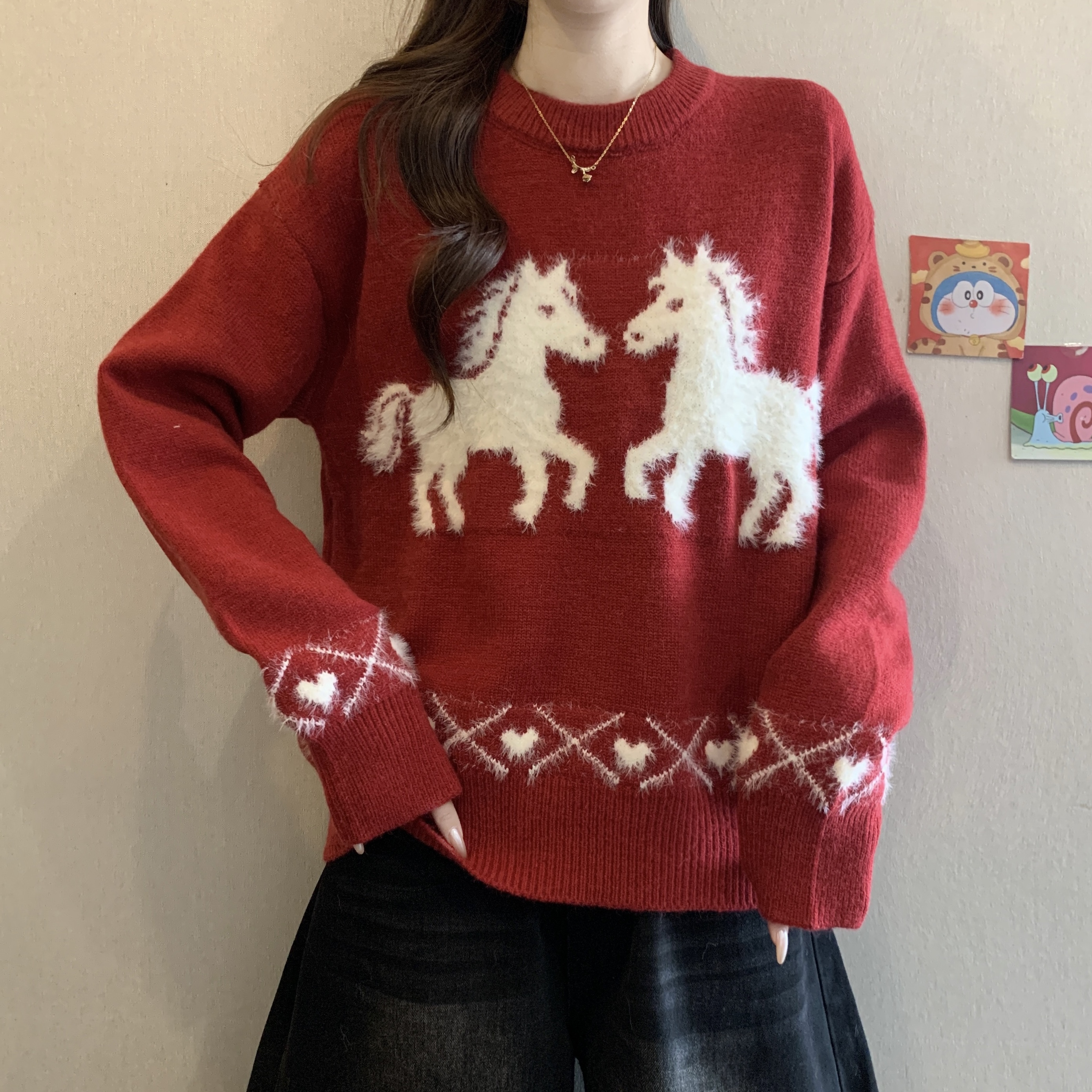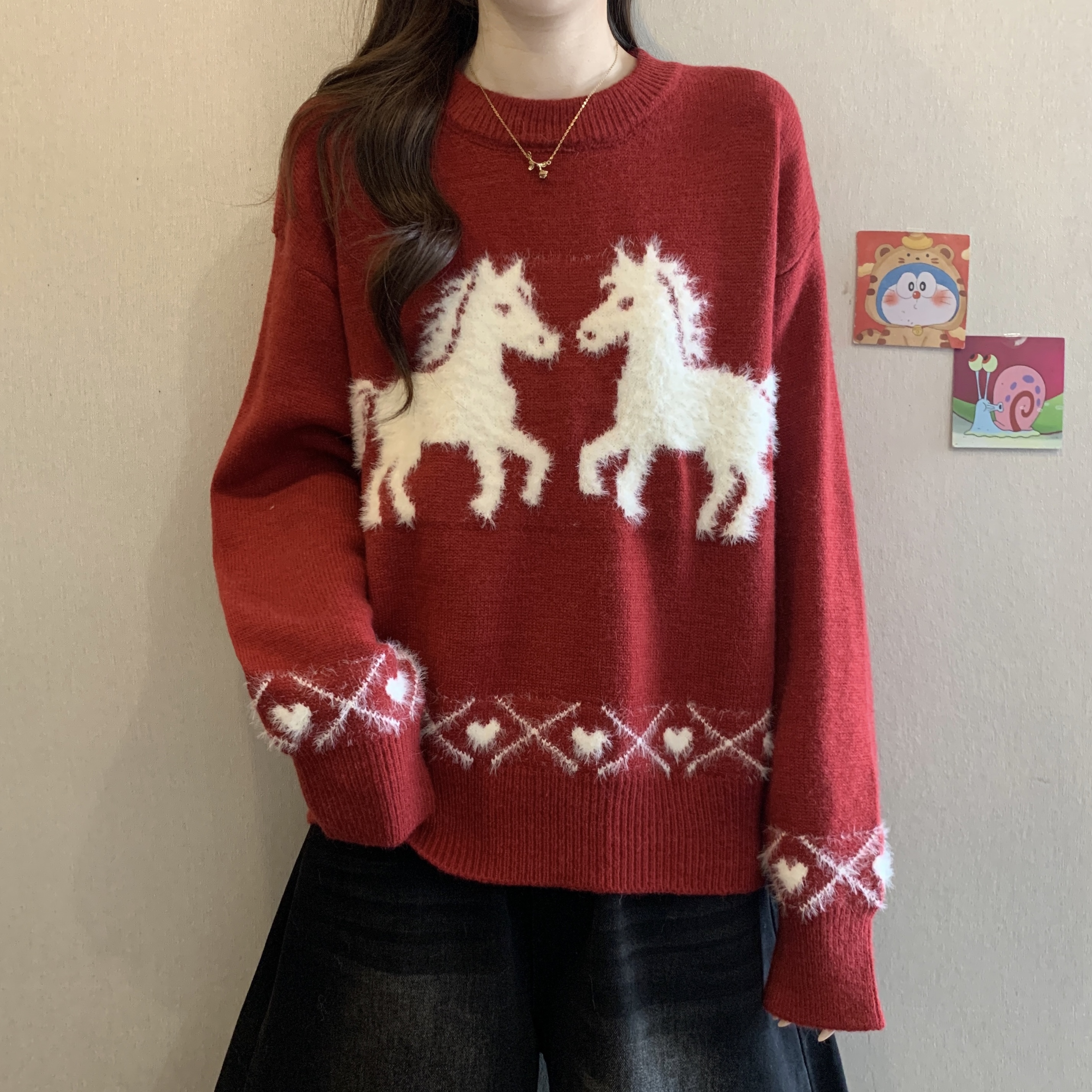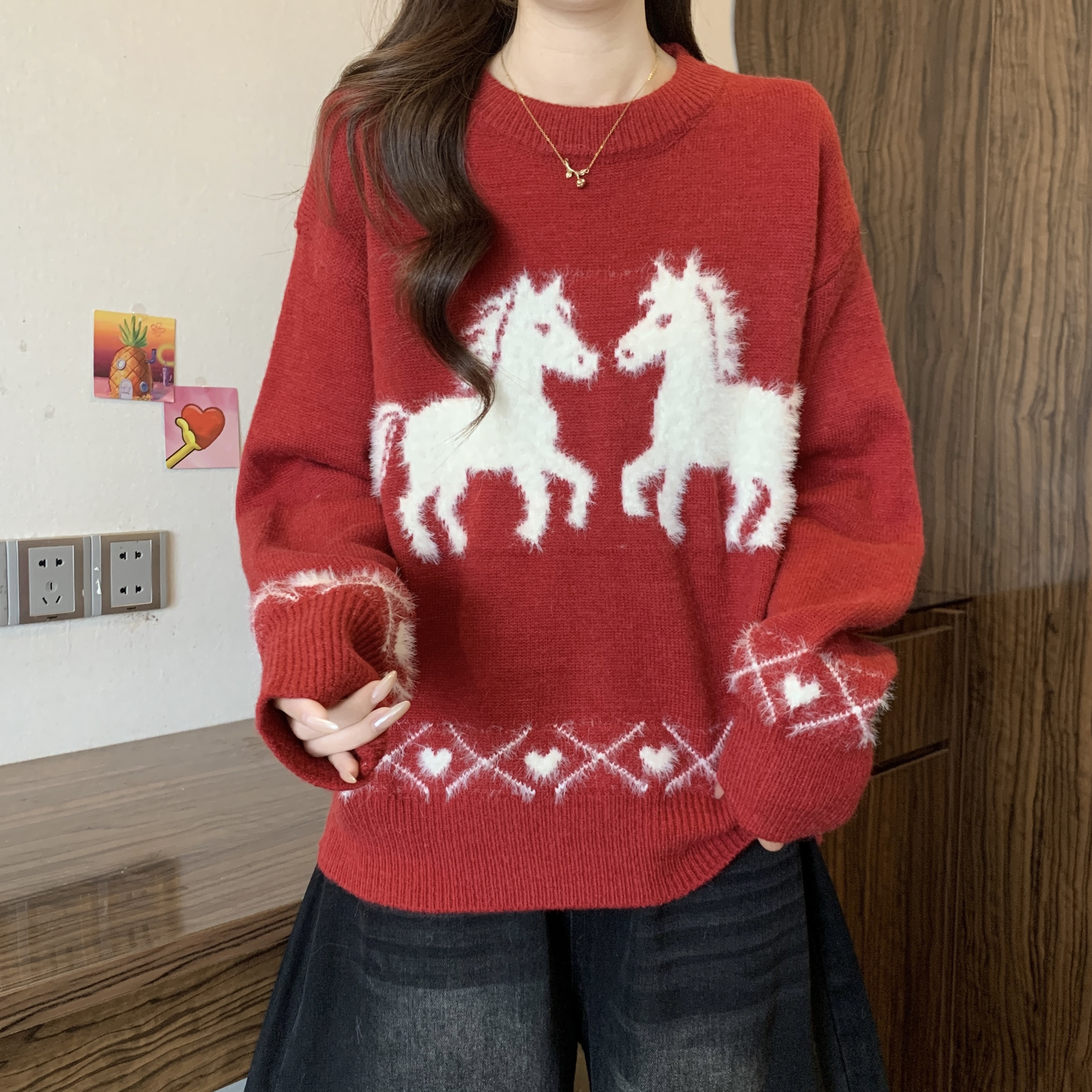 MY15819# 新年圣诞毛巾绣马红色毛衣新款胖MM时尚减龄显瘦巨好看针织衫女裝貨源服裝批發