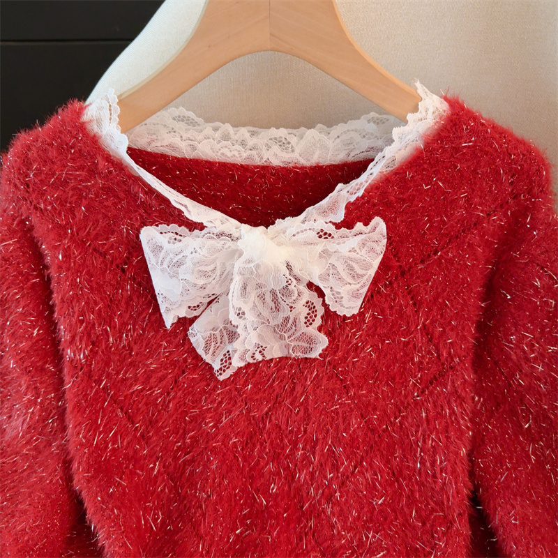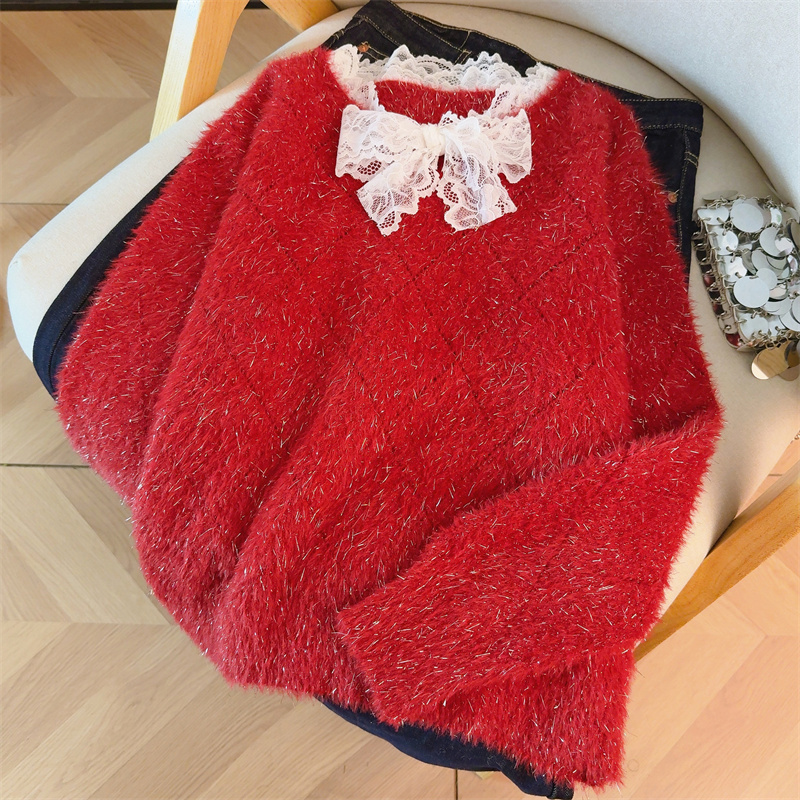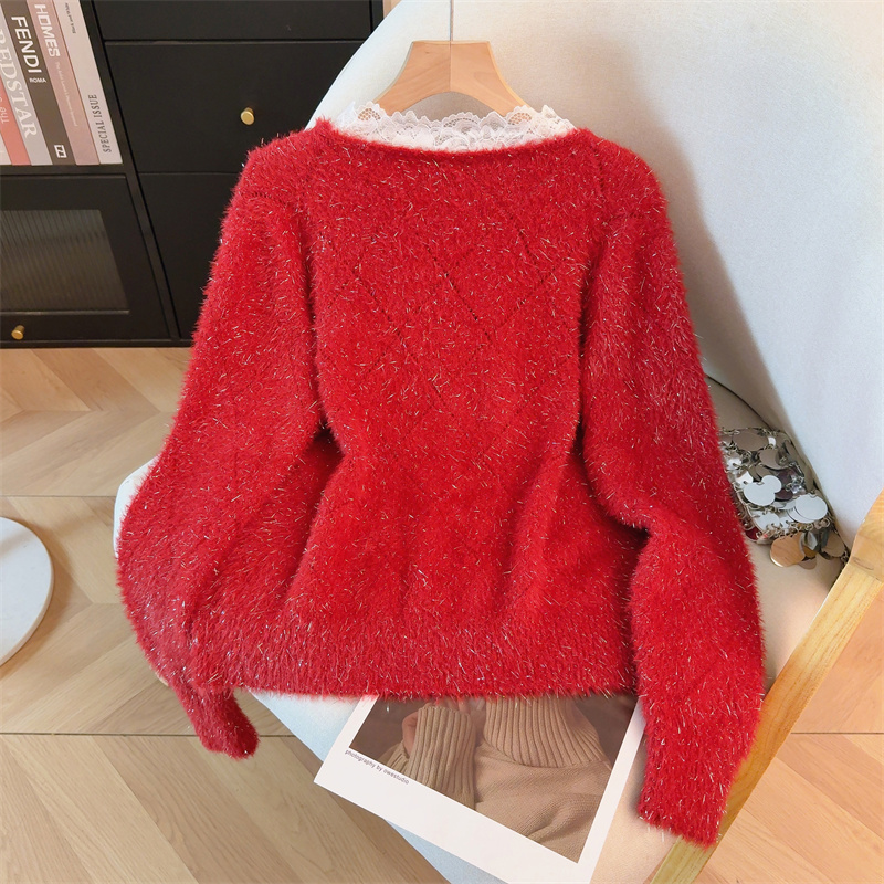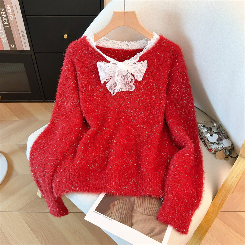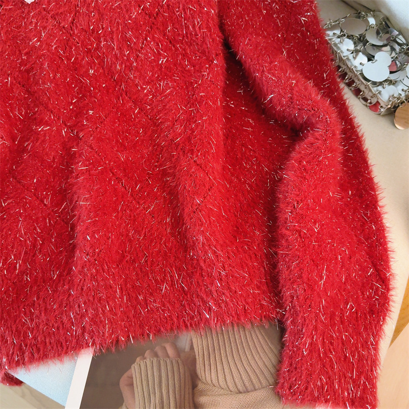 MY15856# 大码高级感红色本命年V领套头毛衣胖mm宽松慵懒针织衫上衣女裝貨源服裝批發