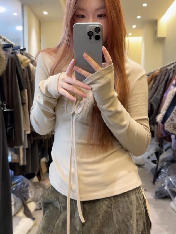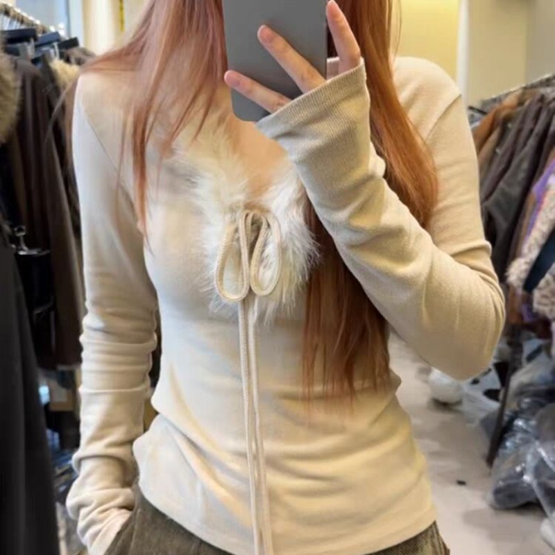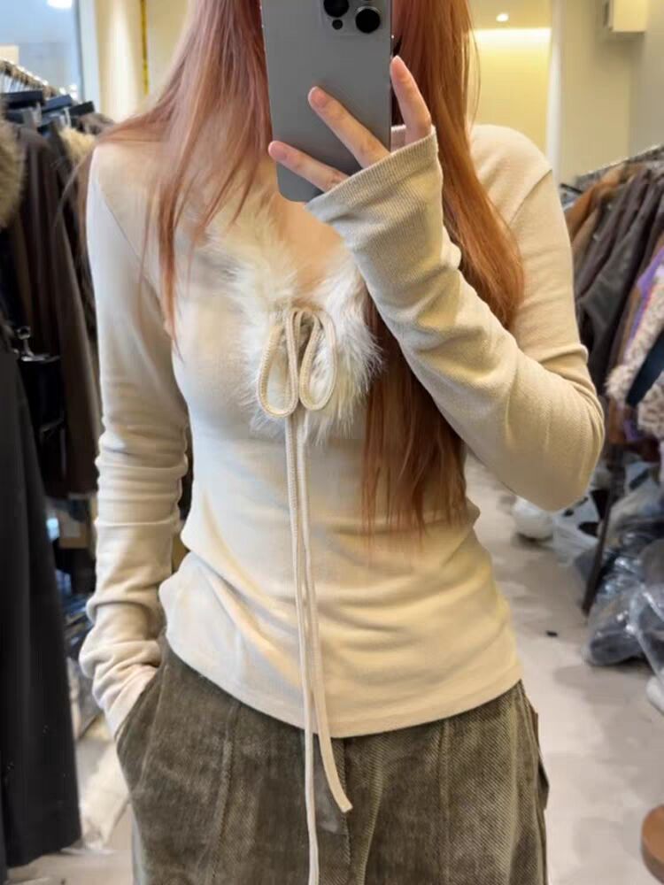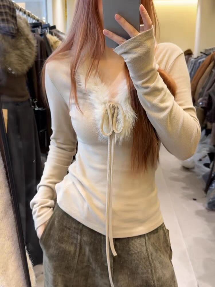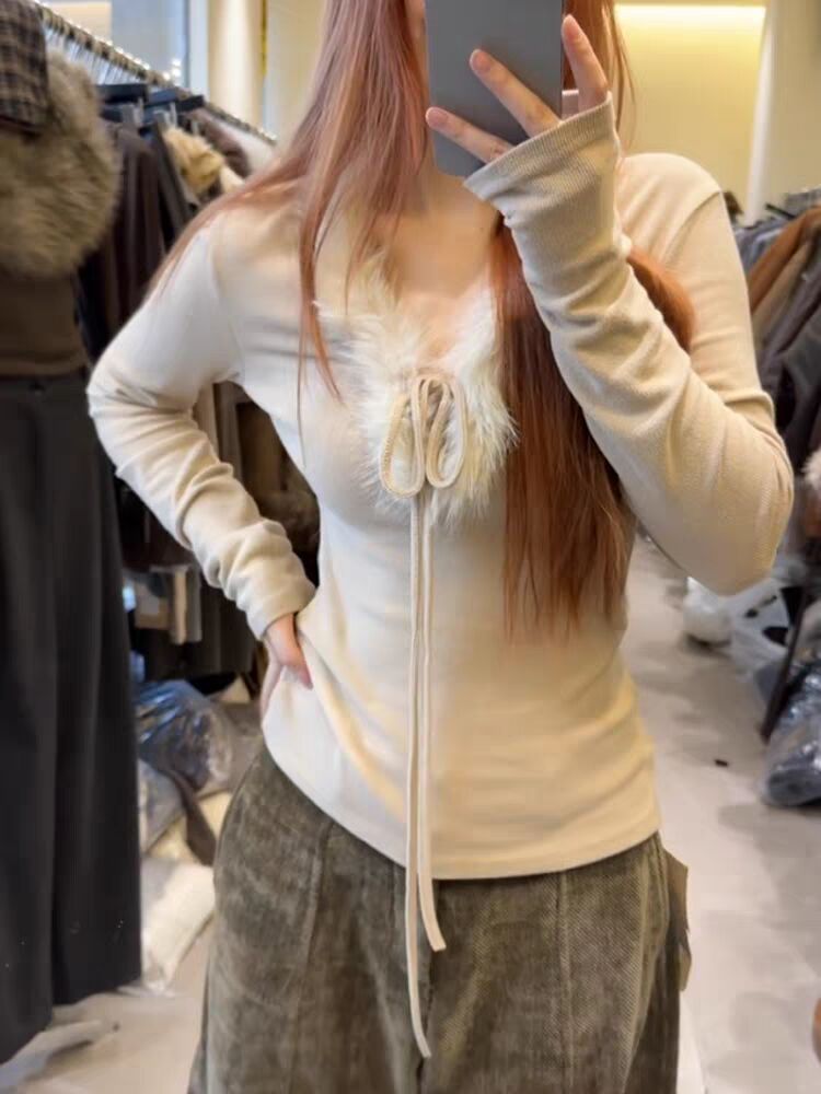 MY15867# 面料人棉抓毛纯欲风V领系带毛领内搭打底衫长袖上衣女裝貨源服裝批發