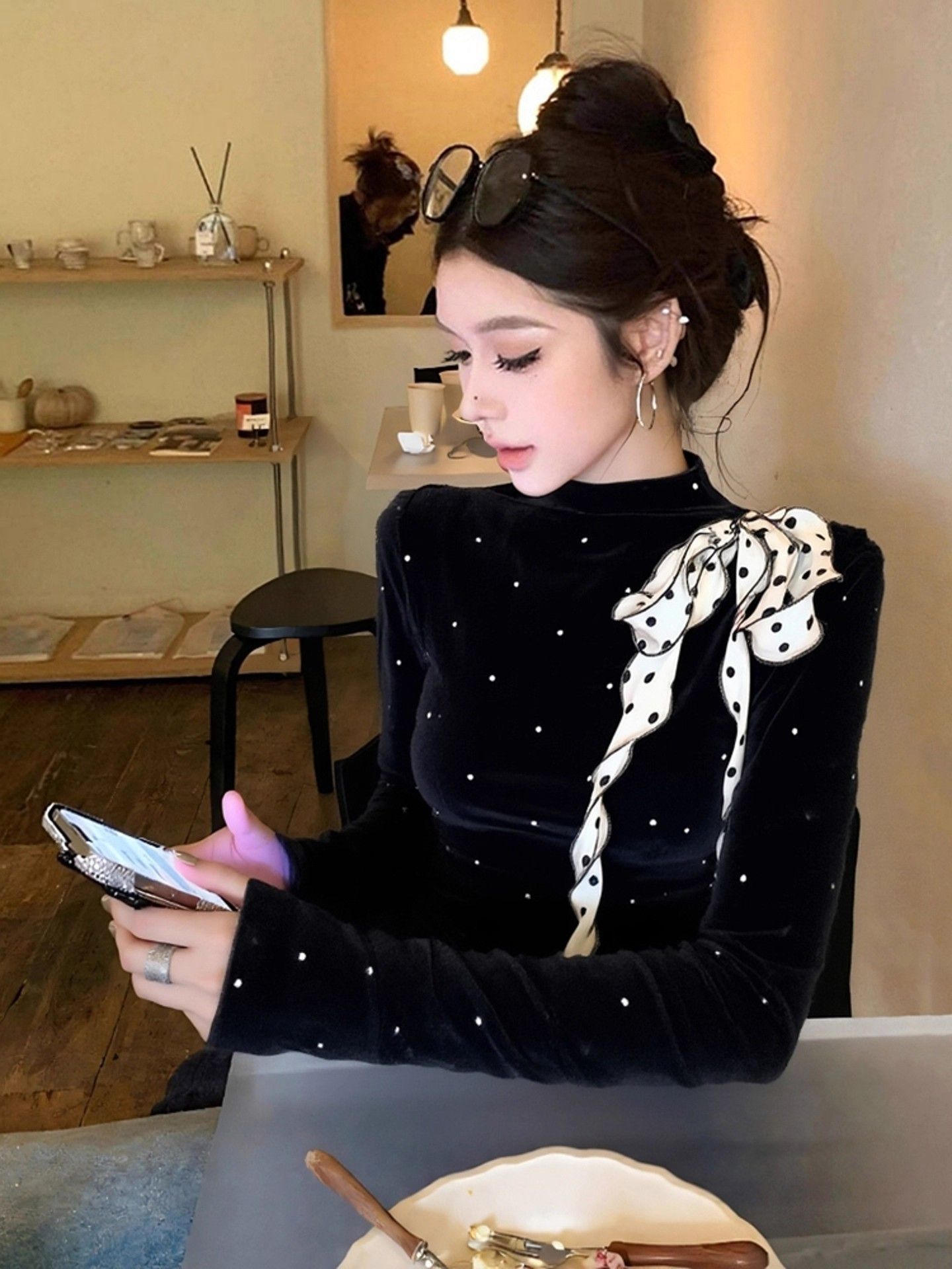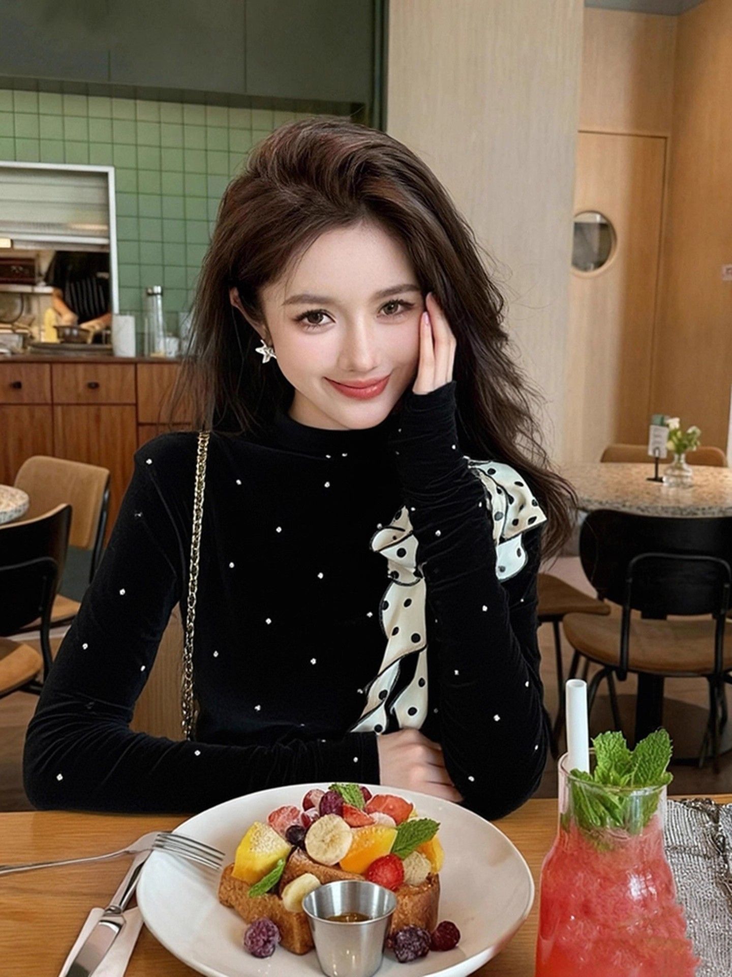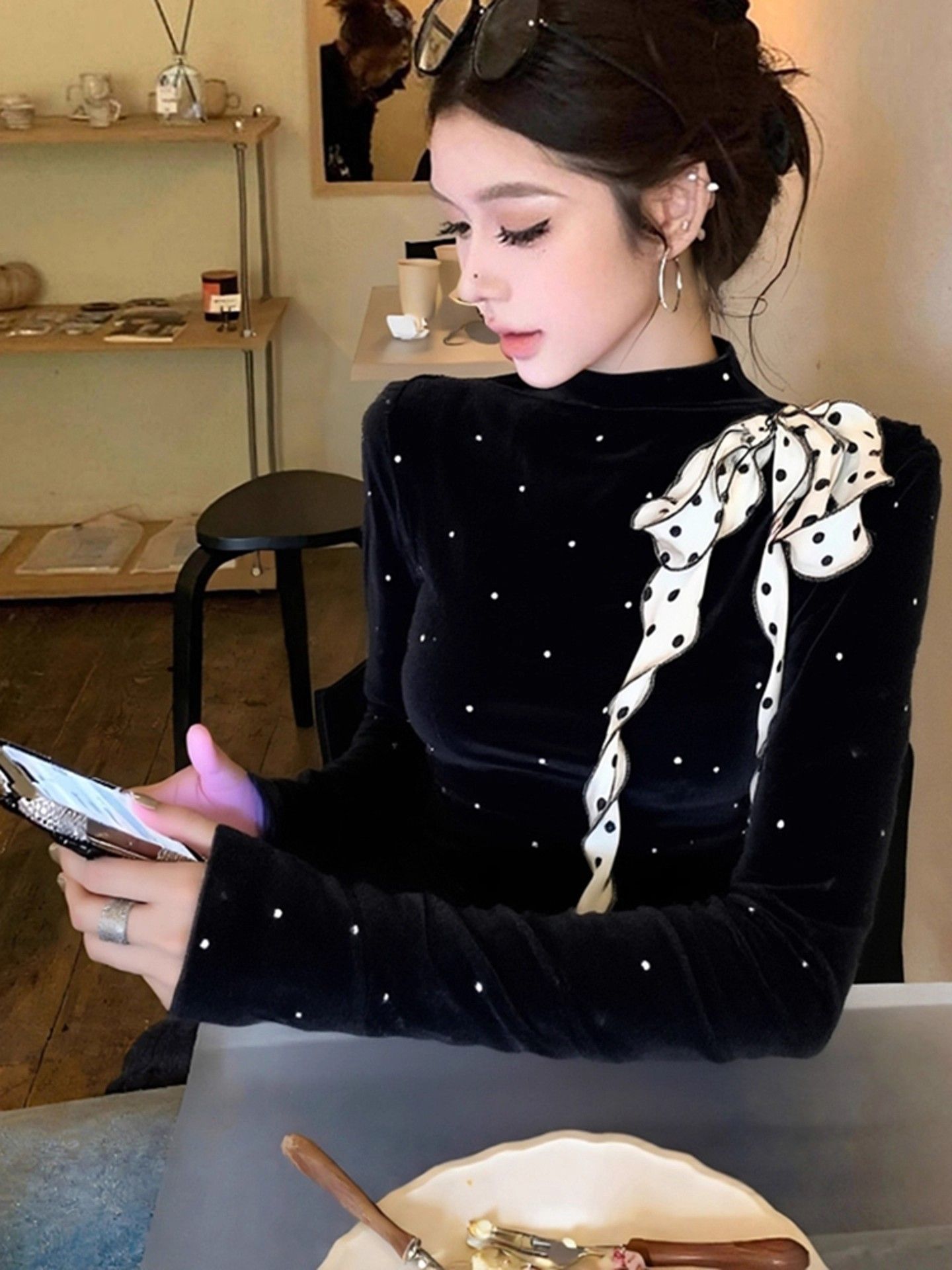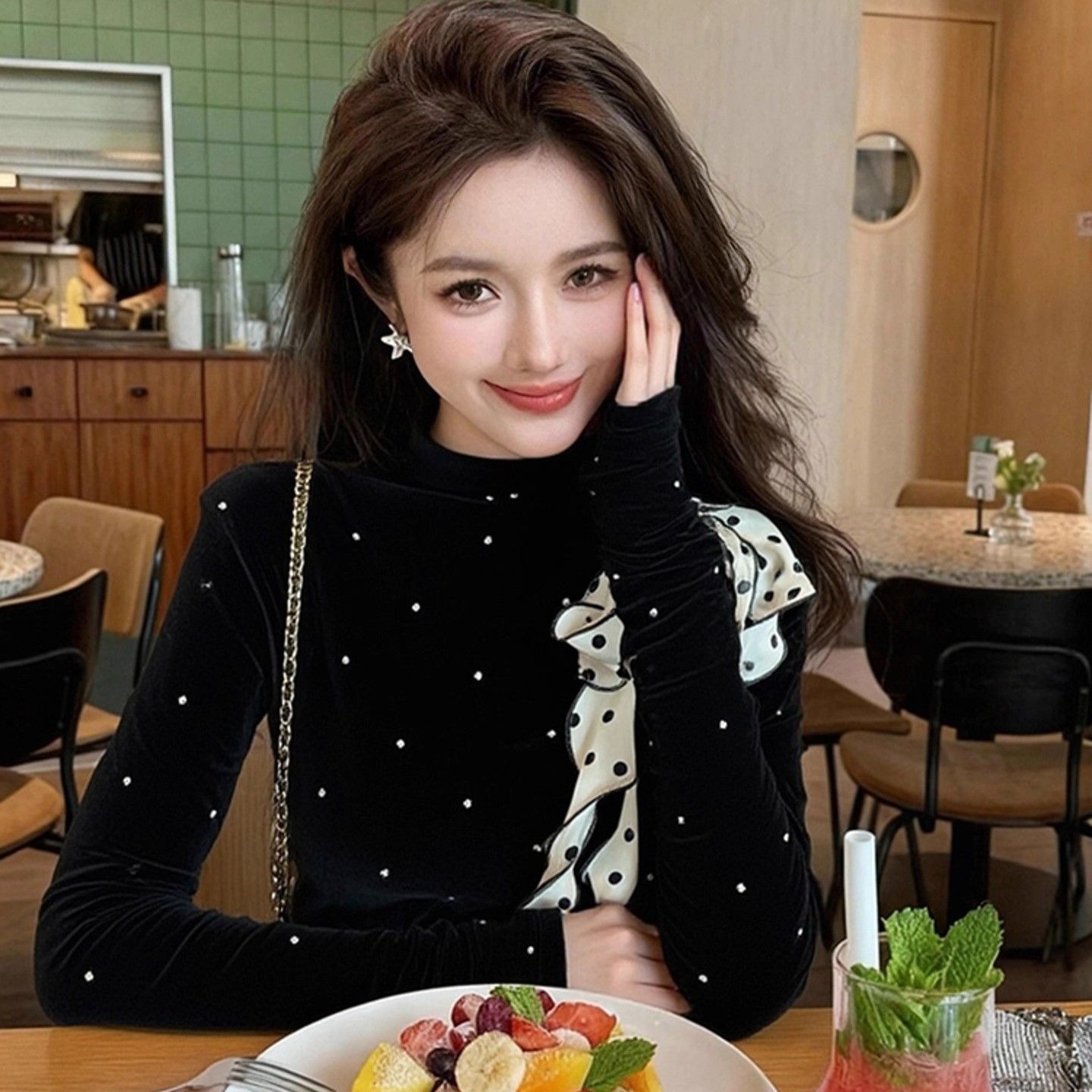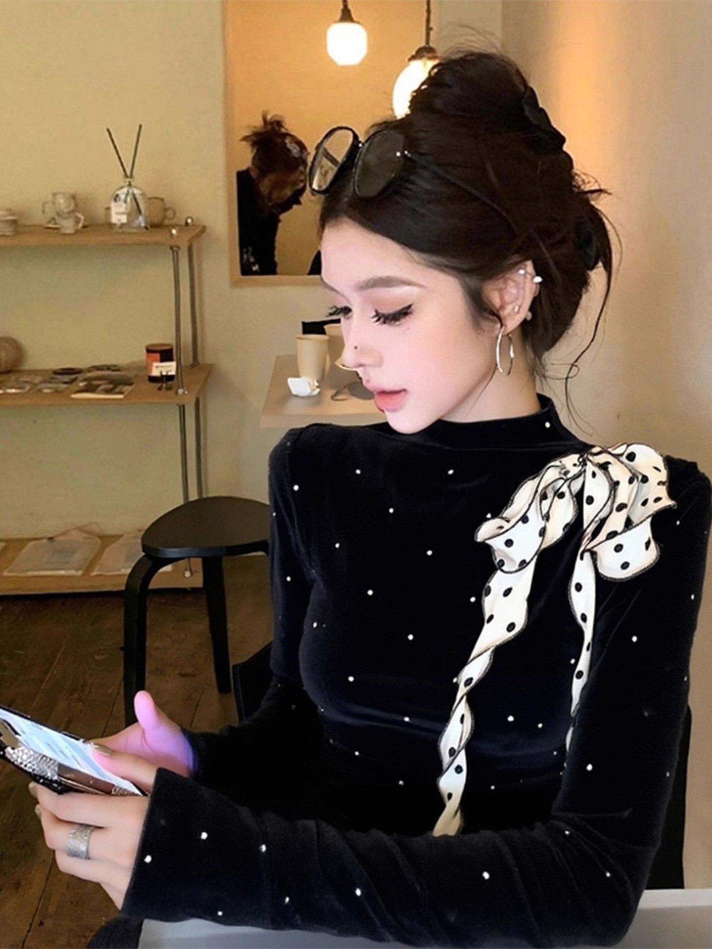 MY15875# 绝美巨好看小众设计不撞款穿搭时尚气质黑色波点丝绒上衣女裝貨源服裝批發