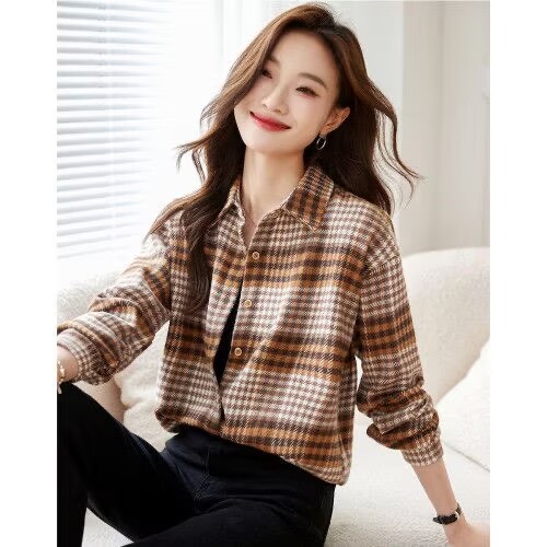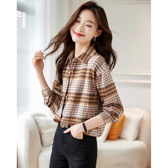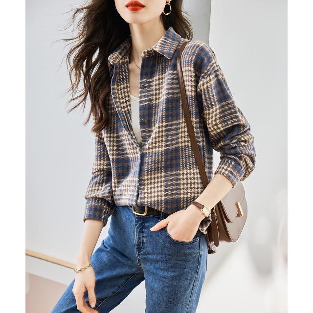MY15884# 新款宽松撞色格子长袖翻领衬衫女复古磨毛外套女裝貨源服裝批發