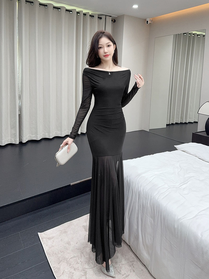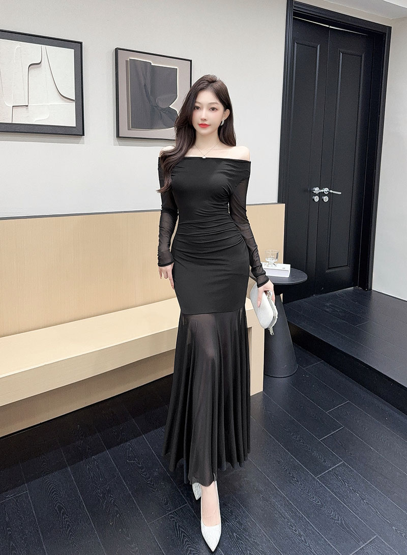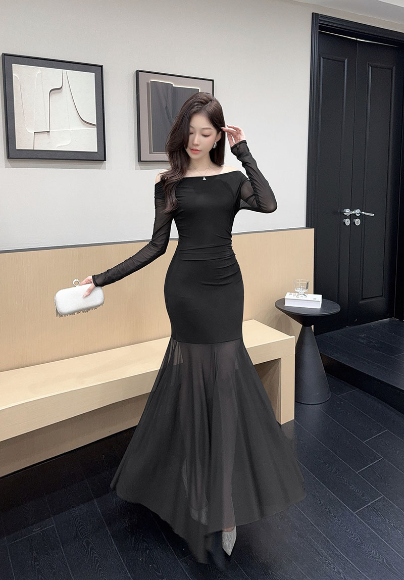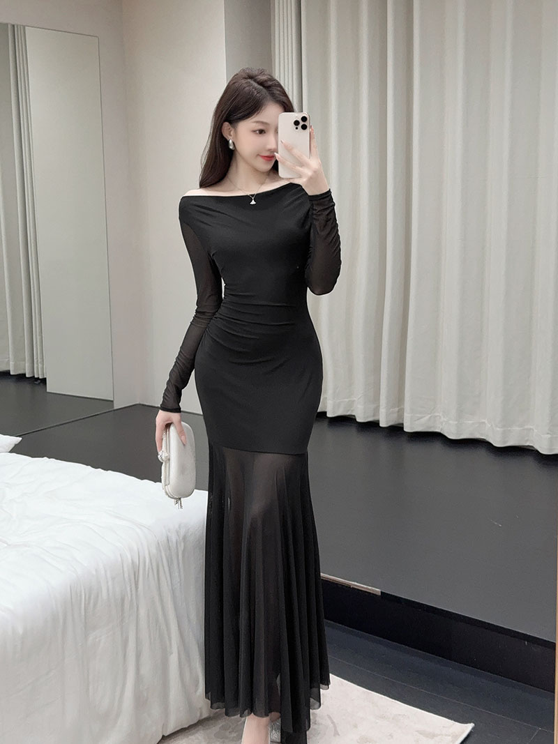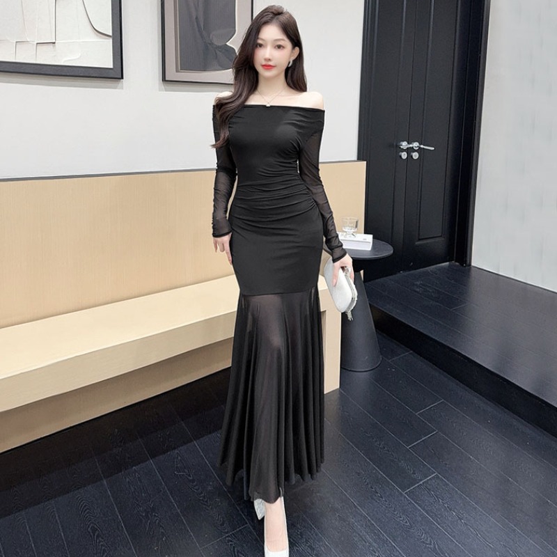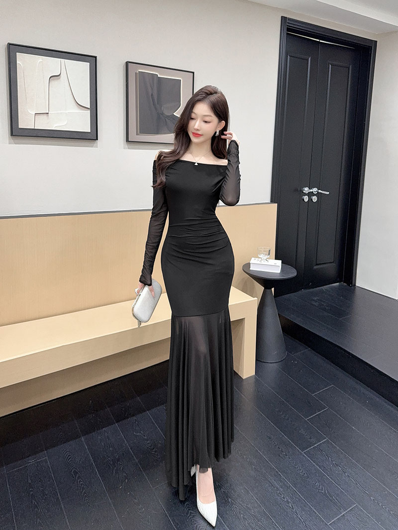 MY15888# 设计感露肩长袖小黑裙女收腰显瘦网纱拼接鱼尾裙约会派对长裙女裝貨源服裝批發