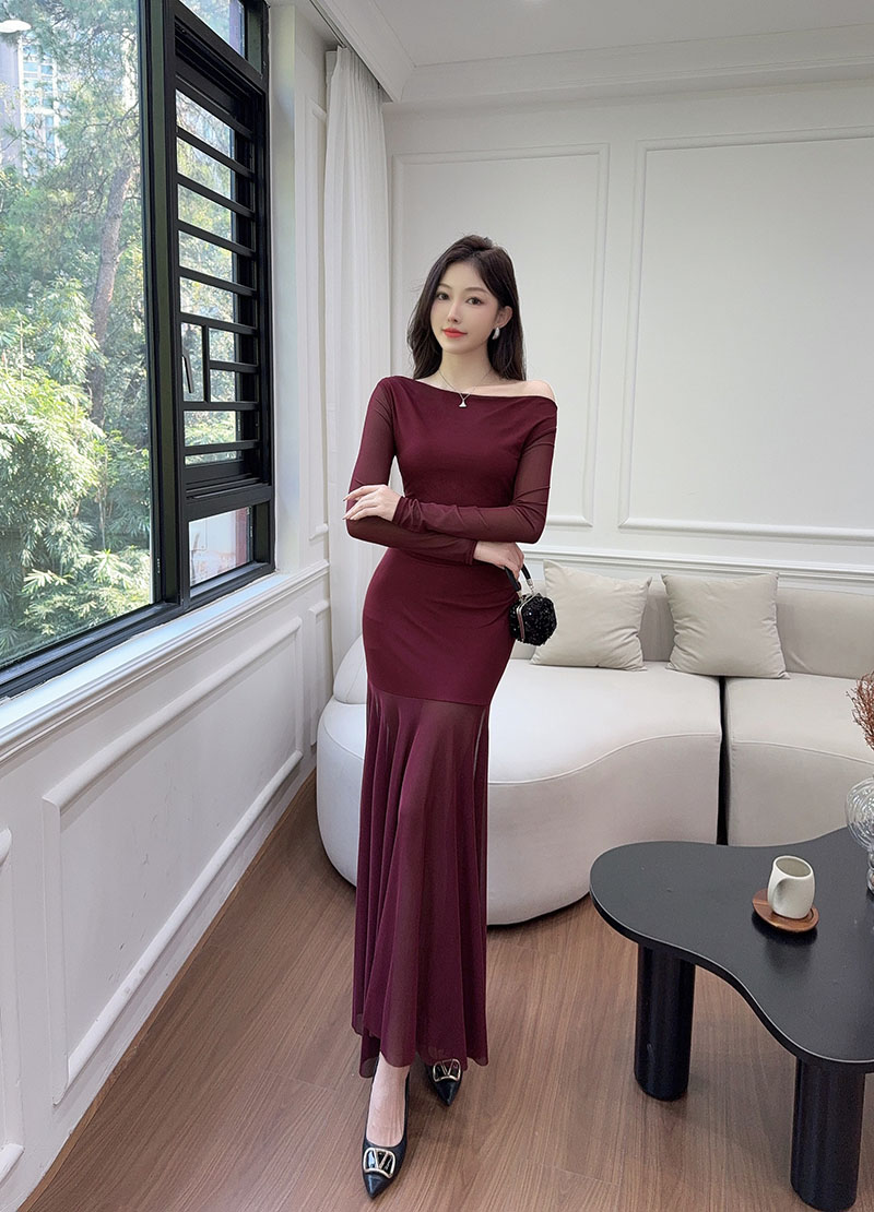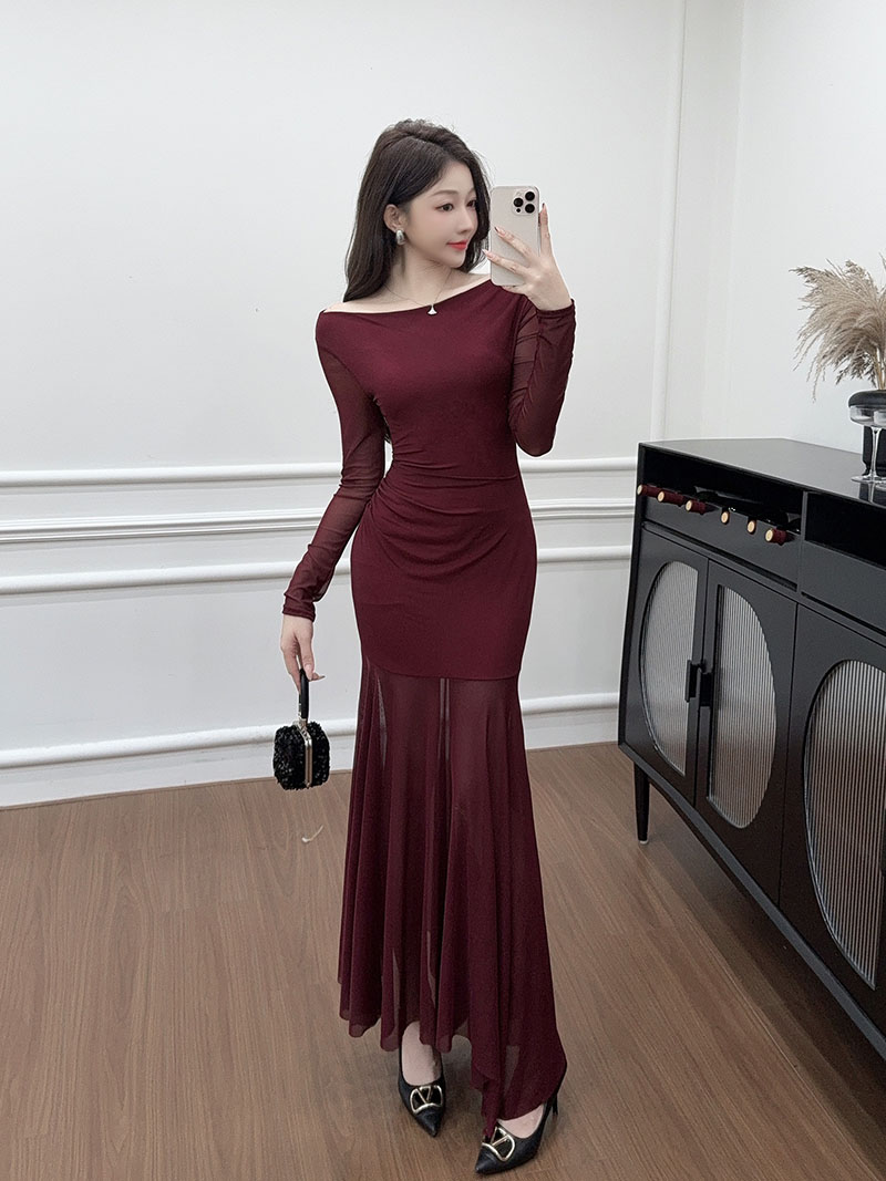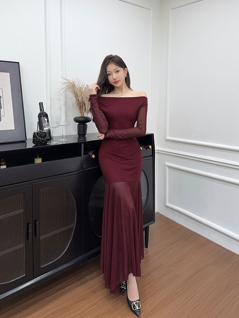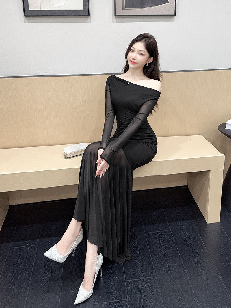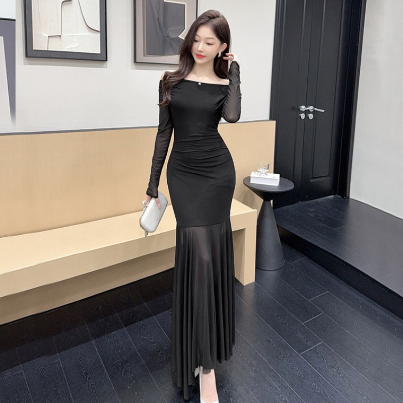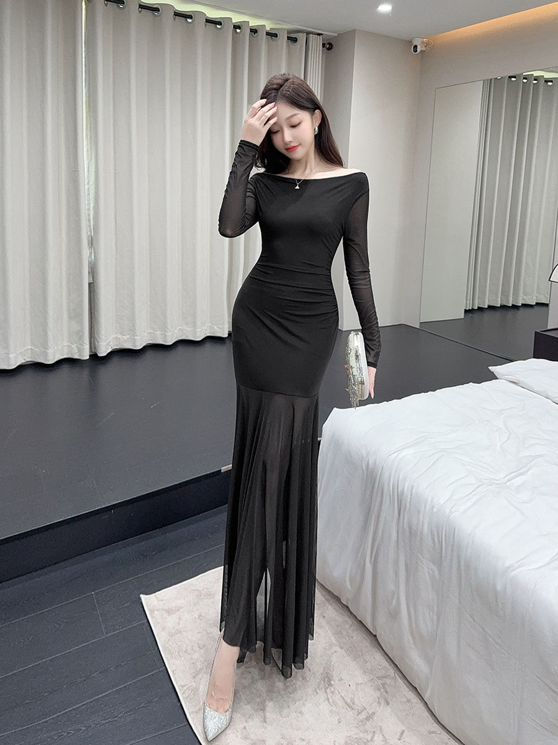 MY15888# 设计感露肩长袖小黑裙女收腰显瘦网纱拼接鱼尾裙约会派对长裙女裝貨源服裝批發