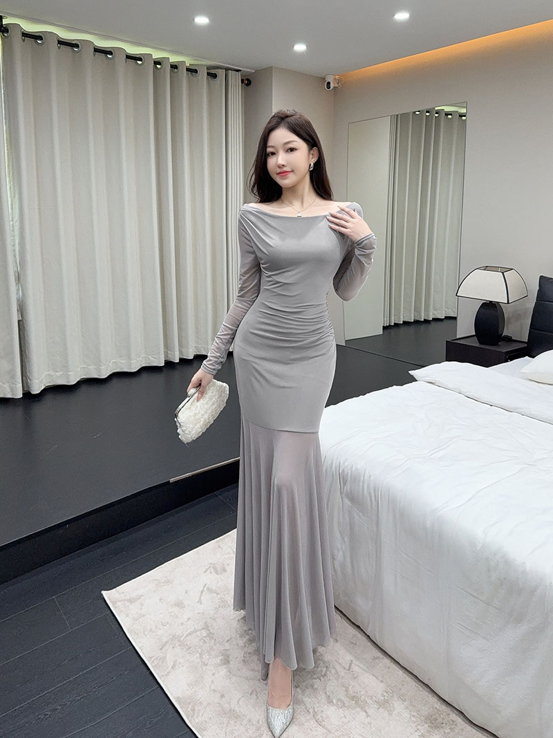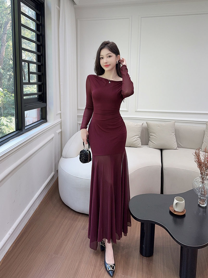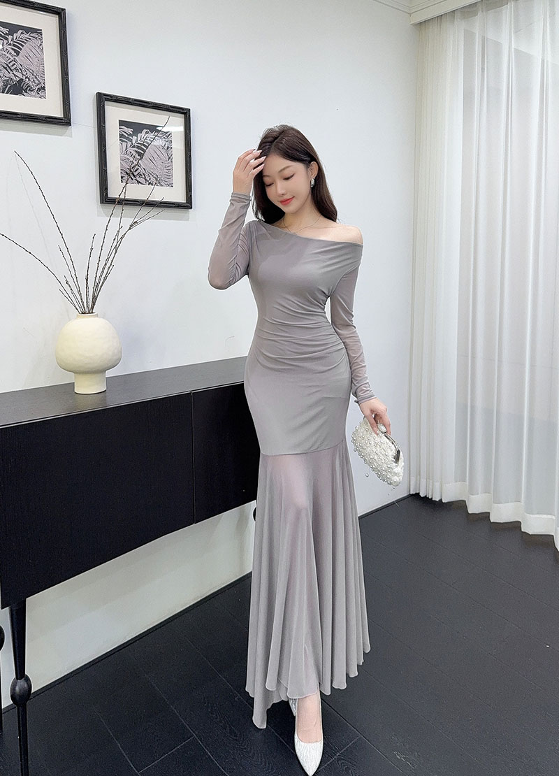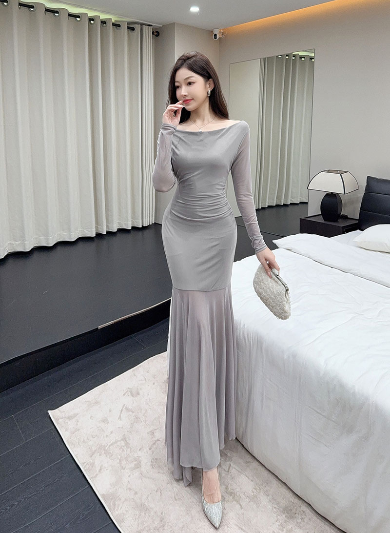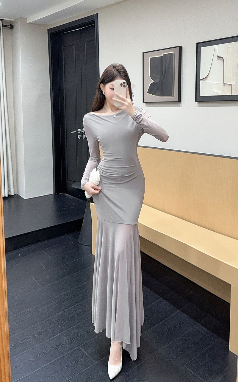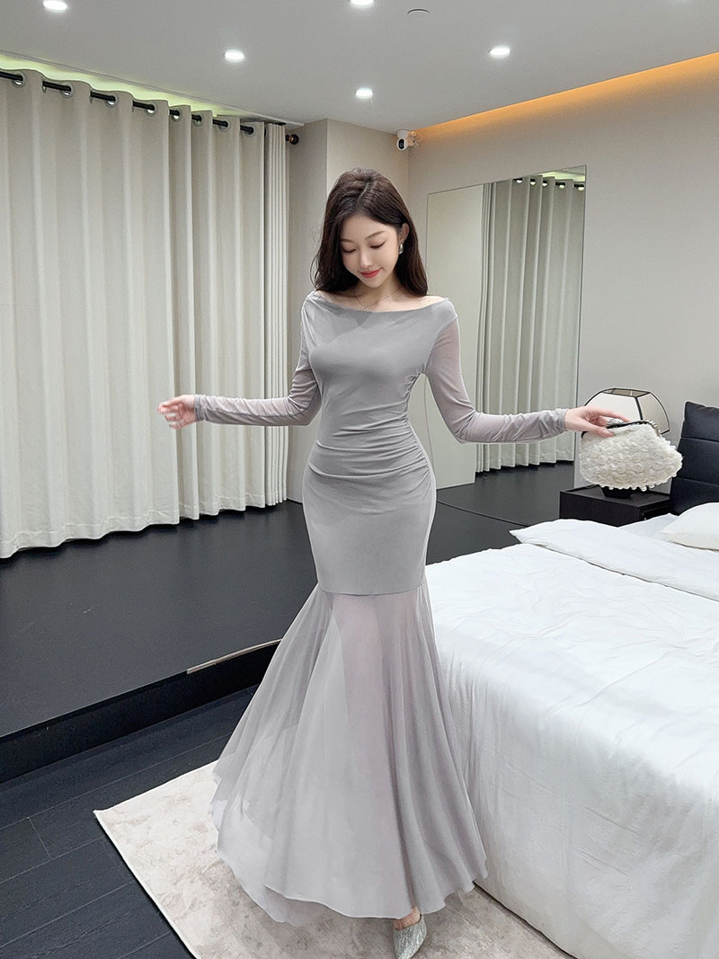 MY15888# 设计感露肩长袖小黑裙女收腰显瘦网纱拼接鱼尾裙约会派对长裙女裝貨源服裝批發