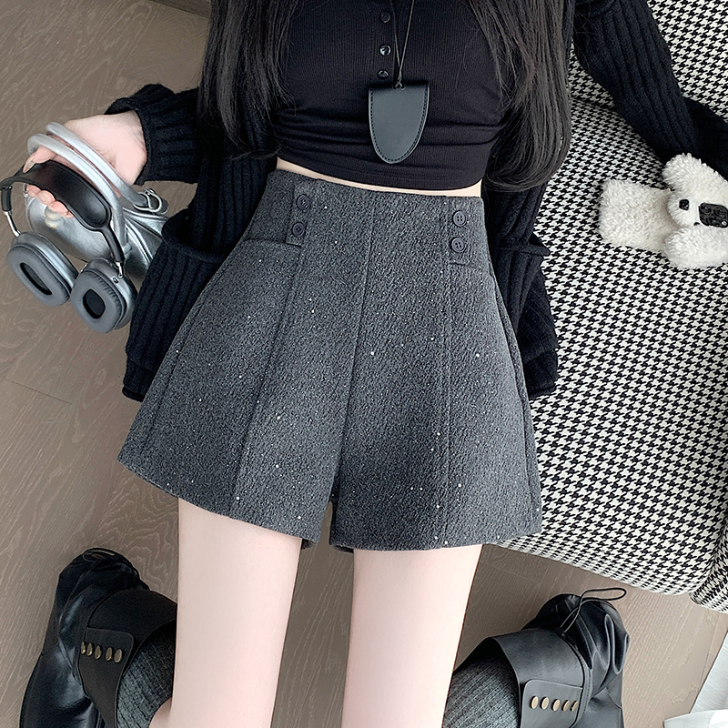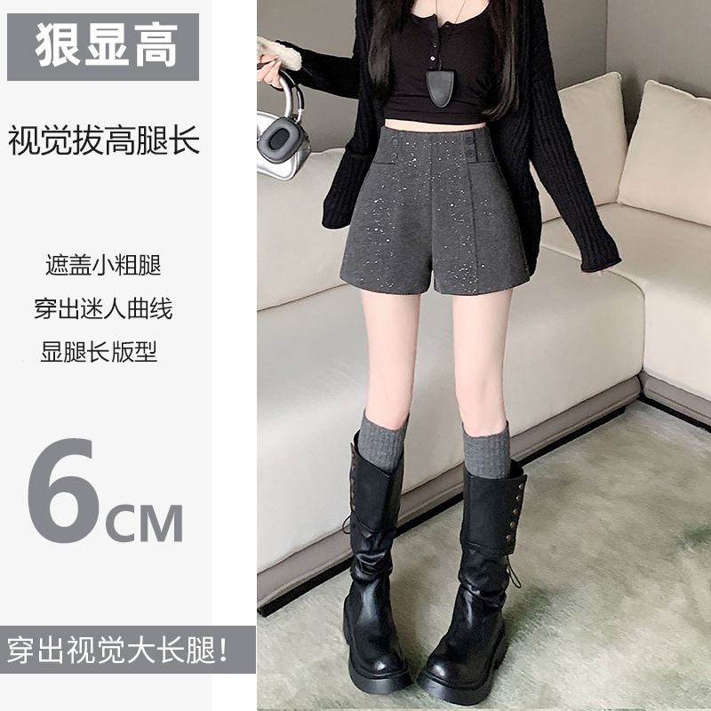 MY15979# 灰色高腰闪亮a字毛呢阔腿短裤新款休闲显瘦女士靴裤子女裝貨源服裝批發